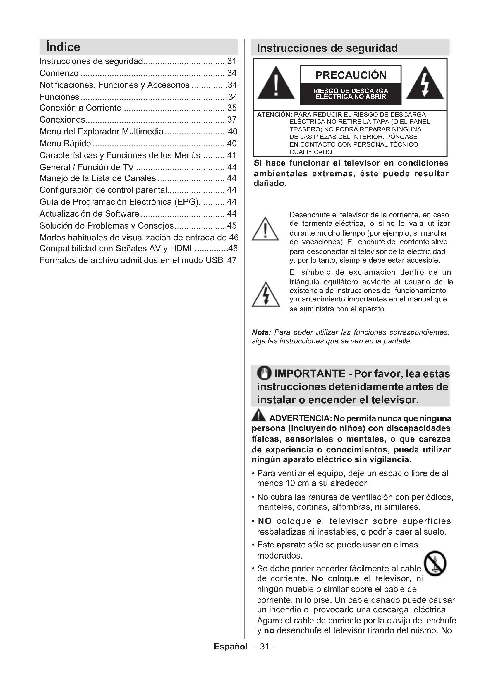 - Modos habituales de visualización de entrada de 46 Compatibilidad con Señales AV y HDMI Formatos de archivo admitidos en el modo USB .47 IMPORTANTE - Por favor, lea estas instrucciones detenidamente antes de instalar o encender el televisor. ADVERTENCIA: No permita nunca que ninguna persona (incluyendo niños) con discapacidades físicas, sensoriales o mentales, o que carezca de experiencia o conocimientos, pueda utilizar ningún aparato eléctrico sin vigilancia. p. 46