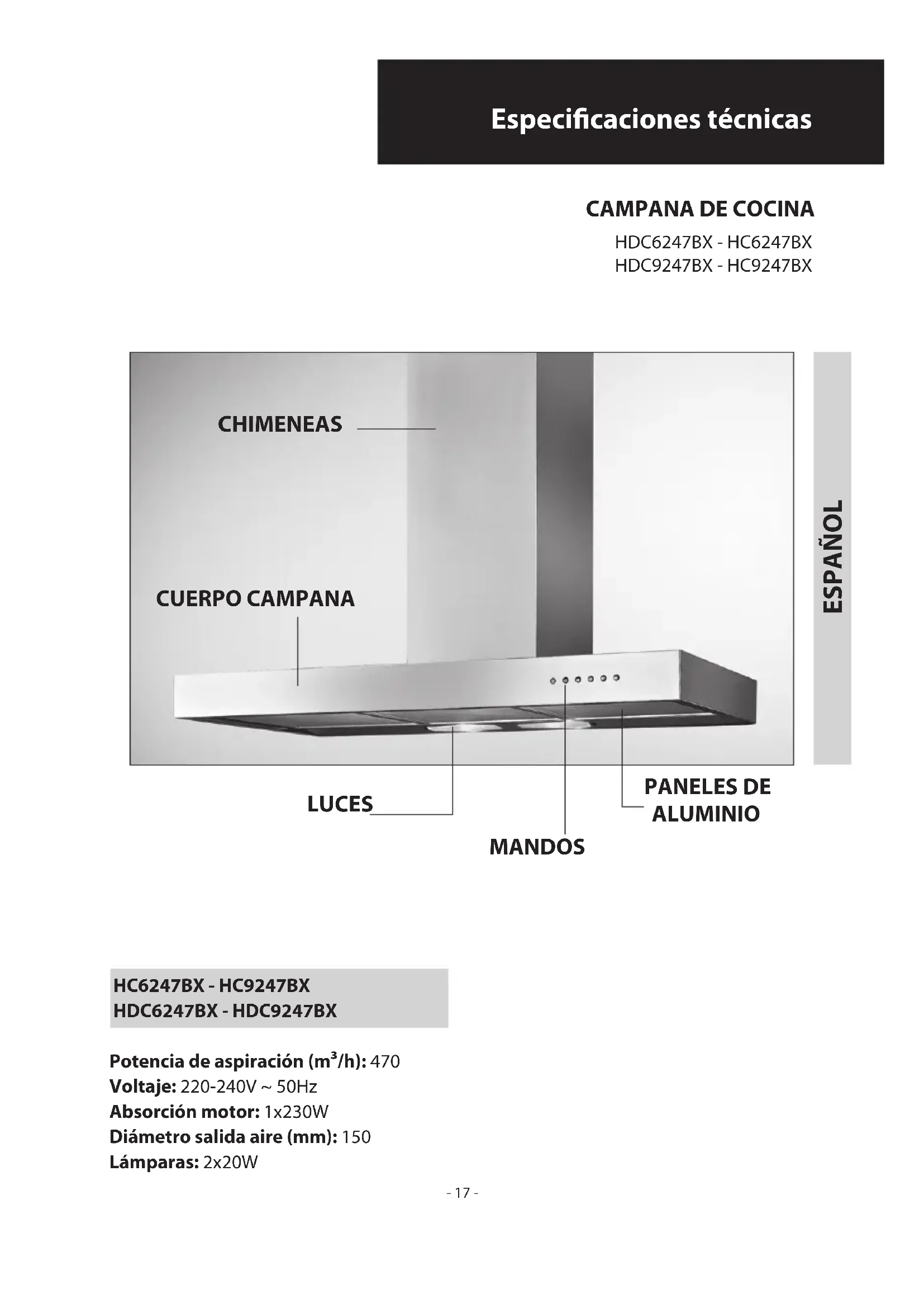 ESPAÑOL CHIMENEAS CUERPO CAMPANA MANDOS PANELES DE ALUMINIO ILUMINACIÓN VIDRIO Potencia de aspiración (m³/h): 470 Voltaje: 220-240V ~ 50Hz Absorción motor: 1x230W Diámetro salida aire (mm): 150 Lámparas: 2x20W Potencia de aspiración (m³/h): 900 Voltaje: 220-240V ~ 50Hz Absorción motor: 1x250W Diámetro salida aire (mm): 150 Lámparas: 2x20W- 16 - HC6147BX - HC9147BX