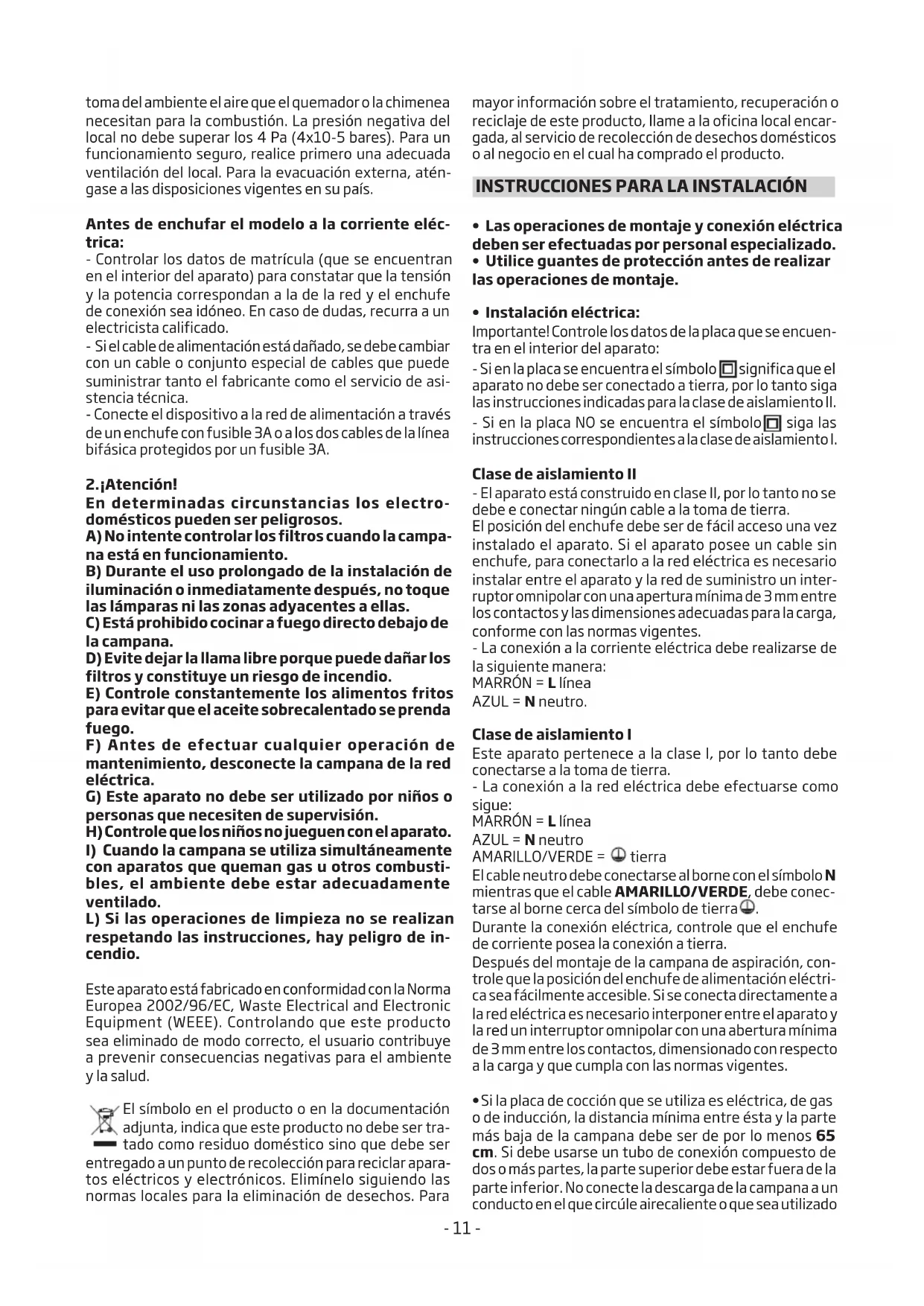 - Instalacióneléctrica: Importante! Controle los datos de la placa que se encuen- tra en el interior del aparato: - Si en la placa se encuentra el símbolo significa que el aparato no debe ser conectado a tierra, por lo tanto siga las instrucciones indicadas para la clase de aislamiento II. - Si en la placa NO se encuentra el símbolo siga las instrucciones correspondientes a la clase de aislamiento I. Clase de aislamiento II - El aparato está construido en clase II, por lo tanto no se debe e conectar ningún cable a la toma de tierra. El posición del enchufe debe ser de fácil acceso una vez instalado el aparato. Si el aparato posee un cable sin enchufe, para conectarlo a la red eléctrica es necesario instalar entre el aparato y la red de suministro un inter- ruptor omnipolar con una apertura mínima de 3 mm entre los contactos y las dimensiones adecuadas para la carga, conforme con las normas vigentes. - La conexión a la corriente eléctrica debe realizarse de la siguiente manera: MARRÓN = L línea AZUL = N neutro. Clase de aislamiento I Este aparato pertenece a la clase I, por lo tanto debe conectarse a la toma de tierra. - La conexión a la red eléctrica debe efectuarse como sigue: MARRÓN = L línea AZUL = N neutro AMARILLO/VERDE = tierra El cable neutro debe conectarse al borne con el símbolo N mientras que el cable AMARILLO/VERDE, debe conec- tarse al borne cerca del símbolo de tierra