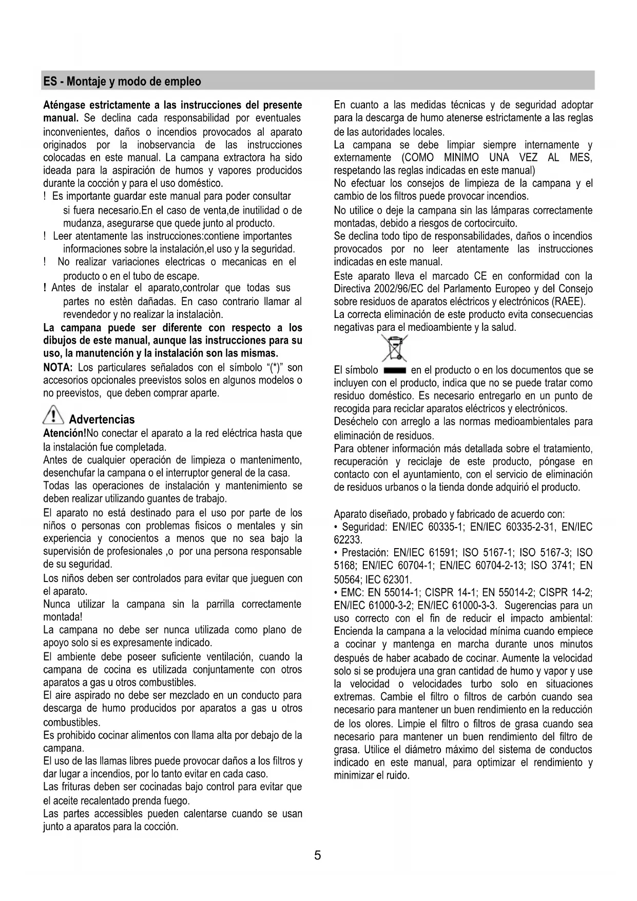 ES Montaje y modo de empleo PT Instruções para montagem e utilização DE Montage- und Gebrauchsanweisung EN Instruction on mounting and use FR Prescriptions de montage et mode d’emploi IT Istruzioni di montaggio e d'uso NL Montagevoorschriften en gebruiksaanwijzingen RU Инструкции по монтажу и эксплуатации5 ES - Montaje y modo de empleo Aténgase estrictamente a las instrucciones del presente manual. Se declina cada responsabilidad por eventuales inconvenientes, daños o incendios provocados al aparato originados por la inobservancia de las instrucciones colocadas en este manual. La campana extractora ha sido ideada para la aspiración de humos y vapores producidos durante la cocción y para el uso doméstico. ! Es importante guardar este manual para poder consultar si fuera necesario.En el caso de venta,de inutilidad o de mudanza, asegurarse que quede junto al producto. ! Leer atentamente las instrucciones:contiene importantes informaciones sobre la instalación,el uso y la seguridad. ! No realizar variaciones electricas o mecanicas en el producto o en el tubo de escape. ! Antes de instalar el aparato,controlar que todas sus partes no estèn dañadas. En caso contrario llamar al revendedor y no realizar la instalaciòn. La campana puede ser diferente con respecto a los dibujos de este manual, aunque las instrucciones para su uso, la manutención y la instalación son las mismas. NOTA: Los particulares señalados con el símbolo “(*)” son accesorios opcionales preevistos solos en algunos modelos o no preevistos, que deben comprar aparte. Advertencias Atención!No conectar el aparato a la red eléctrica hasta que la instalación fue completada. Antes de cualquier operación de limpieza o mantenimento, desenchufar la campana o el interruptor general de la casa. Todas las operaciones de instalación y mantenimiento se deben realizar utilizando guantes de trabajo. El aparato no está destinado para el uso por parte de los niños o personas con problemas fisicos o mentales y sin experiencia y conocientos a menos que no sea bajo la supervisión de profesionales ,o por una persona responsable de su seguridad. Los niños deben ser controlados para evitar que jueguen con el aparato. Nunca utilizar la campana sin la parrilla correctamente montada! La campana no debe ser nunca utilizada como plano de apoyo solo si es expresamente indicado. El ambiente debe poseer suficiente ventilación, cuando la campana de cocina es utilizada conjuntamente con otros aparatos a gas u otros combustibles. El aire aspirado no debe ser mezclado en un conducto para descarga de humo producidos por aparatos a gas u otros combustibles. Es prohibido cocinar alimentos con llama alta por debajo de la campana. El uso de las llamas libres puede provocar daños a los filtros y dar lugar a incendios, por lo tanto evitar en cada caso. Las frituras deben ser cocinadas bajo control para evitar que el aceite recalentado prenda fuego. Las partes accessibles pueden calentarse cuando se usan junto a aparatos para la cocción. En cuanto a las medidas técnicas y de seguridad adoptar para la descarga de humo atenerse estrictamente a las reglas de las autoridades locales. La campana se debe limpiar siempre internamente y externamente (COMO MINIMO UNA VEZ AL MES, respetando las reglas indicadas en este manual) No efectuar los consejos de limpieza de la campana y el cambio de los filtros puede provocar incendios. No utilice o deje la campana sin las lámparas correctamente montadas, debido a riesgos de cortocircuito. Se declina todo tipo de responsabilidades, daños o incendios provocados por no leer atentamente las instrucciones indicadas en este manual. Este aparato lleva el marcado CE en conformidad con la Directiva 2002/96/EC del Parlamento Europeo y del Consejo sobre residuos de aparatos eléctricos y electrónicos (RAEE). La correcta eliminación de este producto evita consecuencias negativas para el medioambiente y la salud. El símbolo en el producto o en los documentos que se incluyen con el producto, indica que no se puede tratar como residuo doméstico. Es necesario entregarlo en un punto de recogida para reciclar aparatos eléctricos y electrónicos. Deséchelo con arreglo a las normas medioambientales para eliminación de residuos. Para obtener información más detallada sobre el tratamiento, recuperación y reciclaje de este producto, póngase en contacto con el ayuntamiento, con el servicio de eliminación de residuos urbanos o la tienda donde adquirió el producto. Aparato diseñado, probado y fabricado de acuerdo con: