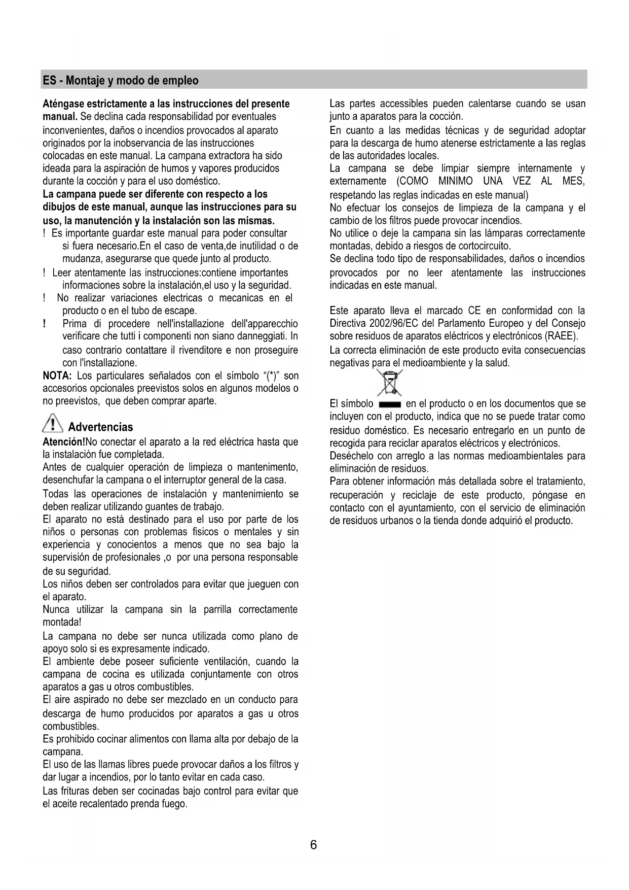 ES Montaje y modo de empleo PT Instruções para montagem e utilização DE Montage- und Gebrauchsanweisung EN Instruction on mounting and use FR Prescriptions de montage et mode d’emploi IT Istruzioni di montaggio e d'uso NL Montagevoorschriften en gebruiksaanwijzingen RU Инструкции по монтажу и эксплуатации6 ES - Montaje y modo de empleo Aténgase estrictamente a las instrucciones del presente manual. Se declina cada responsabilidad por eventuales inconvenientes, daños o incendios provocados al aparato originados por la inobservancia de las instrucciones colocadas en este manual. La campana extractora ha sido ideada para la aspiración de humos y vapores producidos durante la cocción y para el uso doméstico. La campana puede ser diferente con respecto a los dibujos de este manual, aunque las instrucciones para su uso, la manutención y la instalación son las mismas. ! Es importante guardar este manual para poder consultar si fuera necesario.En el caso de venta,de inutilidad o de mudanza, asegurarse que quede junto al producto. ! Leer atentamente las instrucciones:contiene importantes informaciones sobre la instalación,el uso y la seguridad. ! No realizar variaciones electricas o mecanicas en el producto o en el tubo de escape. ! Prima di procedere nell'installazione dell'apparecchio verificare che tutti i componenti non siano danneggiati. In caso contrario contattare il rivenditore e non proseguire con l'installazione. NOTA: Los particulares señalados con el símbolo “(*)” son accesorios opcionales preevistos solos en algunos modelos o no preevistos, que deben comprar aparte. Advertencias Atención!No conectar el aparato a la red eléctrica hasta que la instalación fue completada. Antes de cualquier operación de limpieza o mantenimento, desenchufar la campana o el interruptor general de la casa. Todas las operaciones de instalación y mantenimiento se deben realizar utilizando guantes de trabajo. El aparato no está destinado para el uso por parte de los niños o personas con problemas fisicos o mentales y sin experiencia y conocientos a menos que no sea bajo la supervisión de profesionales ,o por una persona responsable de su seguridad. Los niños deben ser controlados para evitar que jueguen con el aparato. Nunca utilizar la campana sin la parrilla correctamente montada! La campana no debe ser nunca utilizada como plano de apoyo solo si es expresamente indicado. El ambiente debe poseer suficiente ventilación, cuando la campana de cocina es utilizada conjuntamente con otros aparatos a gas u otros combustibles. El aire aspirado no debe ser mezclado en un conducto para descarga de humo producidos por aparatos a gas u otros combustibles. Es prohibido cocinar alimentos con llama alta por debajo de la campana. El uso de las llamas libres puede provocar daños a los filtros y dar lugar a incendios, por lo tanto evitar en cada caso. Las frituras deben ser cocinadas bajo control para evitar que el aceite recalentado prenda fuego. Las partes accessibles pueden calentarse cuando se usan junto a aparatos para la cocción. En cuanto a las medidas técnicas y de seguridad adoptar para la descarga de humo atenerse estrictamente a las reglas de las autoridades locales. La campana se debe limpiar siempre internamente y externamente (COMO MINIMO UNA VEZ AL MES, respetando las reglas indicadas en este manual) No efectuar los consejos de limpieza de la campana y el cambio de los filtros puede provocar incendios. No utilice o deje la campana sin las lámparas correctamente montadas, debido a riesgos de cortocircuito. Se declina todo tipo de responsabilidades, daños o incendios provocados por no leer atentamente las instrucciones indicadas en este manual. Este aparato lleva el marcado CE en conformidad con la Directiva 2002/96/EC del Parlamento Europeo y del Consejo sobre residuos de aparatos eléctricos y electrónicos (RAEE). La correcta eliminación de este producto evita consecuencias negativas para el medioambiente y la salud. El símbolo en el producto o en los documentos que se incluyen con el producto, indica que no se puede tratar como residuo doméstico. Es necesario entregarlo en un punto de recogida para reciclar aparatos eléctricos y electrónicos. Deséchelo con arreglo a las normas medioambientales para eliminación de residuos. Para obtener información más detallada sobre el tratamiento, recuperación y reciclaje de este producto, póngase en contacto con el ayuntamiento, con el servicio de eliminación de residuos urbanos o la tienda donde adquirió el producto.7 Utilización La campana està diseñada para ser utilizada tanto en la forma de extracciòn como para la forma filtrante de interior. Versión aspirante La campana se suministra dotada de una salida de aire superior B para la descarga de los humos hacia el exterior (tubo de descarga y abrazaderas de fijación no suministrados). Conectar la campana en los tubos y en los orificios de escape de pared con diámetro equivalente a la salida del aire (brida de empalme). El uso de tubos u orificios de escape de pared con diámetro inferior, determinará una reducción de los rendimientos de la aspiración y un drástico aumento del ruido. Se declina cada responsabilidad. ¡Cuidado! Si la campana está provista de filtro de carbón, hay que sacarlo. Versión filtrante Si no es posible descargar los humos y los vapores de cocción al exterior, se puede utilizar la campana en versión filtrante montando un filtro de carbones activos y el deflector F en el soporte (brida) G; de esta manera, los humos y los vapores se reciclan a través de la rejilla superior H mediante un tubo de descarga conectado a la salida del aire superior B y el anillo de conexión montado en el deflector F (tubo de descarga y abrazaderas de fijación no suministrados). ¡Cuidado! Si la campana no está dotada de filtro de carbón, hay que pedirlo y montarlo antes del uso. Los modelos sin motor de aspiración solament