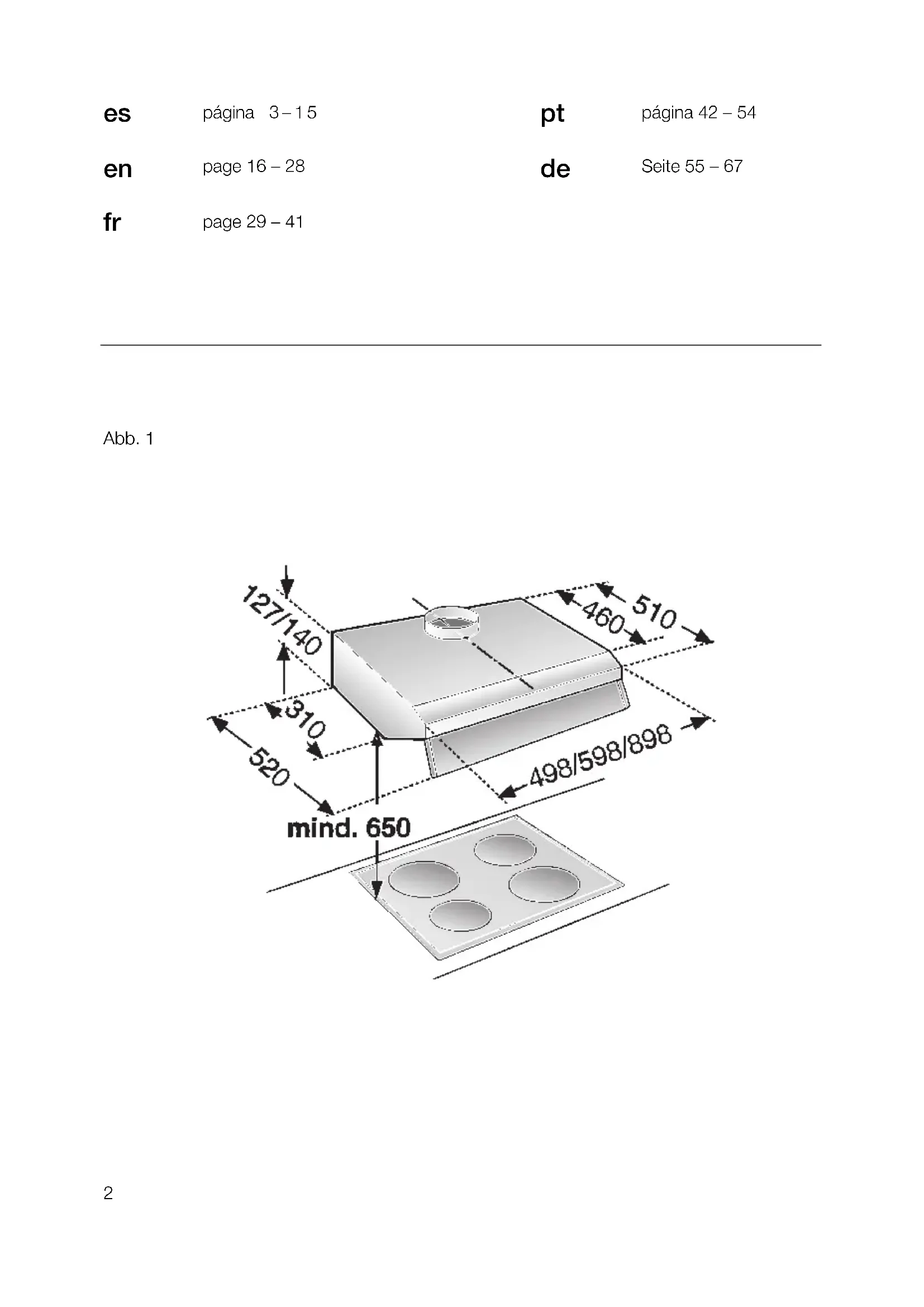 toma de corriente o volver a colocar el fusible. Limpieza y cuidados Desconectar la campana extractora de la red eléctrica extrayendo el cable de conexión de la toma de corriente o a través del fusible. ❑ Al limpiar los filtros antigrasa, limpiar la grasa acumulada en los puntos accesibles del cuerpo de la campana extractora. De este modo se previene el peligro de que se inflamen los restos de grasa antiguos y la campana conserva óptimo funcionamiento. ❑ Utilizar una solución de agua y agente lavavajillas de uso corriente caliente para limpiar la campana extractora. ❑ En caso de suciedad más resistente y fuertemente acumulada, utilizar un agente limpiacristales suave. ❑ No rascar la suciedad reseca acumulada. Reblandézcala primero aplicando sobre la misma un paño húmedo. No utilizar agentes o esponjas abrasivos. ❑ Atención: No limpiar las superficies y elementos de plástico con alcohol de quemar, dado que podrían producirse zonas o puntos de color mate. Atención: Procurar una buena ventilación de la cocina. ¡No trabajar con llamas abiertas! Limpiar el mando desplazable del ventilador sólo con un paño suave y húmedo (usar una solución de agua y agente lavavajillas suave). ¡No usar limpiadores de acero para limpiar el mando desplazable! Superficies de acero inoxidable: ❑ Usar un limpiador para acero inoxidable suave, no abrasivo. ❑ Limpiar el metal sólo en dirección al pulido. ¡No limpiar las superficies de acero inoxidable con esponjas abrasivas! ¡No emplear detergentes que contengan arena, sosa, ácidos o cloruro! Superficies de aluminio y plástico: ❑ Utilizar sólo paños suaves para limpieza de ventanas, libres de pelusas o paños de microfibra. ❑ No utilizar paños secos. ❑ Utilizar un agente limpiacristales suave. ❑ No utilizar agentes limpiadores agresivos que contengan ácidos o álcalis. ❑ No utilizar agentes frotadores. Averías y perturbaciones En caso de dudas o al producirse averías en la campana extractora, no dude en llamar al Servicio de Asistencia Técnica. (véase al respecto la lista con las delegaciones y distribuidores oficiales). Para cualquier consulta deberá indicarse los números de producto y de fabricación: E-Nr. FD Anote los números correspondientes a su aparato en los espacios previstos a dicho efecto. Los números figuran en la placa de características, a la que se accede tras desmontar el filtro antigrasa metálico, en el interior de la campana extractora.9 Instrucciones de montaje: – Advertencias importantes Esta campana extractora sólo deberá montarse con un lateral junto a un armario o pared alta. Distancia mínima a observar: 50 mm. El montaje de las campanas extracto- ras por encima de una cocina o placa de cocción de gas sólo está permitido si se observa una distancia mínima de 650 mm – Fig. 1 –, y no se superan las siguientes cargas térmicas nominales: