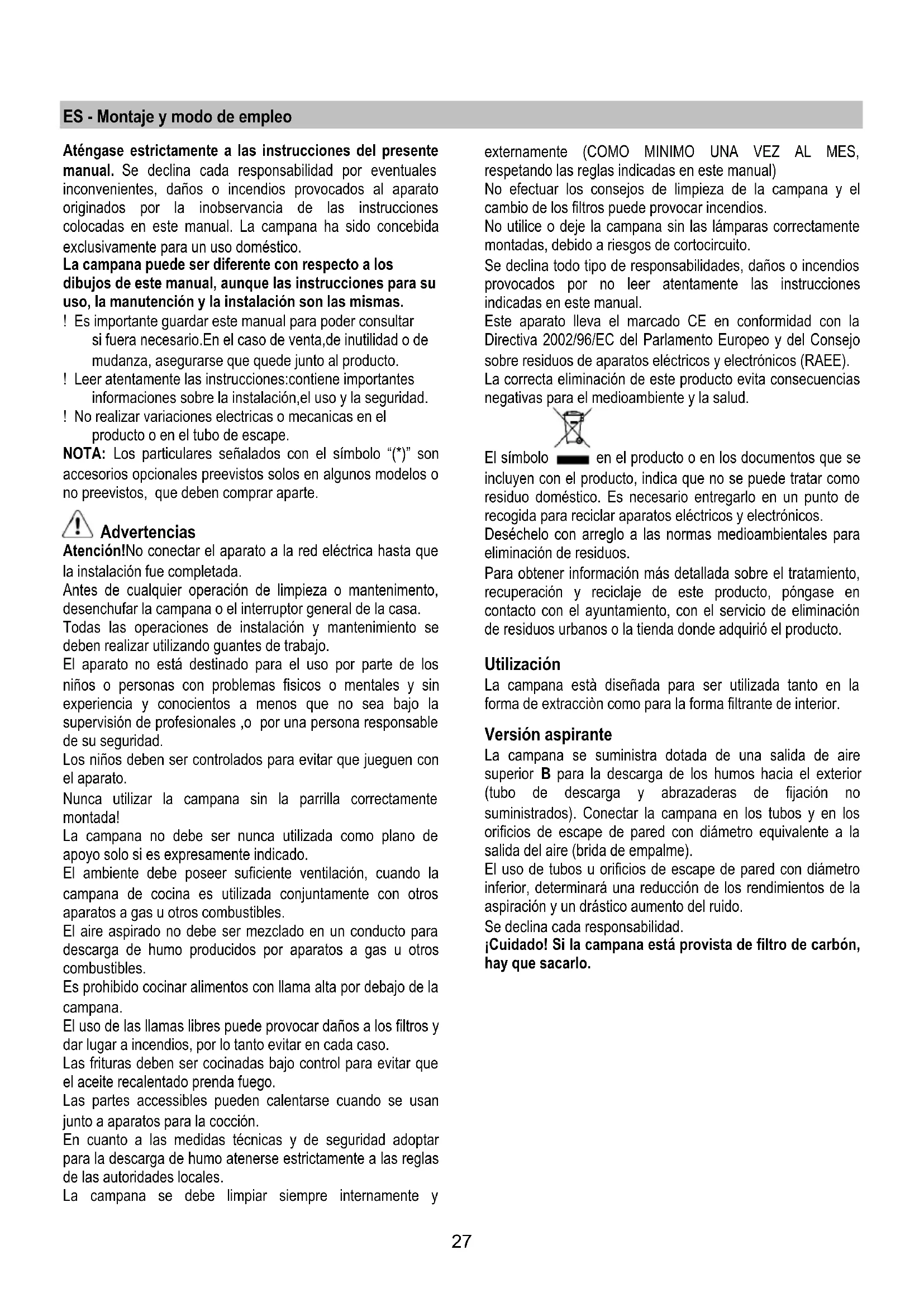 Aténgase estRICTamente a las instruciones del presente manual. Se declina cada responsabilidad por eventuales invenrientes, días o incendios provocados al aparato originados por la inobservancia de las instruciones colocadas en este manual. La campana ha sido concebida exclusivamente para un uso dométrico.