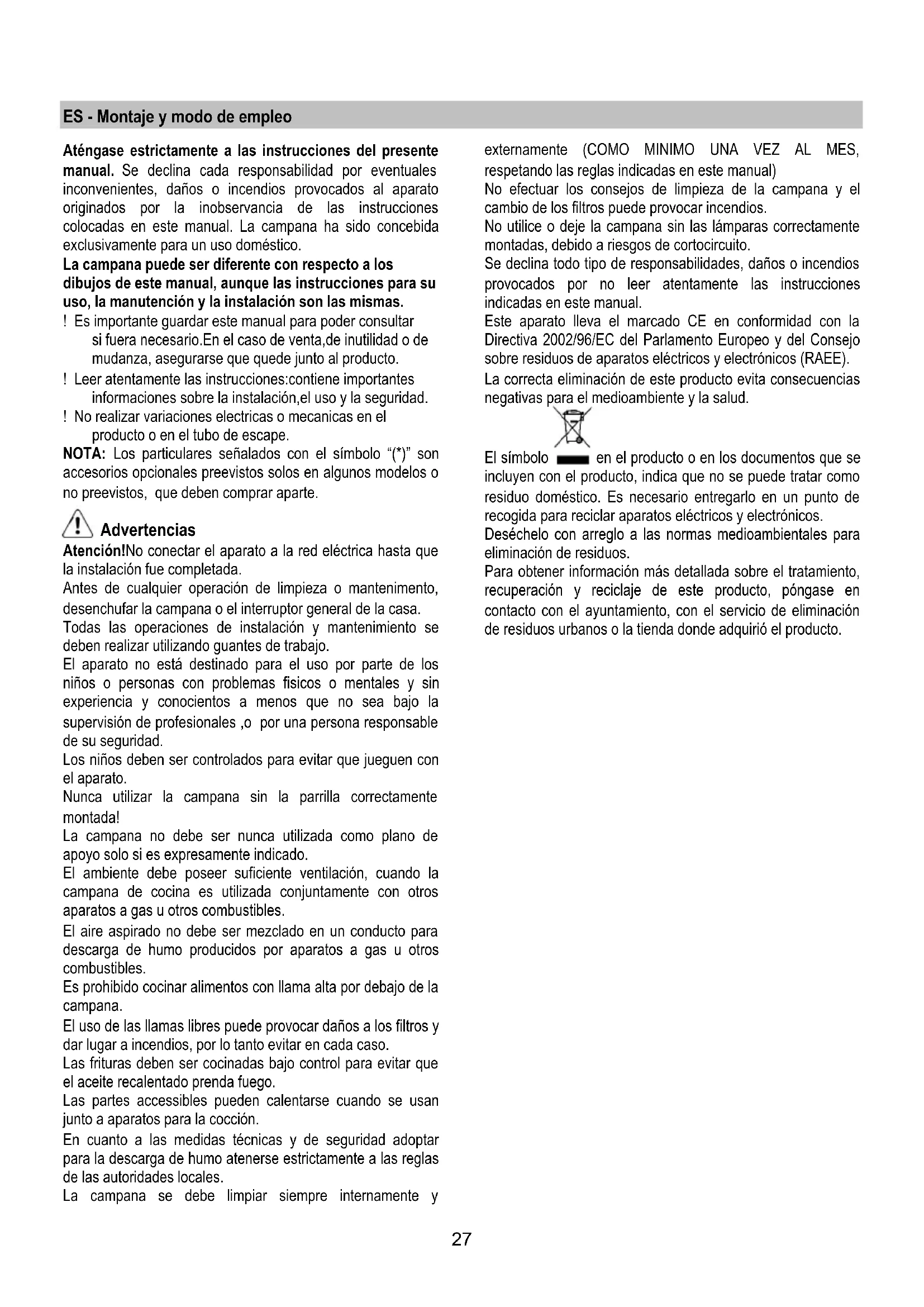 Aténgase estRICTamente a las instruciones del presente manual. Se declina cada responsabilidad por eventuales inconvenrientes, días o incendios provocados al aparato originados por la inobservancia de las instruciones colocadas en este manual. La campana ha sido concedebida exclusivamente para un uso dométrico.
