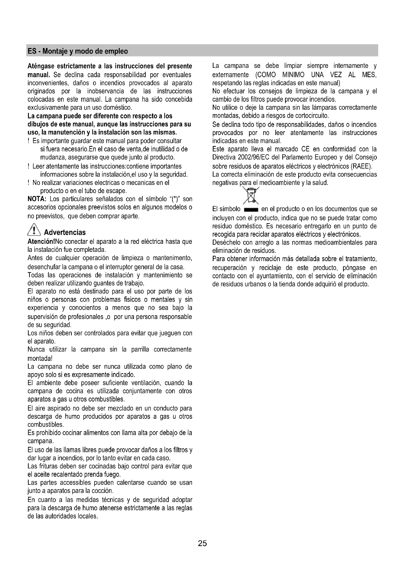 - De vervanging en de montage van het lampje in de tegengestelde volgorde uitvoeren. Als de verlichting niet werkt, controleer dan of de lampjes goed op hun plaats zitten alvorens de assistentiedienst te bellen.25 ES - Montaje y modo de empleo Aténgase estrictamente a las instrucciones del presente manual. Se declina cada responsabilidad por eventuales inconvenientes, daños o incendios provocados al aparato originados por la inobservancia de las instrucciones colocadas en este manual. La campana ha sido concebida exclusivamente para un uso doméstico. La campana puede ser diferente con respecto a los dibujos de este manual, aunque las instrucciones para su uso, la manutención y la instalación son las mismas. ! Es importante guardar este manual para poder consultar si fuera necesario.En el caso de venta,de inutilidad o de mudanza, asegurarse que quede junto al producto. ! Leer atentamente las instrucciones:contiene importantes informaciones sobre la instalación,el uso y la seguridad. ! No realizar variaciones electricas o mecanicas en el producto o en el tubo de escape. NOTA: Los particulares señalados con el símbolo “(*)” son accesorios opcionales preevistos solos en algunos modelos o no preevistos, que deben comprar aparte. Advertencias Atención!No conectar el aparato a la red eléctrica hasta que la instalación fue completada. Antes de cualquier operación de limpieza o mantenimento, desenchufar la campana o el interruptor general de la casa. Todas las operaciones de instalación y mantenimiento se deben realizar utilizando guantes de trabajo. El aparato no está destinado para el uso por parte de los niños o personas con problemas fisicos o mentales y sin experiencia y conocientos a menos que no sea bajo la supervisión de profesionales ,o por una persona responsable de su seguridad. Los niños deben ser controlados para evitar que jueguen con el aparato. Nunca utilizar la campana sin la parrilla correctamente montada! La campana no debe ser nunca utilizada como plano de apoyo solo si es expresamente indicado. El ambiente debe poseer suficiente ventilación, cuando la campana de cocina es utilizada conjuntamente con otros aparatos a gas u otros combustibles. El aire aspirado no debe ser mezclado en un conducto para descarga de humo producidos por aparatos a gas u otros combustibles. Es prohibido cocinar alimentos con llama alta por debajo de la campana. El uso de las llamas libres puede provocar daños a los filtros y dar lugar a incendios, por lo tanto evitar en cada caso. Las frituras deben ser cocinadas bajo control para evitar que el aceite recalentado prenda fuego. Las partes accessibles pueden calentarse cuando se usan junto a aparatos para la cocción. En cuanto a las medidas técnicas y de seguridad adoptar para la descarga de humo atenerse estrictamente a las reglas de las autoridades locales. La campana se debe limpiar siempre internamente y externamente (COMO MINIMO UNA VEZ AL MES, respetando las reglas indicadas en este manual) No efectuar los consejos de limpieza de la campana y el cambio de los filtros puede provocar incendios. No utilice o deje la campana sin las lámparas correctamente montadas, debido a riesgos de cortocircuito. Se declina todo tipo de responsabilidades, daños o incendios provocados por no leer atentamente las instrucciones indicadas en este manual. Este aparato lleva el marcado CE en conformidad con la Directiva 2002/96/EC del Parlamento Europeo y del Consejo sobre residuos de aparatos eléctricos y electrónicos (RAEE). La correcta eliminación de este producto evita consecuencias negativas para el medioambiente y la salud. El símbolo en el producto o en los documentos que se incluyen con el producto, indica que no se puede tratar como residuo doméstico. Es necesario entregarlo en un punto de recogida para reciclar aparatos eléctricos y electrónicos. Deséchelo con arreglo a las normas medioambientales para eliminación de residuos. Para obtener información más detallada sobre el tratamiento, recuperación y reciclaje de este producto, póngase en contacto con el ayuntamiento, con el servicio de eliminación de residuos urbanos o la tienda donde adquirió el producto.26 Utilización La campana està diseñada para ser utilizada tanto en la forma de extracciòn como para la forma filtrante de interior. Versión aspirante El vapor viene evacuado hacia el externo a traves de un tubo de escape introducido en el laro de sujeccion que se encuntra arriba de la campana. El diametro del tubo de escape debe ser igual al diametro del aro de sujección. En la parte horizontal, el tubo debe tener una ligera inclinación hacia el alto Conectar la campana en los tubos y en los orificios de escape de pared con diámetro equivalente a la salida del aire (brida de empalme). El uso de tubos u orificios de escape de pared con diámetro inferior, determinará una reducción de los rendimientos de la aspiración y un drástico aumento del ruido. Se declina cada responsabilidad. ! Utilice un conducto cuya longitud sea la mínima indispensable. ! Utilice un conducto con el menor número posible de curvas (ángulo máximo de la curva: 90°). ! Evite los cambios drásticos en la sección del conducto ! Utilice un conducto cuyo interior sea lo más liso posible. ! El material del conducto debe estar aprobado de conformidad con las normativas. Versión filtrante Se debe utilizar un filtro de carbón activo, disponible del vuestro proveedor.El aire aspirado viene reciclado antes de expulsarlo en el ambiente a través de la parrilla superior.