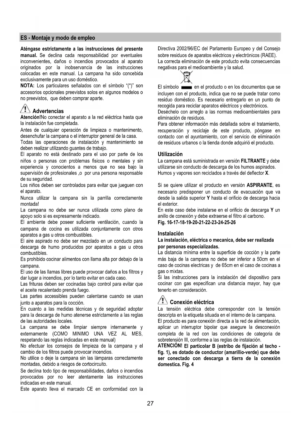 Enkele modellen zijn tevens voorzien van zijlampen: Vervang de lampen met andere lampen met dezelfde eigenschapen max 40W (E14). Om de lampehouder te bereiken verwijder de afdekking A. Als de verlichting niet werkt, controleer dan of de lampjes goed op hun plaats zitten alvorens de assistentiedienst te bellen.27 ES - Montaje y modo de empleo Aténgase estrictamente a las instrucciones del presente manual. Se declina cada responsabilidad por eventuales inconvenientes, daños o incendios provocados al aparato originados por la inobservancia de las instrucciones colocadas en este manual. La campana ha sido concebida exclusivamente para un uso doméstico. NOTA: Los particulares señalados con el símbolo “(*)” son accesorios opcionales preevistos solos en algunos modelos o no preevistos, que deben comprar aparte. Advertencias Atención!No conectar el aparato a la red eléctrica hasta que la instalación fue completada. Antes de cualquier operación de limpieza o mantenimento, desenchufar la campana o el interruptor general de la casa. Todas las operaciones de instalación y mantenimiento se deben realizar utilizando guantes de trabajo. El aparato no está destinado para el uso por parte de los niños o personas con problemas fisicos o mentales y sin experiencia y conocientos a menos que no sea bajo la supervisión de profesionales ,o por una persona responsable de su seguridad. Los niños deben ser controlados para evitar que jueguen con el aparato. Nunca utilizar la campana sin la parrilla correctamente montada! La campana no debe ser nunca utilizada como plano de apoyo solo si es expresamente indicado. El ambiente debe poseer suficiente ventilación, cuando la campana de cocina es utilizada conjuntamente con otros aparatos a gas u otros combustibles. El aire aspirado no debe ser mezclado en un conducto para descarga de humo producidos por aparatos a gas u otros combustibles. Es prohibido cocinar alimentos con llama alta por debajo de la campana. El uso de las llamas libres puede provocar daños a los filtros y dar lugar a incendios, por lo tanto evitar en cada caso. Las frituras deben ser cocinadas bajo control para evitar que el aceite recalentado prenda fuego. Las partes accessibles pueden calentarse cuando se usan junto a aparatos para la cocción. En cuanto a las medidas técnicas y de seguridad adoptar para la descarga de humo atenerse estrictamente a las reglas de las autoridades locales. La campana se debe limpiar siempre internamente y externamente (COMO MINIMO UNA VEZ AL MES, respetando las reglas indicadas en este manual) No efectuar los consejos de limpieza de la campana y el cambio de los filtros puede provocar incendios. No utilice o deje la campana sin las lámparas correctamente montadas, debido a riesgos de cortocircuito. Se declina todo tipo de responsabilidades, daños o incendios provocados por no leer atentamente las instrucciones indicadas en este manual. Este aparato lleva el marcado CE en conformidad con la Directiva 2002/96/EC del Parlamento Europeo y del Consejo sobre residuos de aparatos eléctricos y electrónicos (RAEE). La correcta eliminación de este producto evita consecuencias negativas para el medioambiente y la salud. El símbolo en el producto o en los documentos que se incluyen con el producto, indica que no se puede tratar como residuo doméstico. Es necesario entregarlo en un punto de recogida para reciclar aparatos eléctricos y electrónicos. Deséchelo con arreglo a las normas medioambientales para eliminación de residuos. Para obtener información más detallada sobre el tratamiento, recuperación y reciclaje de este producto, póngase en contacto con el ayuntamiento, con el servicio de eliminación de residuos urbanos o la tienda donde adquirió el producto. Utilización La campana está suministrada en versión FILTRANTE y debe utilizarse sin conducto de descarga de los humos aspirados. Humos y vapores son reciclados a través del deflector X. Si se quiere utilizar el producto en versión ASPIRANTE, es necesario predisponer un conducto de evacuación que va desde la salida superior Y hasta el orificio de descarga hacia el exterior. En este caso debe instalarse en el orificio de descarga Y un anillo de conexión y debe extraerse el filtro al carbono. Fig. 16-17-18-19-20-21-22-23-24-25-26 Instalación La instalación, eléctrica o mecanica, debe ser realizada por personas especializadas. La distancia mínima entre la superficie de cocción y la parte más baja de la campana no debe ser inferior a 50cm en el caso de cocinas electricas y de 65cm en el caso de cocinas a gas o mixtas. Si las instrucciones para la instalación del dispositivo para cocinar con gas especifican una distancia mayor, hay que tenerlo en consideración. Conexión eléctrica La tensión eléctrica debe corresponder con la tensión descripta en la etiqueta situada en el interno de la campana. El producto es para conexión directa a la red de alimentación, aplicar un interruptor bipolar que asegure la desconexión completa de la red con las condiciones de categoria de sobretensión III, conforme a las reglas de instalación. ATENCIÓN! El particolar B (estribo de fijación al techo - fig. 1), es dotado de conductor (amarillio-verde) que debe ser conectado con descarga a tierra de la conexión domestica. Fig. 428 ATENCIÓN! Prestar atención a la posición del cable en exceso, no observar las indicaciones pueden provocar graves daños al aparato y/o shock eléctrico a las personas.Para mayor informaciones ver Fig. 8-15 Atención! La sustitución del cable para la interconexión debe ser realizada por el servicio de asistencia técnica autorizada. Montaje La campana está dotada con tacos de fijación adecuados a la mayor parte de paredes/techos. De cualquier modo, conviene consultar a un técnico calificado para tener la certeza de que los materiales son adecuados a su parede/techo. La/El pared/techo debe ser lo suficientemente fuerte para sostener el peso de la campana.
