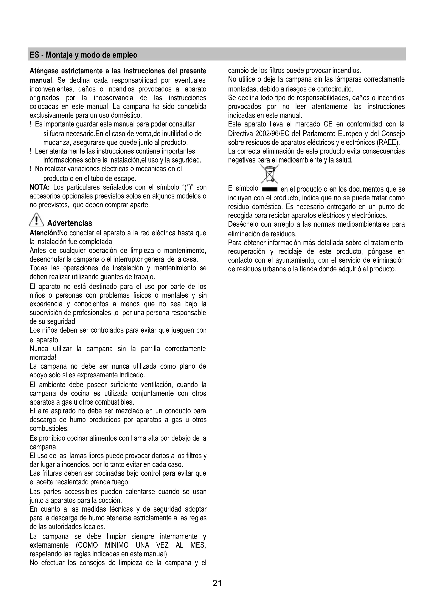 Dans l’éventualité où l’éclairage ne devait pas fonctionner, vérifier si les lampes ont été introduites correctement dans leur logement, avant de contacter le service après-vente.21 ES - Montaje y modo de empleo Aténgase estrictamente a las instrucciones del presente manual. Se declina cada responsabilidad por eventuales inconvenientes, daños o incendios provocados al aparato originados por la inobservancia de las instrucciones colocadas en este manual. La campana ha sido concebida exclusivamente para un uso doméstico. ! Es importante guardar este manual para poder consultar si fuera necesario.En el caso de venta,de inutilidad o de mudanza, asegurarse que quede junto al producto. ! Leer atentamente las instrucciones:contiene importantes informaciones sobre la instalación,el uso y la seguridad. ! No realizar variaciones electricas o mecanicas en el producto o en el tubo de escape. NOTA: Los particulares señalados con el símbolo “(*)” son accesorios opcionales preevistos solos en algunos modelos o no preevistos, que deben comprar aparte. Advertencias Atención!No conectar el aparato a la red eléctrica hasta que la instalación fue completada. Antes de cualquier operación de limpieza o mantenimento, desenchufar la campana o el interruptor general de la casa. Todas las operaciones de instalación y mantenimiento se deben realizar utilizando guantes de trabajo. El aparato no está destinado para el uso por parte de los niños o personas con problemas fisicos o mentales y sin experiencia y conocientos a menos que no sea bajo la supervisión de profesionales ,o por una persona responsable de su seguridad. Los niños deben ser controlados para evitar que jueguen con el aparato. Nunca utilizar la campana sin la parrilla correctamente montada! La campana no debe ser nunca utilizada como plano de apoyo solo si es expresamente indicado. El ambiente debe poseer suficiente ventilación, cuando la campana de cocina es utilizada conjuntamente con otros aparatos a gas u otros combustibles. El aire aspirado no debe ser mezclado en un conducto para descarga de humo producidos por aparatos a gas u otros combustibles. Es prohibido cocinar alimentos con llama alta por debajo de la campana. El uso de las llamas libres puede provocar daños a los filtros y dar lugar a incendios, por lo tanto evitar en cada caso. Las frituras deben ser cocinadas bajo control para evitar que el aceite recalentado prenda fuego. Las partes accessibles pueden calentarse cuando se usan junto a aparatos para la cocción. En cuanto a las medidas técnicas y de seguridad adoptar para la descarga de humo atenerse estrictamente a las reglas de las autoridades locales. La campana se debe limpiar siempre internamente y externamente (COMO MINIMO UNA VEZ AL MES, respetando las reglas indicadas en este manual) No efectuar los consejos de limpieza de la campana y el cambio de los filtros puede provocar incendios. No utilice o deje la campana sin las lámparas correctamente montadas, debido a riesgos de cortocircuito. Se declina todo tipo de responsabilidades, daños o incendios provocados por no leer atentamente las instrucciones indicadas en este manual. Este aparato lleva el marcado CE en conformidad con la Directiva 2002/96/EC del Parlamento Europeo y del Consejo sobre residuos de aparatos eléctricos y electrónicos (RAEE). La correcta eliminación de este producto evita consecuencias negativas para el medioambiente y la salud. El símbolo en el producto o en los documentos que se incluyen con el producto, indica que no se puede tratar como residuo doméstico. Es necesario entregarlo en un punto de recogida para reciclar aparatos eléctricos y electrónicos. Deséchelo con arreglo a las normas medioambientales para eliminación de residuos. Para obtener información más detallada sobre el tratamiento, recuperación y reciclaje de este producto, póngase en contacto con el ayuntamiento, con el servicio de eliminación de residuos urbanos o la tienda donde adquirió el producto.22 Utilización La campana està diseñada para ser utilizada tanto en la forma de extracciòn como para la forma filtrante de interior. Versión aspirante El vapor viene evacuado hacia el externo a traves de un tubo de escape introducido en el laro de sujeccion que se encuntra arriba de la campana. El diametro del tubo de escape debe ser igual al diametro del aro de sujección. En la parte horizontal, el tubo debe tener una ligera inclinación hacia el alto Conectar la campana en los tubos y en los orificios de escape de pared con diámetro equivalente a la salida del aire (brida de empalme). El uso de tubos u orificios de escape de pared con diámetro inferior, determinará una reducción de los rendimientos de la aspiración y un drástico aumento del ruido. Se declina cada responsabilidad. ! Utilice un conducto cuya longitud sea la mínima indispensable. ! Utilice un conducto con el menor número posible de curvas (ángulo máximo de la curva: 90°). ! Evite los cambios drásticos en la sección del conducto ! Utilice un conducto cuyo interior sea lo más liso posible. ! El material del conducto debe estar aprobado de conformidad con las normativas. Versión filtrante Se debe utilizar un filtro de carbón activo, disponible del vuestro proveedor.El aire aspirado viene reciclado antes de expulsarlo en el ambiente a través de la parrilla superior. Instalación La distancia mínima entre la superficie de cocción y la parte más baja de la campana no debe ser inferior a 40cm en el caso de cocinas electricas y de 65cm en el caso de cocinas a gas o mixtas. Si las instrucciones para la instalación del dispositivo para cocinar con gas especifican una distancia mayor, hay que tenerlo en consideración. Conexión eléctrica La tensión de red debe corresponder con tensión indicada en la etiqueta colocada en el interior de la campana.Si es suministrada con un enchufe, conectar la campana a un enchufe conforme a las normas en vigor y colocarlo en u