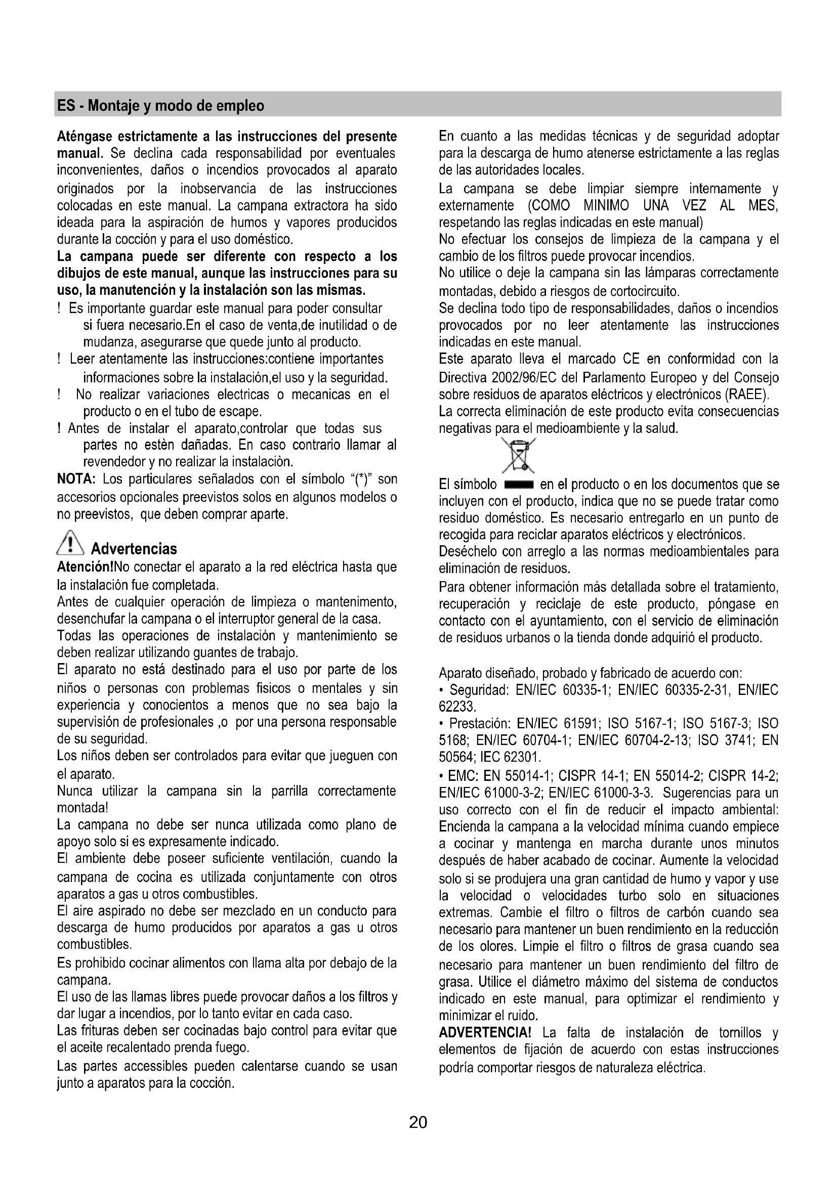 - Filtre à charbon actif NON lavable. Filtre à charbon actif lavable Le filtre à charbon peut être nettoyé tous les deux mois avec de l’eau chaude et au moyen de détergents appropriés ou dans le lave-vaisselle à 65°C (dans le cas de lavage dans le lave-vaisselle suivre un cycle de lavage complet sans vaisselle à l’intérieur). Enlever l’eau qui excède en faisant attention de ne pas abîmer le filtre, ensuite enlever le coussinet posé à l’intérieur du châssis en plastique et le mettre dans le four pendant 10 minutes à 100°C pour le sécher définitivement. Remplacer le coussinet tous les 3 ans et chaque fois que le filtre sera abîmé. Filtre à charbon actif NON lavable La saturation du charbon actif se constate aprés un emploi plus ou mois long, selon la fréquence d'utilisation et la régularité du nettoyage du filtre à graisses. En tout cas, il est nécessaire de changer le filtre aprés, au maximum, quatre mois. IL NE PEUT PAS être nettoyé ou régénéré. Montage Accrocher le filtre au charbon actif d’abord à l’arrière de la languette métallique de la hotte, puis à l’avant avec les deux pommeaux. Démontage Enlever le filtre au charbon actif en tournant de 90° les pommeaux qui le fixent à la hotte. Remplacement des lampes Débrancher l’appareil du réseau électrique Attention! Avant de toucher les lampes, assurez-vous qu’elles soient froides. Remplacez la vieille ampoule avec le même type tel que spécifié par l'étiquette des caractéristiques ou à proximité de l’ampoule même sur le capot. Remplacer l’ampoule endommagée. Utiliser uniquement des ampoules halogènes à bougie Ø35mm E14 28W. Dans l’éventualité où l’éclairage ne devait pas fonctionner, vérifier si les lampes ont été introduites correctement dans leur logement, avant de contacter le service après-vente.20 ES - Montaje y modo de empleo Aténgase estrictamente a las instrucciones del presente manual. Se declina cada responsabilidad por eventuales inconvenientes, daños o incendios provocados al aparato originados por la inobservancia de las instrucciones colocadas en este manual. La campana extractora ha sido ideada para la aspiración de humos y vapores producidos durante la cocción y para el uso doméstico. La campana puede ser diferente con respecto a los dibujos de este manual, aunque las instrucciones para su uso, la manutención y la instalación son las mismas. ! Es importante guardar este manual para poder consultar si fuera necesario.En el caso de venta,de inutilidad o de mudanza, asegurarse que quede junto al producto. ! Leer atentamente las instrucciones:contiene importantes informaciones sobre la instalación,el uso y la seguridad. ! No realizar variaciones electricas o mecanicas en el producto o en el tubo de escape. ! Antes de instalar el aparato,controlar que todas sus partes no estèn dañadas. En caso contrario llamar al revendedor y no realizar la instalaciòn. NOTA: Los particulares señalados con el símbolo “(*)” son accesorios opcionales preevistos solos en algunos modelos o no preevistos, que deben comprar aparte. Advertencias Atención!No conectar el aparato a la red eléctrica hasta que la instalación fue completada. Antes de cualquier operación de limpieza o mantenimento, desenchufar la campana o el interruptor general de la casa. Todas las operaciones de instalación y mantenimiento se deben realizar utilizando guantes de trabajo. El aparato no está destinado para el uso por parte de los niños o personas con problemas fisicos o mentales y sin experiencia y conocientos a menos que no sea bajo la supervisión de profesionales ,o por una persona responsable de su seguridad. Los niños deben ser controlados para evitar que jueguen con el aparato. Nunca utilizar la campana sin la parrilla correctamente montada! La campana no debe ser nunca utilizada como plano de apoyo solo si es expresamente indicado. El ambiente debe poseer suficiente ventilación, cuando la campana de cocina es utilizada conjuntamente con otros aparatos a gas u otros combustibles. El aire aspirado no debe ser mezclado en un conducto para descarga de humo producidos por aparatos a gas u otros combustibles. Es prohibido cocinar alimentos con llama alta por debajo de la campana. El uso de las llamas libres puede provocar daños a los filtros y dar lugar a incendios, por lo tanto evitar en cada caso. Las frituras deben ser cocinadas bajo control para evitar que el aceite recalentado prenda fuego. Las partes accessibles pueden calentarse cuando se usan junto a aparatos para la cocción. En cuanto a las medidas técnicas y de seguridad adoptar para la descarga de humo atenerse estrictamente a las reglas de las autoridades locales. La campana se debe limpiar siempre internamente y externamente (COMO MINIMO UNA VEZ AL MES, respetando las reglas indicadas en este manual) No efectuar los consejos de limpieza de la campana y el cambio de los filtros puede provocar incendios. No utilice o deje la campana sin las lámparas correctamente montadas, debido a riesgos de cortocircuito. Se declina todo tipo de responsabilidades, daños o incendios provocados por no leer atentamente las instrucciones indicadas en este manual. Este aparato lleva el marcado CE en conformidad con la Directiva 2002/96/EC del Parlamento Europeo y del Consejo sobre residuos de aparatos eléctricos y electrónicos (RAEE). La correcta eliminación de este producto evita consecuencias negativas para el medioambiente y la salud. El símbolo en el producto o en los documentos que se incluyen con el producto, indica que no se puede tratar como residuo doméstico. Es necesario entregarlo en un punto de recogida para reciclar aparatos eléctricos y electrónicos. Deséchelo con arreglo a las normas medioambientales para eliminación de residuos. Para obtener información más detallada sobre el tratamiento, recuperación y reciclaje de este producto, póngase en contacto con el ayuntamiento, con el serv