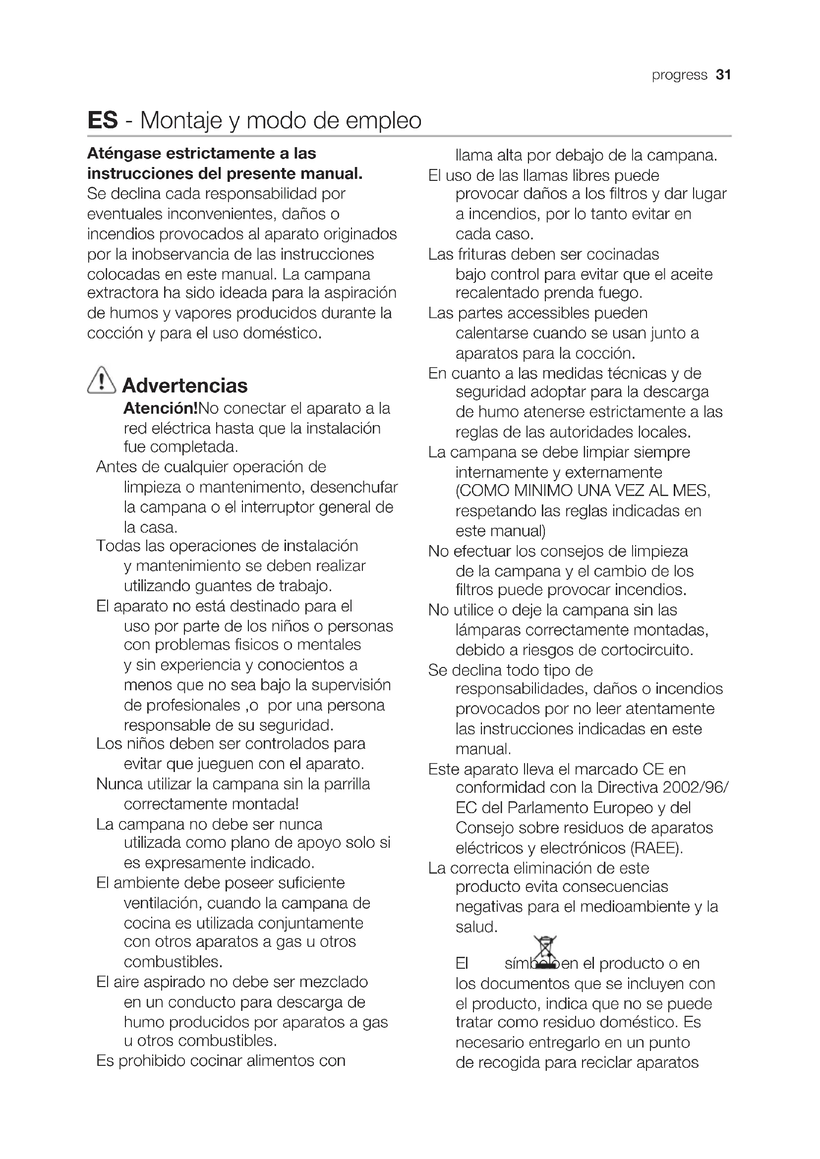 ATENTION: De no observarse las instrucciones dadas para limpar el aparato y sustituir el filtro, poder producirse un incendio. El fabricante recomienda leerlas y respetarlas atentamente.