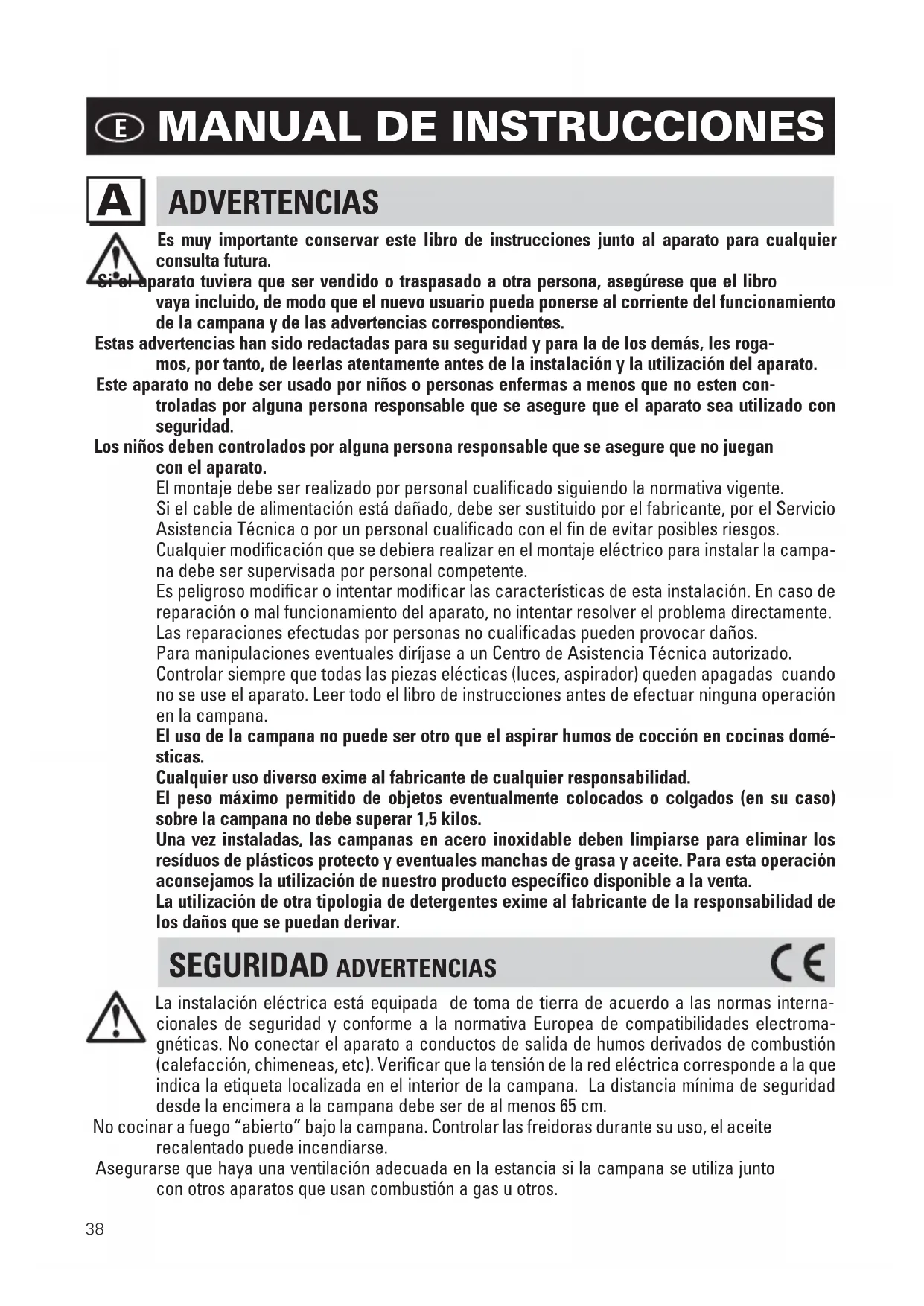 Es muy importante conservar este libro de instrucciones junto al aparato para cualquier consulta futura. Si el aparato tuviera que ser vendido o traspasado a otra persona, asegúrese que el libro vaya incluido, de modo que el nuevo usuario pueda ponerse al corriente del funcionamiento de la campana y de las advertencias correspondientes. Estas advertencias han sido redactadas para su seguridad y para la de los demás, les roga- mos, por tanto, de leerlas atentamente antes de la instalación y la utilización del aparato. Este aparato no debe ser usado por niños o personas enfermas a menos que no esten con- troladas por alguna persona responsable que se asegure que el aparato sea utilizado con seguridad. Los niños deben controlados por alguna persona responsable que se asegure que no juegan con el aparato. El montaje debe ser realizado por personal cualificado siguiendo la normativa vigente. Si el cable de alimentación está dañado, debe ser sustituido por el fabricante, por el Servicio Asistencia Técnica o por un personal cualificado con el fin de evitar posibles riesgos. Cualquier modificación que se debiera realizar en el montaje eléctrico para instalar la campa- na debe ser supervisada por personal competente. Es peligroso modificar o intentar modificar las características de esta instalación. En caso de reparación o mal funcionamiento del aparato, no intentar resolver el problema directamente. Las reparaciones efectudas por personas no cualificadas pueden provocar daños. Para manipulaciones eventuales diríjase a un Centro de Asistencia Técnica autorizado. Controlar siempre que todas las piezas elécticas (luces, aspirador) queden apagadas cuando no se use el aparato. Leer todo el libro de instrucciones antes de efectuar ninguna operación en la campana. El uso de la campana no puede ser otro que el aspirar humos de cocción en cocinas domé- sticas. Cualquier uso diverso exime al fabricante de cualquier responsabilidad. El peso máximo permitido de objetos eventualmente colocados o colgados (en su caso) sobre la campana no debe superar 1,5 kilos. Una vez instaladas, las campanas en acero inoxidable deben limpiarse para eliminar los resíduos de plásticos protecto y eventuales manchas de grasa y aceite. Para esta operación aconsejamos la utilización de nuestro producto específico disponible a la venta. La utilización de otra tipologia de detergentes exime al fabricante de la responsabilidad de los daños que se puedan derivar. SEGURIDAD ADVERTENCIAS La instalación eléctrica está equipada de toma de tierra de acuerdo a las normas interna- cionales de seguridad y conforme a la normativa Europea de compatibilidades electroma- gnéticas. No conectar el aparato a conductos de salida de humos derivados de combustión (calefacción, chimeneas, etc). Verificar que la tensión de la red eléctrica corresponde a la que indica la etiqueta localizada en el interior de la campana. La distancia mínima de seguridad desde la encimera a la campana debe ser de al menos 65 cm. No cocinar a fuego “abierto” bajo la campana. Controlar las freidoras durante su uso, el aceite recalentado puede incendiarse. Asegurarse que haya una ventilación adecuada en la estancia si la campana se utiliza junto con otros aparatos que usan combustión a gas u otros.39 No encender fuego abierto bajo la campana. No conectar el aparato a conductos de salida de humos derivados de la combustión (calefac- ciones, chimeneas, etc). Asegúrese que se cumple la normativa vigente sobre salida de humos al exterior del local antes del uso de la campana. Antes de proceder a cualquier operación de limpieza o manutención, apagar el aparato desenchufándolo o accionando el interruptor general. El fabricante declina cualquier re- sponsabilidad por eventuales daños que pudieran, directa o indirectamente, ser causados a personas, cosas o animales domésticos derivados de la omisión de las prescripciones indicadas en el libro de instrucciones adjunto y concernientes especialmente, a las indica- ciones en tema de instalación, uso y mantenimiento del aparato. - existe riesgo de incendio si la limpieza no se efectúa de acuerdo con las instrucciones. PRECAUCIÓN: Las partes accesibles pueden calentarse cuando se las utiliza con aparatos de cocción. - La longitud máx. del tornillo para fijar la chimenea es 10 mm (suministrado por el fabricante). ADVERTENCIA: Si no se instalan los tornillos o el dispositivo de fijación de acuerdo con estas instrucciones, podrían originarse peligros eléctricos.