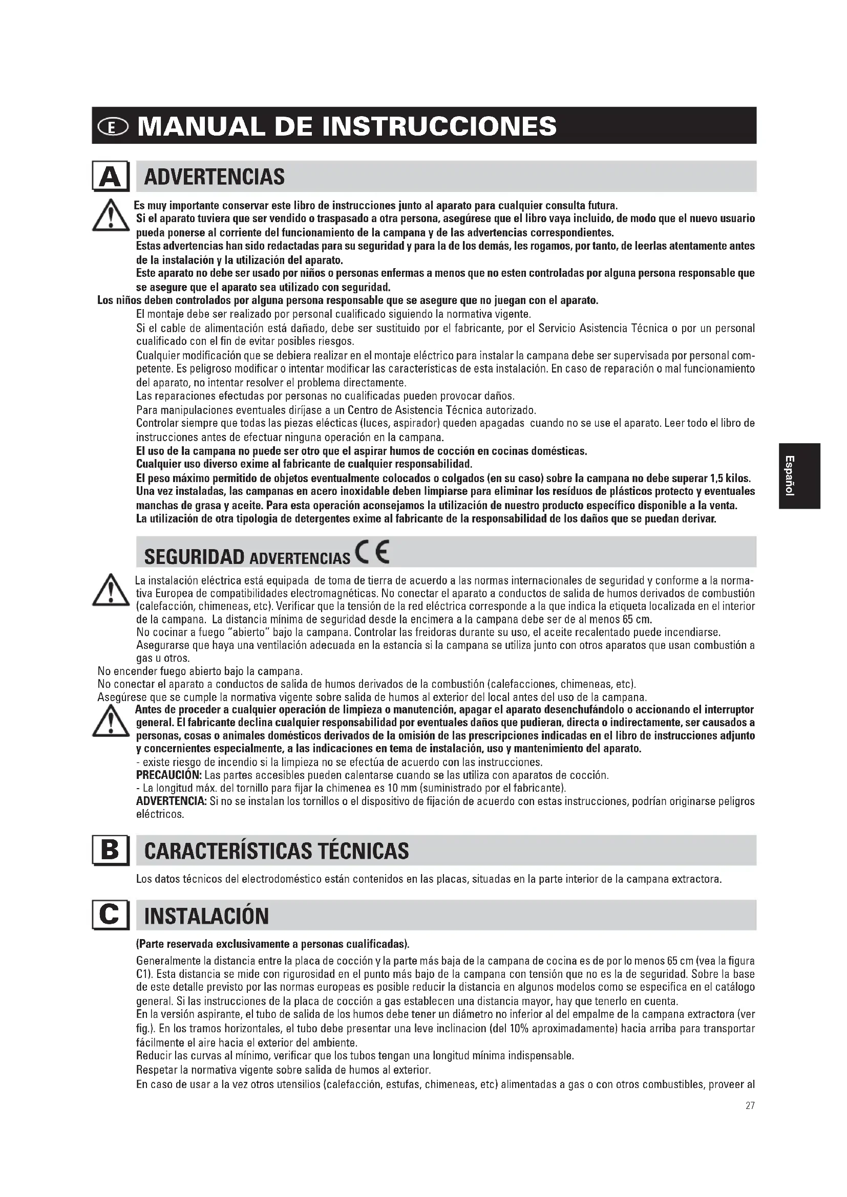 Es muy importante conservar este libro de instrucciones junto al aparato para cualquier consulta futura. Si el aparato tuviera que ser vendido o traspasado a otra persona, asegúrese que el libro vaya incluido, de modo que el nuevo usuario pueda ponerse al corriente del funcionamiento de la campana y de las advertencias correspondientes. Estas advertencias han sido redactadas para su seguridad y para la de los demás, les rogamos, por tanto, de leerlas atentamente antes de la instalación y la utilización del aparato. Este aparato no debe ser usado por niños o personas enfermas a menos que no esten controladas por alguna persona responsable que se asegure que el aparato sea utilizado con seguridad. Los niños deben controlados por alguna persona responsable que se asegure que no juegan con el aparato.El montaje debe ser realizado por personal cualificado siguiendo la normativa vigente. Si el cable de alimentación está dañado, debe ser sustituido por el fabricante, por el Servicio Asistencia Técnica o por un personal cualificado con el fin de evitar posibles riesgos. Cualquier modificación que se debiera realizar en el montaje eléctrico para instalar la campana debe ser supervisada por personal com- petente. Es peligroso modificar o intentar modificar las características de esta instalación. En caso de reparación o mal funcionamiento del aparato, no intentar resolver el problema directamente. Las reparaciones efectudas por personas no cualificadas pueden provocar daños. Para manipulaciones eventuales diríjase a un Centro de Asistencia Técnica autorizado. Controlar siempre que todas las piezas elécticas (luces, aspirador) queden apagadas cuando no se use el aparato. Leer todo el libro de instrucciones antes de efectuar ninguna operación en la campana. El uso de la campana no puede ser otro que el aspirar humos de cocción en cocinas domésticas. Cualquier uso diverso exime al fabricante de cualquier responsabilidad. El peso máximo permitido de objetos eventualmente colocados o colgados (en su caso) sobre la campana no debe superar 1,5 kilos. Una vez instaladas, las campanas en acero inoxidable deben limpiarse para eliminar los resíduos de plásticos protecto y eventuales manchas de grasa y aceite. Para esta operación aconsejamos la utilización de nuestro producto específico disponible a la venta. La utilización de otra tipologia de detergentes exime al fabricante de la responsabilidad de los daños que se puedan derivar. SEGURIDAD ADVERTENCIAS La instalación eléctrica está equipada de toma de tierra de acuerdo a las normas internacionales de seguridad y conforme a la norma- tiva Europea de compatibilidades electromagnéticas. No conectar el aparato a conductos de salida de humos derivados de combustión (calefacción, chimeneas, etc). Verificar que la tensión de la red eléctrica corresponde a la que indica la etiqueta localizada en el interior de la campana. La distancia mínima de seguridad desde la encimera a la campana debe ser de al menos 65 cm. No cocinar a fuego “abierto” bajo la campana. Controlar las freidoras durante su uso, el aceite recalentado puede incendiarse. Asegurarse que haya una ventilación adecuada en la estancia si la campana se utiliza junto con otros aparatos que usan combustión a gas u otros. No encender fuego abierto bajo la campana. No conectar el aparato a conductos de salida de humos derivados de la combustión (calefacciones, chimeneas, etc). Asegúrese que se cumple la normativa vigente sobre salida de humos al exterior del local antes del uso de la campana. Antes de proceder a cualquier operación de limpieza o manutención, apagar el aparato desenchufándolo o accionando el interruptor general. El fabricante declina cualquier responsabilidad por eventuales daños que pudieran, directa o indirectamente, ser causados a personas, cosas o animales domésticos derivados de la omisión de las prescripciones indicadas en el libro de instrucciones adjunto y concernientes especialmente, a las indicaciones en tema de instalación, uso y mantenimiento del aparato.- existe riesgo de incendio si la limpieza no se efectúa de acuerdo con las instrucciones. PRECAUCIÓN: Las partes accesibles pueden calentarse cuando se las utiliza con aparatos de cocción. - La longitud máx. del tornillo para fijar la chimenea es 10 mm (suministrado por el fabricante). ADVERTENCIA: Si no se instalan los tornillos o el dispositivo de fijación de acuerdo con estas instrucciones, podrían originarse peligros eléctricos.