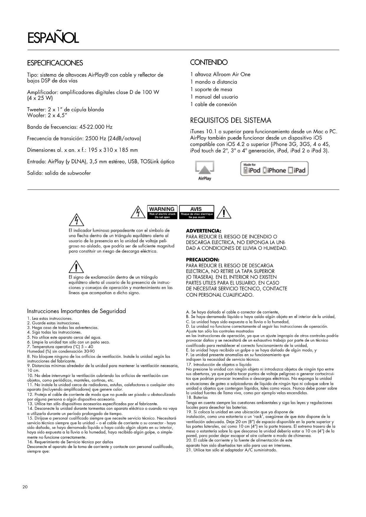 iTunes 10.1 o superior para funcionamiento desde un Mac o PC. AirPlay también puede funcionar desde un dispositivo iOS compatible con iOS 4.2 o superior (iPhone 3G, 3GS, 4 o 4S, iPod touch de 2ª, 3ª o 4ª generación, iPad, iPad 2 o iPad 3). ADVERTENCIA: PARA REDUCIR EL RIESGO DE INCENDIO O