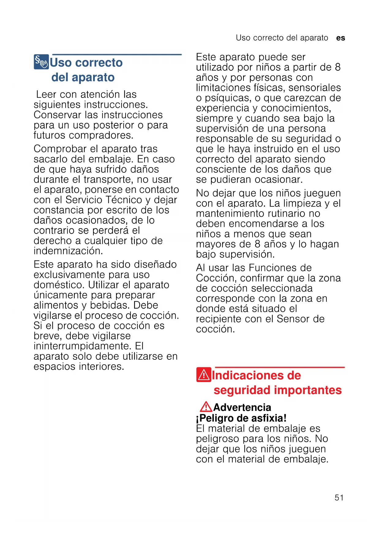 8 Uso correcto del aparato Us o cor r ect o del apar at o Leer con atención las siguientes instrucciones. Conservar las instrucciones para un uso posterior o para futuros compradores. Comprobar el aparato tras sacarlo del embalaje. En caso de que haya sufrido daños durante el transporte, no usar el aparato, ponerse en contacto con el Servicio Técnico y dejar constancia por escrito de los daños ocasionados, de lo contrario se perderá el derecho a cualquier tipo de indemnización. Este aparato ha sido diseñado exclusivamente para uso doméstico. Utilizar el aparato únicamente para preparar alimentos y bebidas. Debe vigilarse el proceso de cocción. Si el proceso de cocción es breve, debe vigilarse ininterrumpidamente. El aparato solo debe utilizarse en espacios interiores. Este aparato puede ser utilizado por niños a partir de 8 años y por personas con limitaciones físicas, sensoriales o psíquicas, o que carezcan de experiencia y conocimientos, siempre y cuando sea bajo la supervisión de una persona responsable de su seguridad o que le haya instruido en el uso correcto del aparato siendo consciente de los daños que se pudieran ocasionar. No dejar que los niños jueguen con el aparato. La limpieza y el mantenimiento rutinario no deben encomendarse a los niños a menos que sean mayores de 8 años y lo hagan bajo supervisión. Al usar las Funciones de Cocción, confirmar que la zona de cocción seleccionada corresponde con la zona en donde está situado el recipiente con el Sensor de cocción. ( Indicaciones de seguridad importantes I ndi cac i ones de segur i dad impor t ant es :Advertencia ¡Peligro de asfixia! El material de embalaje es peligroso para los niños. No dejar que los niños jueguen con el material de embalaje.es Protección del medio ambiente