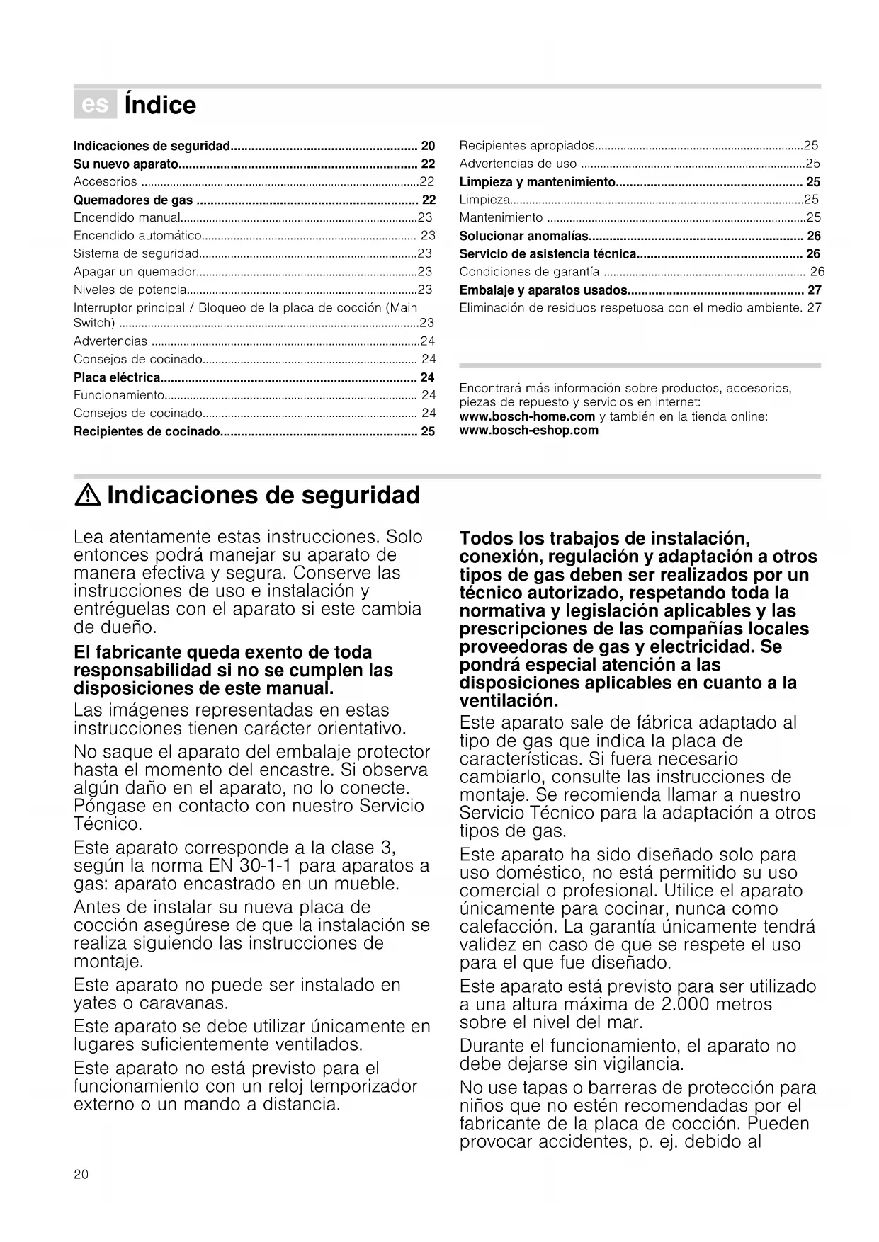 - Embalaje y aparatos usados Eliminación de residuos respetuosa con el medio ambiente. 27 Produktinfo Encontrará más información sobre productos, accesorios, piezas de repuesto y servicios en internet: www.bosch-home.com y también en la tienda online: www.bosch-eshop.com : Indicaciones de seguridad Lea atentamente estas instrucciones. Solo entonces podrá manejar su aparato de manera efectiva y segura. Conserve las instrucciones de uso e instalación y entréguelas con el aparato si este cambia de dueño. El fabricante queda exento de toda responsabilidad si no se cumplen las disposiciones de este manual. Las imágenes representadas en estas instrucciones tienen carácter orientativo. No saque el aparato del embalaje protector hasta el momento del encastre. Si observa algún daño en el aparato, no lo conecte. Póngase en contacto con nuestro Servicio Técnico. Este aparato corresponde a la clase 3, según la norma EN 30-1-1 para aparatos a gas: aparato encastrado en un mueble. Antes de instalar su nueva placa de cocción asegúrese de que la instalación se realiza siguiendo las instrucciones de montaje. Este aparato no puede ser instalado en yates o caravanas. Este aparato se debe utilizar únicamente en lugares suficientemente ventilados. Este aparato no está previsto para el funcionamiento con un reloj temporizador externo o un mando a distancia. Todos los trabajos de instalación, conexión, regulación y adaptación a otros tipos de gas deben ser realizados por un técnico autorizado, respetando toda la normativa y legislación aplicables y las prescripciones de las compañías locales proveedoras de gas y electricidad. Se pondrá especial atención a las disposiciones aplicables en cuanto a la ventilación. Este aparato sale de fábrica adaptado al tipo de gas que indica la placa de características. Si fuera necesario cambiarlo, consulte las instrucciones de montaje. Se recomienda llamar a nuestro Servicio Técnico para la adaptación a otros tipos de gas. Este aparato ha sido diseñado solo para uso doméstico, no está permitido su uso comercial o profesional. Utilice el aparato únicamente para cocinar, nunca como calefacción. La garantía únicamente tendrá validez en caso de que se respete el uso para el que fue diseñado. Este aparato está previsto para ser utilizado a una altura máxima de 2.000 metros sobre el nivel del mar. Durante el funcionamiento, el aparato no debe dejarse sin vigilancia. No use tapas o barreras de protección para niños que no estén recomendadas por el fabricante de la placa de cocción. Pueden provocar accidentes, p. ej. debido al21 sobrecalentamiento, ignición o desprendimiento de fragmentos de materiales. Este aparato puede ser utilizado por niños a partir de 8 años y por personas con limitaciones físicas, sensoriales o psíquicas, o que carezcan de experiencia y conocimientos, siempre y cuando sea bajo la supervisión de una persona responsable de su seguridad o que le haya instruido en el uso correcto del aparato siendo consciente de los daños que se pudieran ocasionar. No dejar que los niños jueguen con el aparato. La limpieza y el mantenimiento rutinario no deben encomendarse a los niños a menos que sean mayores de 8 años y lo hagan bajo supervisión. Mantener los niños menores de 8 años alejados del aparato y del cable de conexión. ¡Peligro de deflagración! La acumulación de gas sin quemar en un recinto cerrado conlleva peligro de deflagración. No someta el aparato a corrientes de aire. Los quemadores podrían apagarse. Lea atentamente las instrucciones y advertencias relativas al funcionamiento de los quemadores de gas. ¡Peligro de intoxicación! El uso de un aparato de cocción a gas produce calor, humedad y productos de combustión en el local donde está instalado. Asegure una buena ventilación de la cocina, especialmente mientras la placa de cocción esté en funcionamiento: mantenga abiertos los orificios de ventilación natural o instale un dispositivo de ventilación mecánica (campana extractora). La utilización intensa y prolongada del aparato puede necesitar una ventilación complementaria o más eficaz: abra una ventana o aumente la potencia de la ventilación mecánica. ¡Peligro de quemaduras! p. 27
