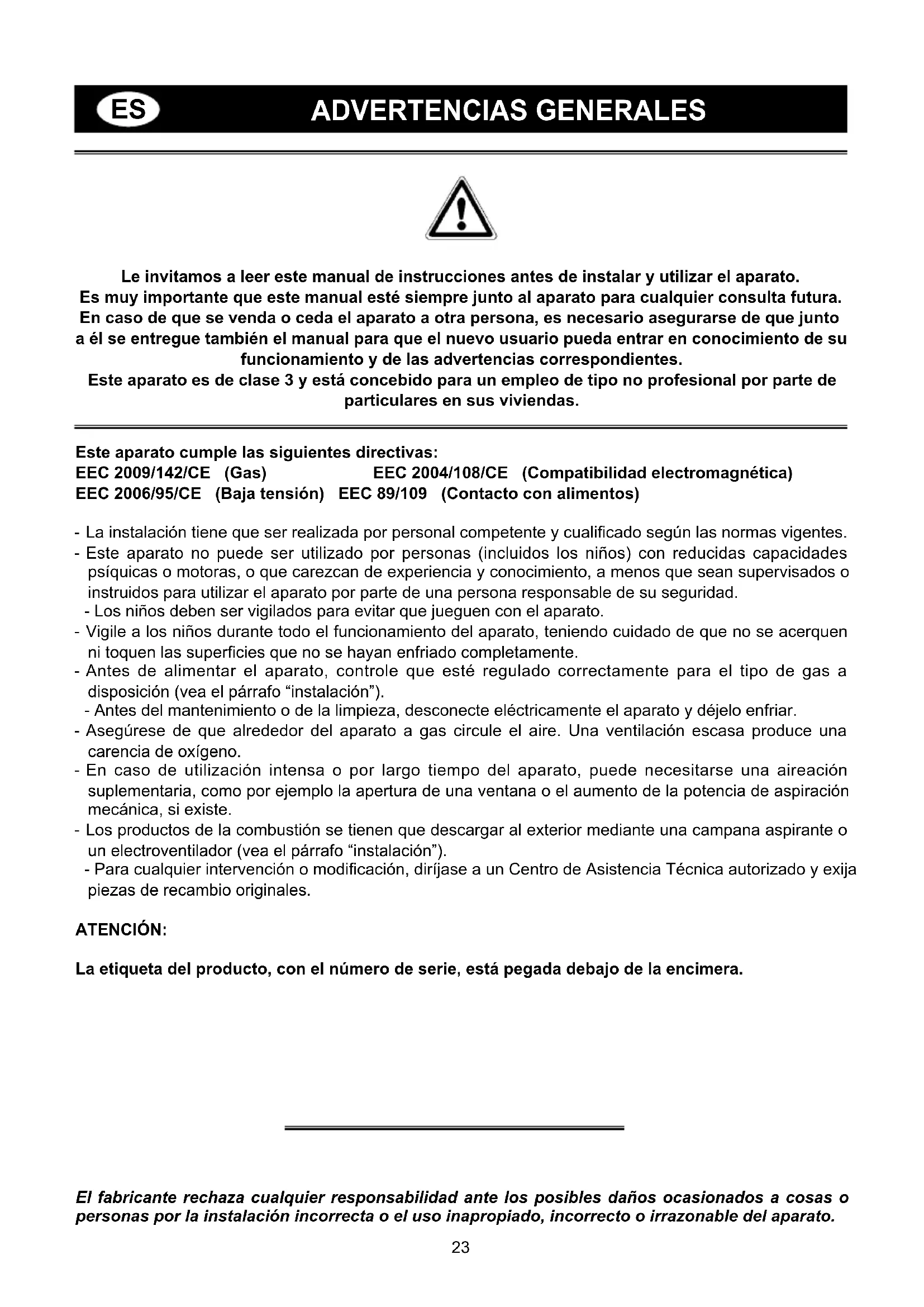 ADVERTENCIAS GENERALES Le invitamos a leer este manual de instrucciones antes de instalar y utilizar el aparato. Es muy importante que este manual esté siempre junto al aparato para cualquier consulta futura. En caso de que se venda o ceda el aparato a otra persona, es necesario asegurarse de que junto a él se entregue también el manual para que el nuevo usuario pueda entrar en conocimiento de su funcionamiento y de las advertencias correspondientes. Este aparato es de clase 3 y está concebido para un empleo de tipo no profesional por parte de particulares en sus viviendas. Este aparato cumple las siguientes directivas: EEC 2009/142/CE (Gas) EEC 2004/108/CE (Compatibilidad electromagnética) EEC 2006/95/CE (Baja tensión) EEC 89/109 (Contacto con alimentos) - La instalación tiene que ser realizada por personal competente y cualificado según las normas vigentes. - Este aparato no puede ser utilizado por personas (incluidos los niños) con reducidas capacidades psíquicas o motoras, o que carezcan de experiencia y conocimiento, a menos que sean supervisados o instruidos para utilizar el aparato por parte de una persona responsable de su seguridad. - Los niños deben ser vigilados para evitar que jueguen con el aparato. - Vigile a los niños durante todo el funcionamiento del aparato, teniendo cuidado de que no se acerquen ni toquen las superficies que no se hayan enfriado completamente. - Antes de alimentar el aparato, controle que esté regulado correctamente para el tipo de gas a disposición (vea el párrafo “instalación”). - Antes del mantenimiento o de la limpieza, desconecte eléctricamente el aparato y déjelo enfriar. - Asegúrese de que alrededor del aparato a gas circule el aire. Una ventilación escasa produce una carencia de oxígeno. - En caso de utilización intensa o por largo tiempo del aparato, puede necesitarse una aireación suplementaria, como por ejemplo la apertura de una ventana o el aumento de la potencia de aspiración mecánica, si existe. - Los productos de la combustión se tienen que descargar al exterior mediante una campana aspirante o un electroventilador (vea el párrafo “instalación”). - Para cualquier intervención o modificación, diríjase a un Centro de Asistencia Técnica autorizado y exija piezas de recambio originales. ATENCIÓN: La etiqueta del producto, con el número de serie, está pegada debajo de la encimera. El fabricante rechaza cualquier responsabilidad ante los posibles daños ocasionados a cosas o personas por la instalación incorrecta o el uso inapropiado, incorrecto o irrazonable del aparato.24