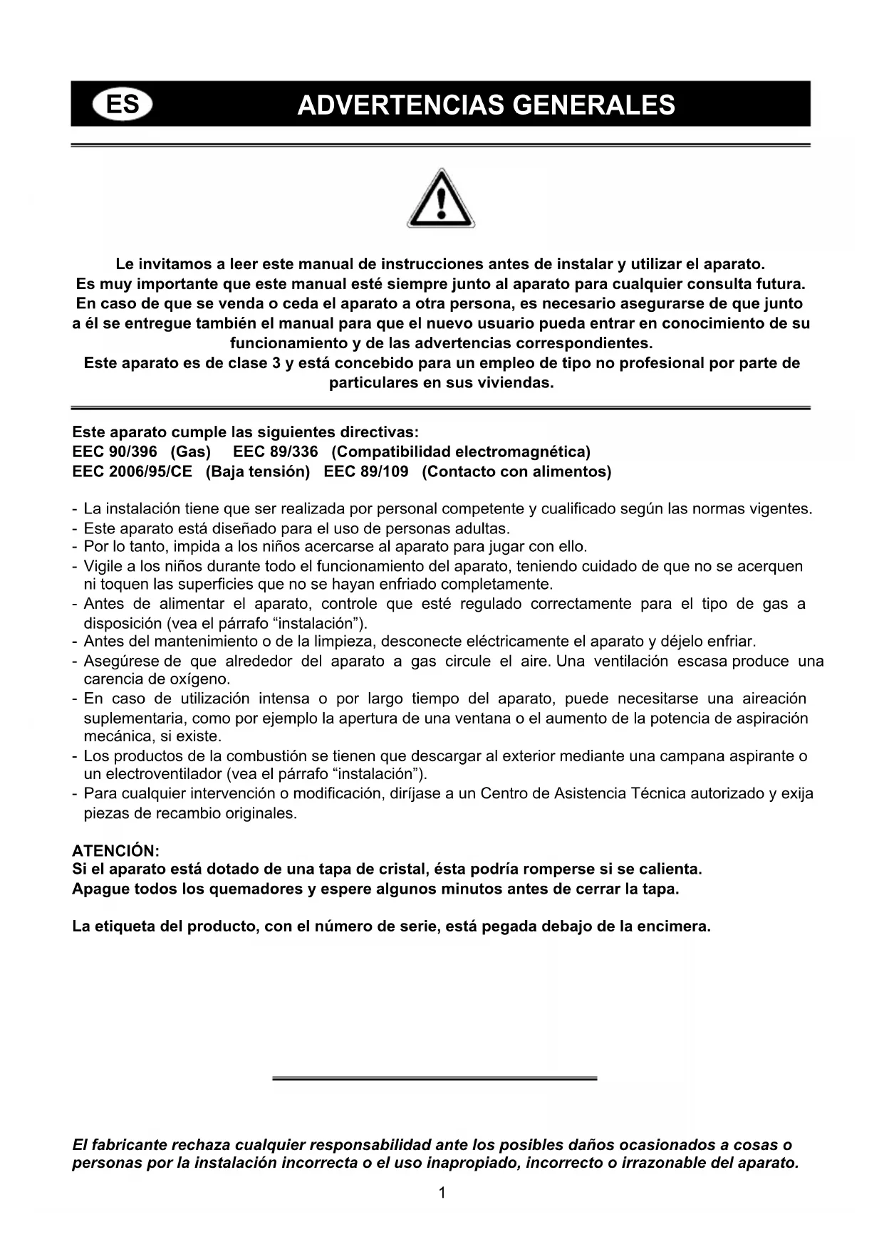 ADVERTENCIAS GENERALES Le invitamos a leer este manual de instrucciones antes de instalar y utilizar el aparato. Es muy importante que este manual esté siempre junto al aparato para cualquier consulta futura. En caso de que se venda o ceda el aparato a otra persona, es necesario asegurarse de que junto a él se entregue también el manual para que el nuevo usuario pueda entrar en conocimiento de su funcionamiento y de las advertencias correspondientes. Este aparato es de clase 3 y está concebido para un empleo de tipo no profesional por parte de particulares en sus viviendas. Este aparato cumple las siguientes directivas: EEC 90/396 (Gas) EEC 89/336 (Compatibilidad electromagnética) EEC 2006/95/CE (Baja tensión) EEC 89/109 (Contacto con alimentos) La instalación tiene que ser realizada por personal competente y cualificado según las normas vigentes. Este aparato está diseñado para el uso de personas adultas. Por lo tanto, impida a los niños acercarse al aparato para jugar con ello. Vigile a los niños durante todo el funcionamiento del aparato, teniendo cuidado de que no se acerquen ni toquen las superficies que no se hayan enfriado completamente. Antes de alimentar el aparato, controle que esté regulado correctamente para el tipo de gas a disposición (vea el párrafo “instalación”). Antes del mantenimiento o de la limpieza, desconecte eléctricamente el aparato y déjelo enfriar. Asegúrese de que alrededor del aparato a gas circule el aire. Una ventilación escasa produce una carencia de oxígeno. En caso de utilización intensa o por largo tiempo del aparato, puede necesitarse una aireación suplementaria, como por ejemplo la apertura de una ventana o el aumento de la potencia de aspiración mecánica, si existe. Los productos de la combustión se tienen que descargar al exterior mediante una campana aspirante o un electroventilador (vea el párrafo “instalación”). Para cualquier intervención o modificación, diríjase a un Centro de Asistencia Técnica autorizado y exija piezas de recambio originales. ATENCIÓN: Si el aparato está dotado de una tapa de cristal, ésta podría romperse si se calienta. Apague todos los quemadores y espere algunos minutos antes de cerrar la tapa. La etiqueta del producto, con el número de serie, está pegada debajo de la encimera.