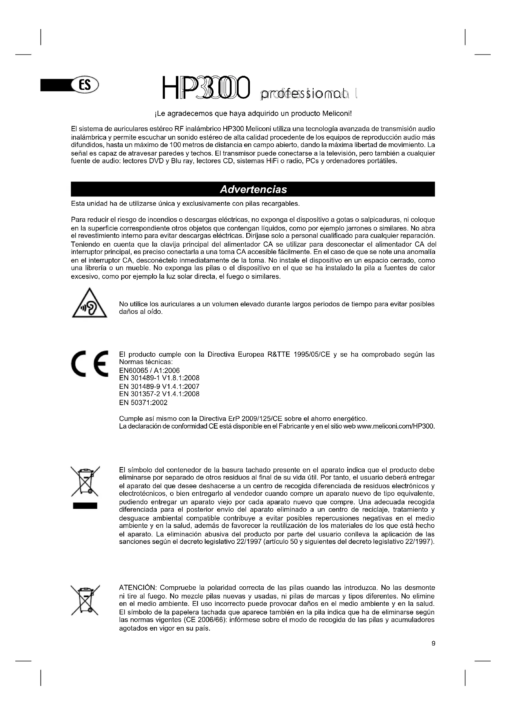 No utilice los auriculares a un volumen elevado durante largos periodos de tiempo para evitar posibles daños al oído.El producto cumple con la Directiva Europea R&TTE 1995/05/CE y se ha comprobado según las Normas técnicas:EN60065 / A1:2006 EN 301489-1 V1.8.1:2008EN 301489-9 V1.4.1:2007EN 301357-2 V1.4.1:2008EN 50371:2002Cumple así mismo con la Directiva ErP 2009/125/CE sobre el ahorro energético.La declaración de conformidad CE está disponible en el Fabricante y en el sitio web www.meliconi.com/HP300.Esta unidad ha de utilizarse única y exclusivamente con pilas recargables. Para reducir el riesgo de incendios o descargas eléctricas, no exponga el dispositivo a gotas o salpicaduras, ni coloque en la superfi cie correspondiente otros objetos que contengan líquidos, como por ejemplo jarrones o similares. No abra el revestimiento interno para evitar descargas eléctricas. Diríjase solo a personal cualifi cado para cualquier reparación. Teniendo en cuenta que la clavija principal del alimentador CA se utilizar para desconectar el alimentador CA del interruptor principal, es preciso conectarla a una toma CA accesible fácilmente. En el caso de que se note una anomalía en el interruptor CA, desconéctelo inmediatamente de la toma. No instale el dispositivo en un espacio cerrado, como una librería o un mueble. No exponga las pilas o el dispositivo en el que se ha instalado la pila a fuentes de calor excesivo, como por ejemplo la luz solar directa, el fuego o similares. HP300 HP300 profess i o n a l professional ¡Le agradecemos que haya adquirido un producto Meliconi! El sistema de auriculares estéreo RF inalámbrico HP300 Meliconi utiliza una tecnología avanzada de transmisión audio inalámbrica y permite escuchar un sonido estéreo de alta calidad procedente de los equipos de reproducción audio más difundidos, hasta un máximo de 100 metros de distancia en campo abierto, dando la máxima libertad de movimiento. La señal es capaz de atravesar paredes y techos. El transmisor puede conectarse a la televisión, pero también a cualquier fuente de audio: lectores DVD y Blu ray, lectores CD, sistemas HiFi o radio, PCs y ordenadores portátiles.ATENCIÓN: Compruebe la polaridad correcta de las pilas cuando las introduzca. No las desmonte ni tire al fuego. No mezcle pilas nuevas y usadas, ni pilas de marcas y tipos diferentes. No elimine en el medio ambiente. El uso incorrecto puede provocar daños en el medio ambiente y en la salud. El símbolo de la papelera tachada que aparece también en la pila indica que ha de eliminarse según las normas vigentes (CE 2006/66): infórmese sobre el modo de recogida de las pilas y acumuladores agotados en vigor en su país. Advertencias El símbolo del contenedor de la basura tachado presente en el aparato indica que el producto debe eliminarse por separado de otros residuos al fi nal de su vida útil. Por tanto, el usuario deberá entregar el aparato del que desee deshacerse a un centro de recogida diferenciada de residuos electrónicos y electrotécnicos, o bien entregarlo al vendedor cuando compre un aparato nuevo de tipo equivalente, pudiendo entregar un aparato viejo por cada aparato nuevo que compre. Una adecuada recogida diferenciada para el posterior envío del aparato eliminado a un centro de reciclaje, tratamiento y desguace ambiental compatible contribuye a evitar posibles repercusiones negativas en el medio ambiente y en la salud, además de favorecer la reutilización de los materiales de los que está hecho el aparato. La eliminación abusiva del producto por parte del usuario conlleva la aplicación de las sanciones según el decreto legislativo 22/1997 (artículo 50 y siguientes del decreto legislativo 22/1997).10