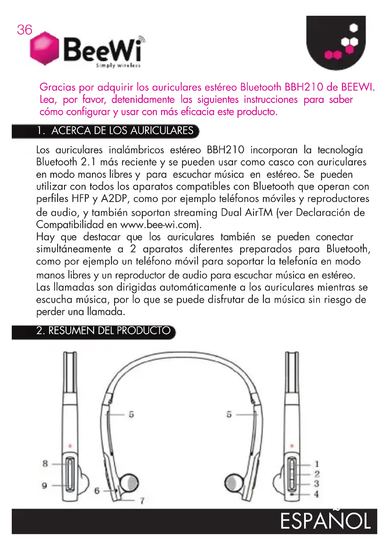 Gracias por adquirir los auriculares estéreo Bluetooth BBH210 de BEEWI. Lea, por favor, detenidamente las siguientes instrucciones para saber cómo congurar y usar con más ecacia este producto.