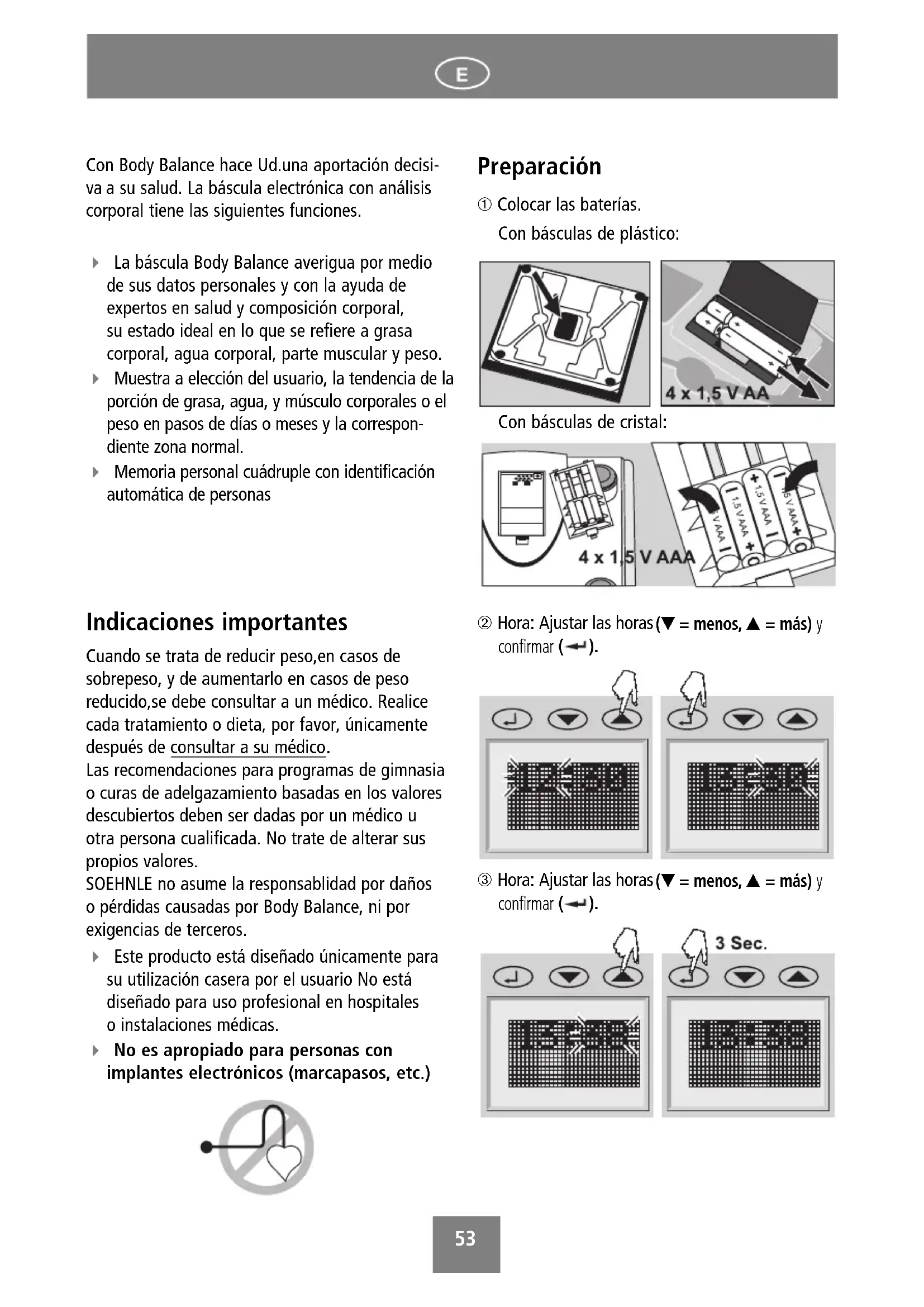 Las recomendaciones para programas de gimnasia o curas de adelgazamiento basadas en los valores descubiertos deben ser dadas por un médico u otra persona cualificada. No trate de alterar sus propios valores. SOEHNLE no asume la responsablidad por daños o pérdidas causadas por Body Balance, ni por exigencias de terceros. Este producto está diseñado únicamente para su utilización casera por el usuario No está diseñado para uso profesional en hospitales o instalaciones médicas. No es apropiado para personas con implantes electrónicos (marcapasos, etc.) Preparación ➀ Colocar las baterías. Con básculas de plástico: Con básculas de cristal: ➁ Hora: Ajustar las horas (▼ = menos, ▲ = más) y confirmar