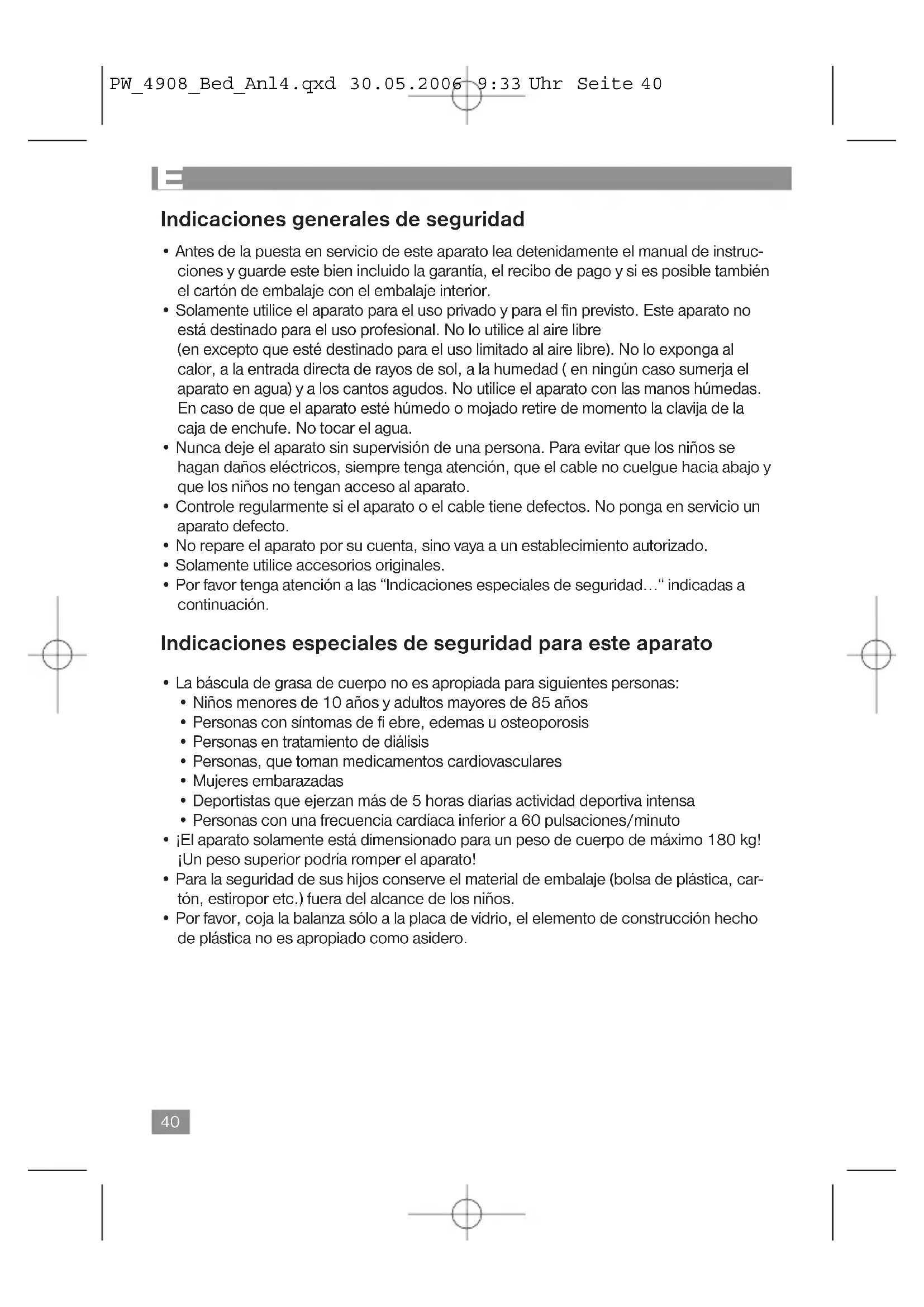 PW_4908_Bed_Anl4.qxd 30.05.2006 9:33 Uhr Seite 47Significado del símbolo „Cubo de basura“ Proteja nuestro medio ambiente, aparatos eléctricos no forman parte de la basura doméstica. Utilice los depósitos centrales previstos para el tratamiento de desechos y ent- regue allí sus aparatos eléctricos que ya no se usan. Ayudará en evitar las potenciales consecuencias, a causa de una erronéa eliminación de desechos, para el medio ambiente y la salud humana. Con ello, contribuirá a la recuperación, al reciclado y a otras formas de reutilización de los aparatos viejos eléctricos y electrónicos. La información cómo se debe eliminar los aparatos, se obtiene en su ayuntamiento o su administración municipal. Datos técnicos Modelo:PW 4908 FA Suministro de tensión:2X 3V CR 2032 Min. / Máx. Carga de peso: 2 kg/4,4 Ib – 180,9 kg/398,8 Ib
