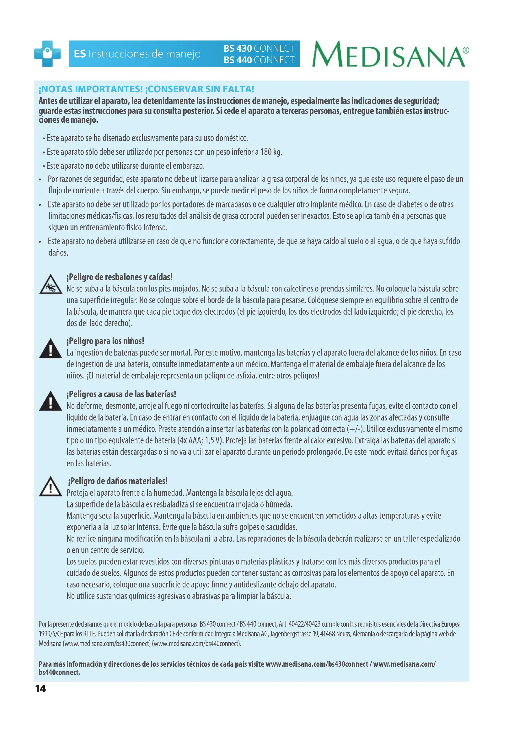 - Este aparato no deberá utilizarse en caso de que no funcione correctamente, de que se haya caído al suelo o al agua, o de que haya sufrido daños. ¡Peligro de resbalones y caídas! No se suba a la báscula con los pies mojados. No se suba a la báscula con calcetines o prendas similares. No coloque la báscula sobre una supercie irregular. No se coloque sobre el borde de la báscula para pesarse. Colóquese siempre en equilibrio sobre el centro de la báscula, de manera que cada pie toque dos electrodos (el pie izquierdo, los dos electrodos del lado izquierdo; el pie derecho, los dos del lado derecho). ¡Peligro para los niños! La ingestión de baterías puede ser mortal. Por este motivo, mantenga las baterías y el aparato fuera del alcance de los niños. En caso de ingestión de una batería, consulte inmediatamente a un médico. Mantenga el material de embalaje fuera del alcance de los niños. ¡El material de embalaje representa un peligro de asxia, entre otros peligros! ¡Peligros a causa de las baterías! No deforme, desmonte, arroje al fuego ni cortocircuite las baterías. Si alguna de las baterías presenta fugas, evite el contacto con el líquido de la batería. En caso de entrar en contacto con el líquido de la batería, enjuague con agua las zonas afectadas y consulte inmediatamente a un médico. Preste atención a insertar las baterías con la polaridad correcta (+/-). Utilice exclusivamente el mismo tipo o un tipo equivalente de batería (4x AAA; 1,5 V). Proteja las baterías frente al calor excesivo. Extraiga las baterías del aparato si las baterías están descargadas o si no va a utilizar el aparato durante un periodo prolongado. De este modo evitará daños por fugas en las baterías. ¡Peligro de daños materiales! Proteja el aparato frente a la humedad. Mantenga la báscula lejos del agua. La supercie de la báscula es resbaladiza si se encuentra mojada o húmeda. Mantenga seca la supercie. Mantenga la báscula en ambientes que no se encuentren sometidos a altas temperaturas y evite exponerla a la luz solar intensa. Evite que la báscula sufra golpes o sacudidas. No realice ninguna modicación en la báscula ni la abra. Las reparaciones de la báscula deberán realizarse en un taller especializado o en un centro de servicio. Los suelos pueden estar revestidos con diversas pinturas o materias plásticas y tratarse con los más diversos productos para el cuidado de suelos. Algunos de estos productos pueden contener sustancias corrosivas para los elementos de apoyo del aparato. En caso necesario, coloque una supercie de apoyo rme y antideslizante debajo del aparato. No utilice sustancias químicas agresivas o abrasivas para limpiar la báscula. Por la presente declaramos que el modelo de báscula para personas: BS 430 connect / BS 440 connect, Art. 40422/40423 cumple con los requisitos esenciales de la Directiva Europea 1999/5/CE para los RTTE. Pueden solicitar la declaración CE de conformidad íntegra a Medisana AG, Jagenbergstrasse 19, 41468 Neuss, Alemania o descargarla de la página web de Medisana (www.medisana.com/bs430connect) (www.medisana.com/bs440connect).