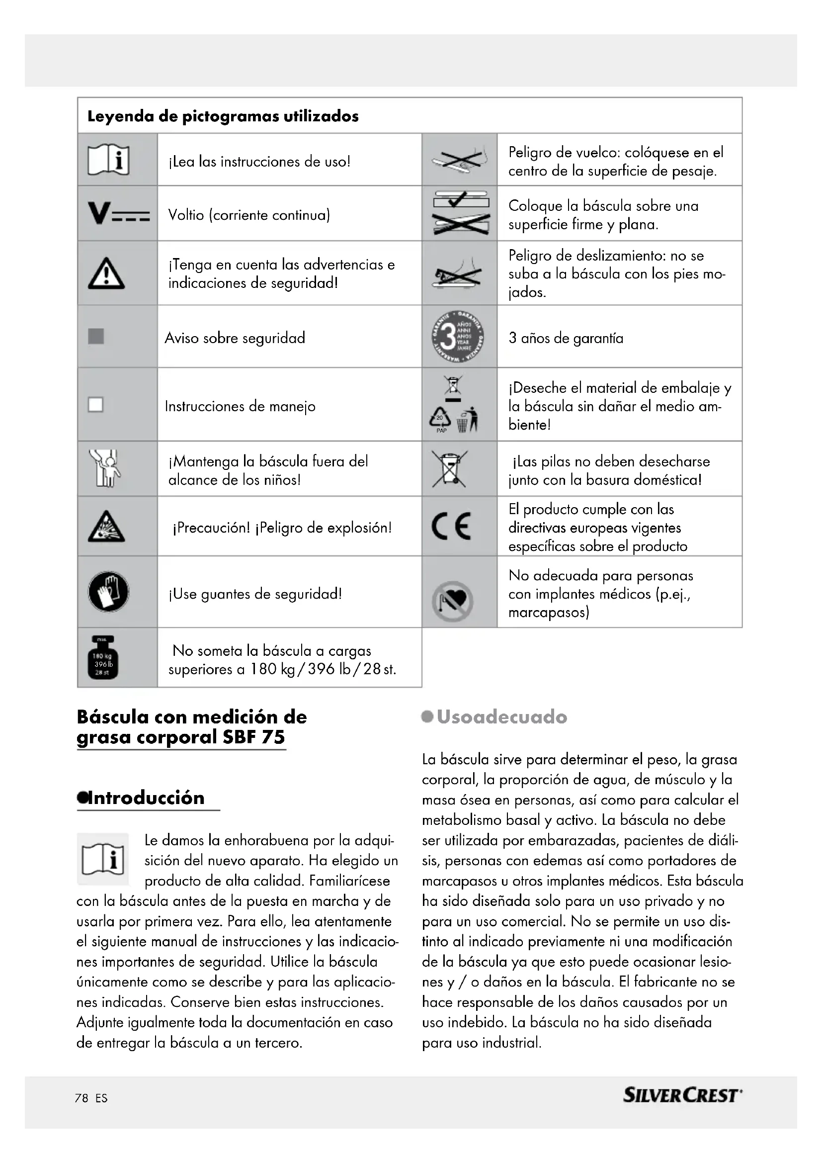 396 lb No someta la báscula a cargas superiores a 180 kg / 396 lb / 28 st. Báscula con medición de grasa corporal SBF 75 Introducción Le damos la enhorabuena por la adqui- sición del nuevo aparato. Ha elegido un producto de alta calidad. Familiarícese con la báscula antes de la puesta en marcha y de usarla por primera vez. Para ello, lea atentamente el siguiente manual de instrucciones y las indicacio- nes importantes de seguridad. Utilice la báscula únicamente como se describe y para las aplicacio- nes indicadas. Conserve bien estas instrucciones. Adjunte igualmente toda la documentación en caso de entregar la báscula a un tercero. Uso adecuado La báscula sirve para determinar el peso, la grasa corporal, la proporción de agua, de músculo y la masa ósea en personas, así como para calcular el metabolismo basal y activo. La báscula no debe ser utilizada por embarazadas, pacientes de diáli- sis, personas con edemas así como portadores de marcapasos u otros implantes médicos. Esta báscula ha sido diseñada solo para un uso privado y no para un uso comercial. No se permite un uso dis- tinto al indicado previamente ni una modificación de la báscula ya que esto puede ocasionar lesio- nes y / o daños en la báscula. El fabricante no se hace responsable de los daños causados por un uso indebido. La báscula no ha sido diseñada para uso industrial.79 ES Introducción Introducción Nota: Las mediciones y recomendaciones carecen de relevancia médica. Si su proporción de grasa corporal y agua se mantienen durante mucho tiempo por encima o por debajo de lo considerado normal, acuda a un médico. Descripción de los componentes