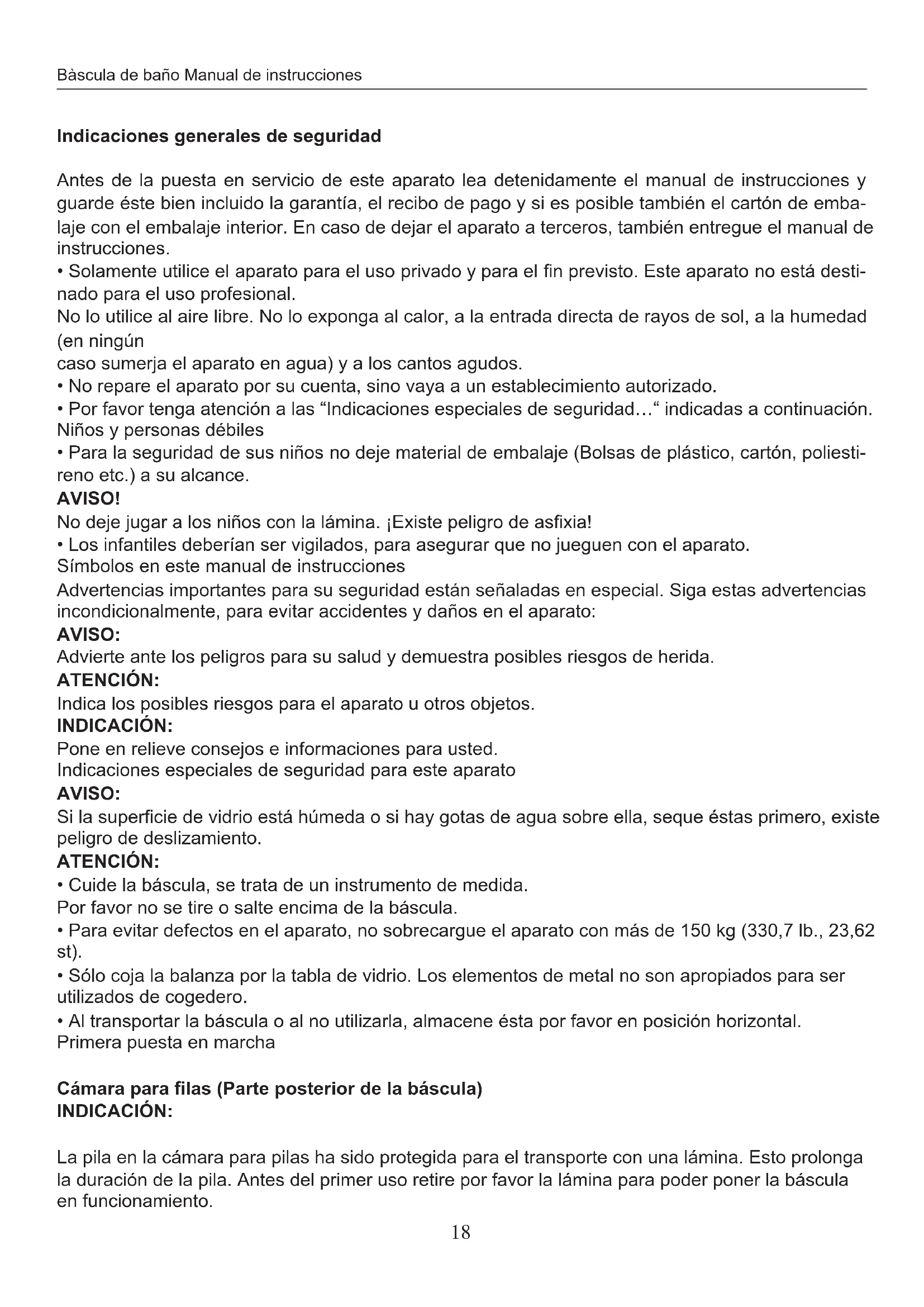 Por favor no se tire o salte encima de la bascula. - Para evaporar defectos en el aparato, no sobrecargue el aparato con más de 150 kg (330,7 lb., 23,62 st).