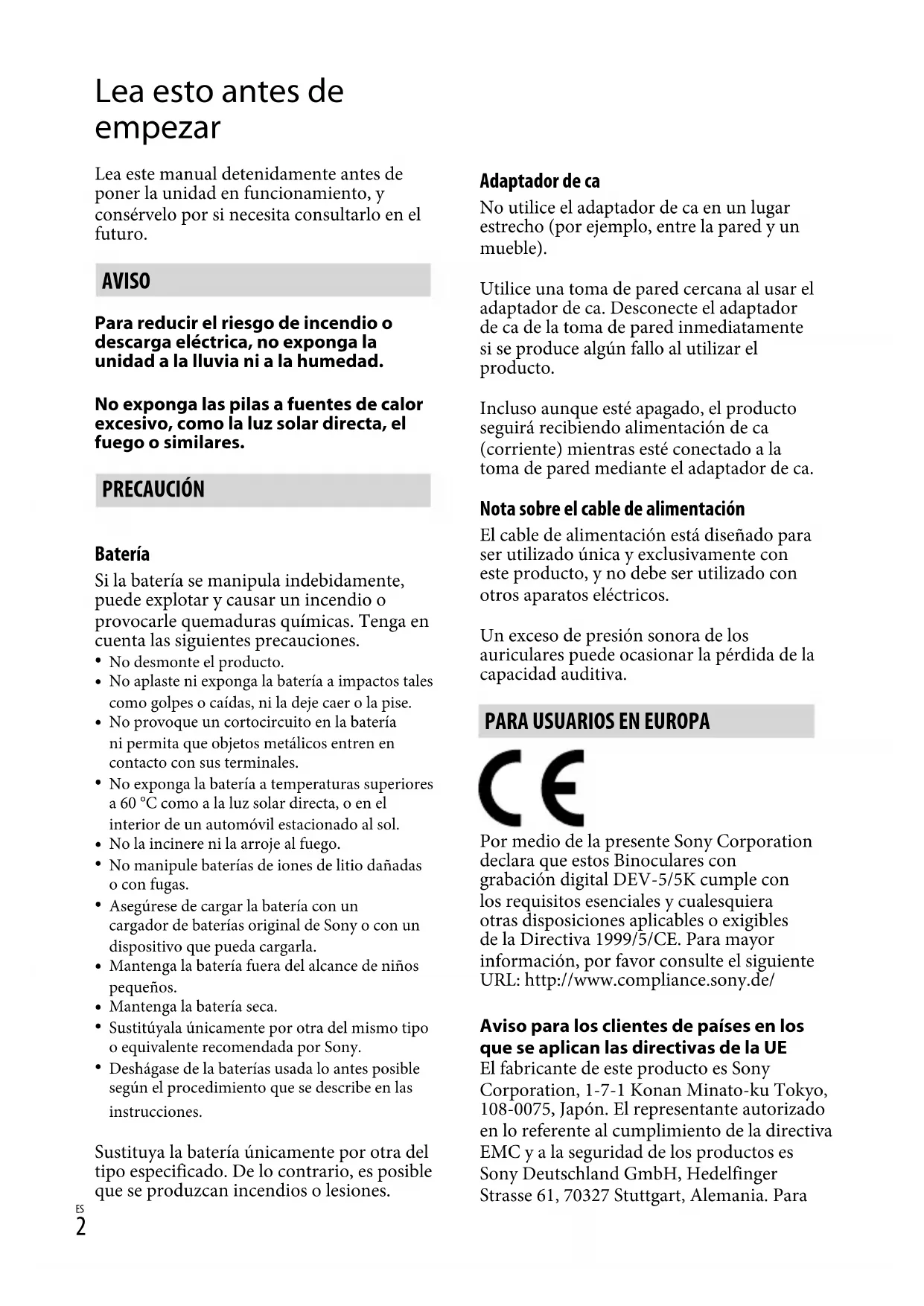 Por medio de la presente Sony Corporation declara que这些东西 Binoculares con grabacion digital DEV-5/5K cumple con los requisitos esencias y cualesquiera otheras dispositions aplicables o exigibles de la Directiva 1999/5/CE. Para mayor informacion, por favor consulte el numero URL: http://www.compliance.sony.de/