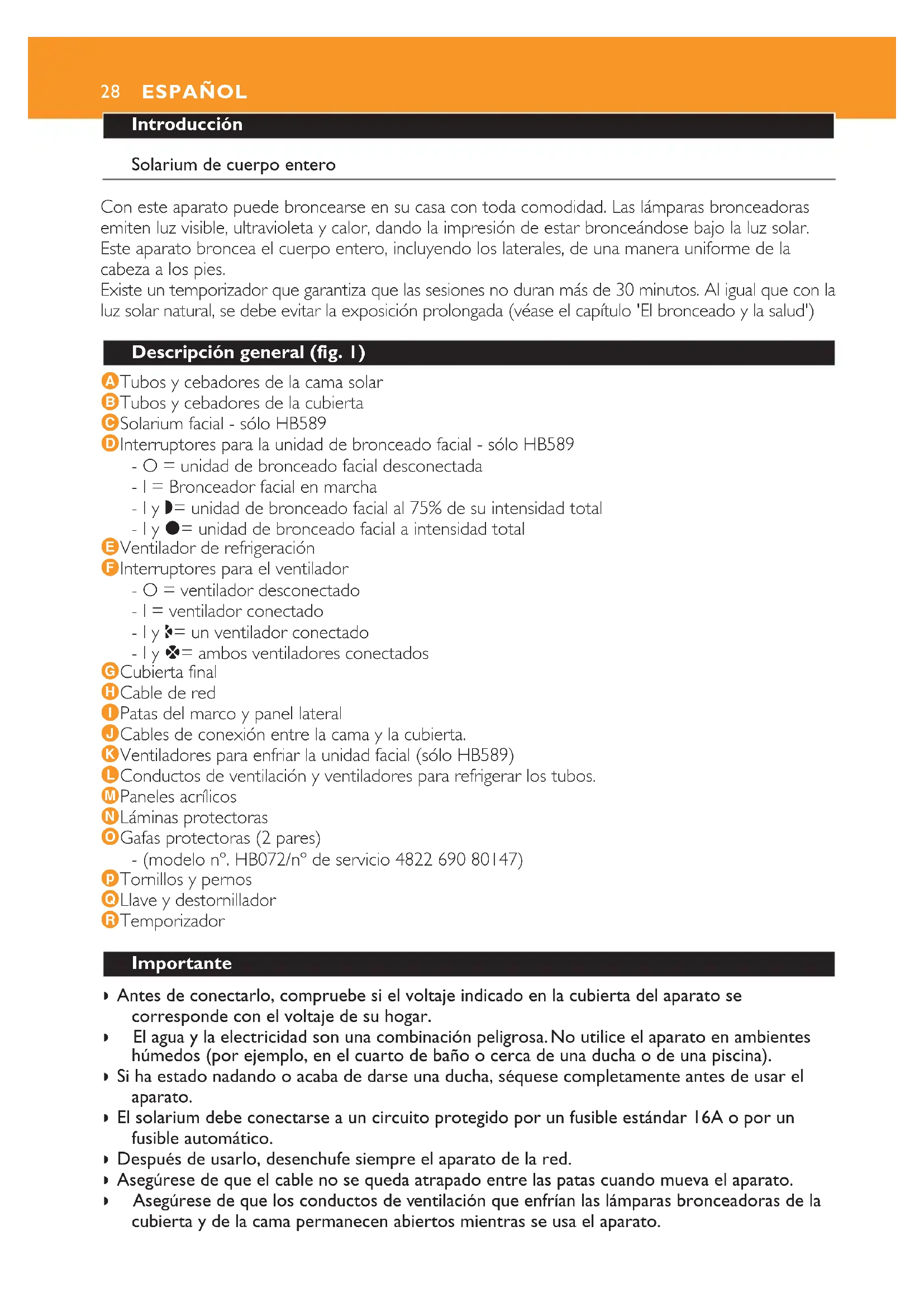 Nota: también puede limpiar el panel acrílico si lo desea. 6 En principio, los tubos y los cebadores de la cubierta se pueden sustituir de la misma manera. Los cebadores están colocados en uno de los extremos de los tubos. 7 Para quitar los tubos, gírelos hacia la izquierda o la derecha para que pueda sacarlos de su soporte. 8 Los cebadores se sacan girándolos hacia la izquierda. 9 Para volver a montar el aparato, inserte los tubos y/o cebadores nuevos y siga la instrucciones anteriores, pero al revés. 10 No olvide volver a poner los tornillos en la cubierta final. ◗ Sólo modelo HB589 Las lámparas HPA del solarium facial sólo se pueden sustituir en un centro de servicio autorizado por Philips. ESPAÑOL33 Medio ambiente Los tubos del aparato contienen sustancias que pueden ser nocivas para el medio ambiente. Cuando deseche los tubos, no los tire junto con el resto de desperdicios domésticos sino en un lugar especialmente destinado a este fin. ◗ Cuando vaya a deshacerse de este aparato, no lo tire con la basura normal del hogar; deposítelo en un punto de recogida oficial para su reciclado.Al hacerlo, contribuirá a preservar el medio ambiente (fig. 18). Garantía y servicio Si necesitan servicio o información, o si tienen algún problema, visiten la página Web de Philips en www.philips.com, o contacten con el Servicio Philips de Información al Consumidor de su país (Encontrarán el número de teléfono en el folleto de Garantía Mundial). Si en su país no hay Servicio Philips de Información al Consumidor, consulten a su distribuidor local Philips o contacten con el Service Department of Philips Domestic Appliances and Personal Care BV. Restricciones de la garantía La garantía internacional no cubre las siguientes piezas: - Tubos - láminas acrílicas, costes de limpieza incluidos ESPAÑOL Causas posibles El enchufe no se ha insertado correctamente en la clavija de la pared. Hay un problema de alimentación. Compruebe si funciona la fuente de alimentación conectando otro aparato. No ha programado el temporizador. No se ha insertado correctamente el cable de conexión (J). Compruebe los fusibles del circuito al que está conectado el aparato. El tipo de fusible adecuado es un fusible estándar 16A o un fusible automático. Está utilizando un cable alargador demasiado largo o que no tiene la corriente adecuada. Consulte a su distribuidor. Nuestro consejo general es que no utilice cables alargadores. No está siguiendo la tabla de bronceado adecuada para su tipo de piel. Consulte la tabla 'Sesiones de bronceado: frecuencia y duración'. Después de utilizar durante mucho tiempo los tubos, la emisión de rayos UV disminuye. Este efecto sólo es evidente pasados algunos años. Puede solucionar este problema seleccionando un tiempo de bronceado mayor o sustituyendo los tubos. Problema El aparato no se enciende. La cubierta funciona, pero la cama no. El fusible corta la corriente al conectar el aparato o mientras se está usando. Pobres resultados de broceado Guía de problemas y soluciones Si el aparato no se instala o no se usa tal y como indican estas instrucciones, puede que no funcione correctamente. En ese caso será capaz de resolver usted mismo el problema siguiendo los consejos que se exponen a continuación. Si el problema no aparece mencionado en la lista, puede que el aparato no funcione bien porque esté defectuoso. En ese caso, le aconsejamos que se ponga en contacto con su distribuidor o con un centro de servicio de Philips.34