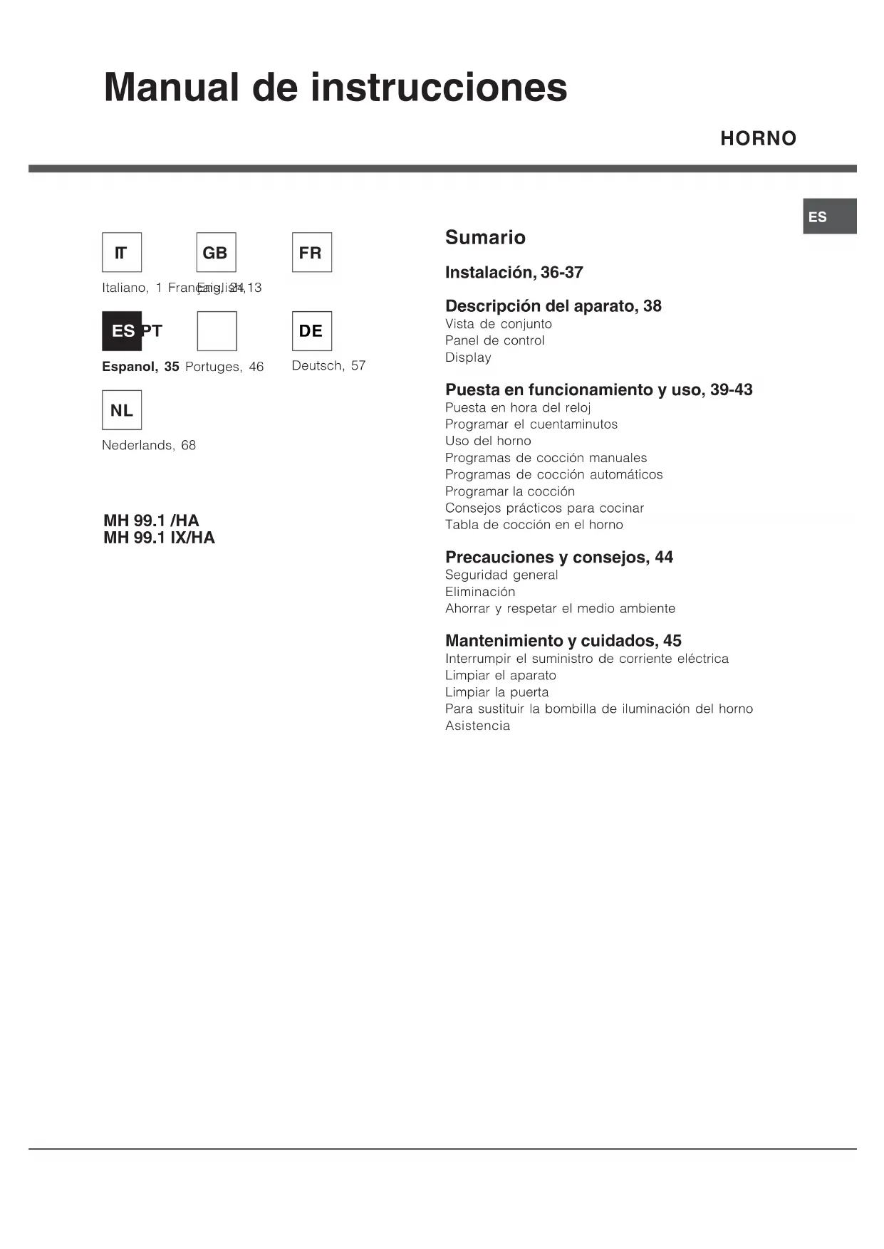 - Son numéro de série (S/N) Ces informations figurent sur la plaque signalétique apposée sur l’appareilES HORNO MH 99.1 /HA MH 99.1 IX/HA Sumario Instalación, 36-37 Descripción del aparato, 38 Vista de conjunto Panel de control Display Puesta en funcionamiento y uso, 39-43 Puesta en hora del reloj Programar el cuentaminutos Uso del horno Programas de cocción manuales Programas de cocción automáticos Programar la cocción Consejos prácticos para cocinar Tabla de cocción en el horno Precauciones y consejos, 44 Seguridad general Eliminación Ahorrar y respetar el medio ambiente Mantenimiento y cuidados, 45 Interrumpir el suministro de corriente eléctrica Limpiar el aparato Limpiar la puerta Para sustituir la bombilla de iluminación del horno Asistencia Manual de instrucciones Italiano, 1 Français, 24 Espanol, 35 Portuges, 46 English,13
