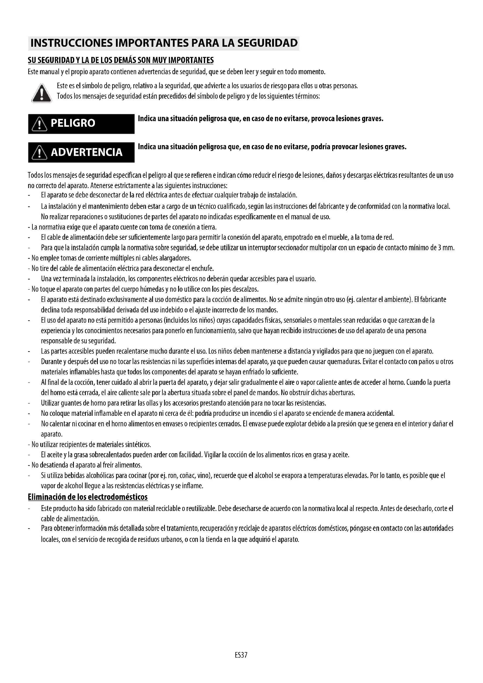 SU SEGURIDAD Y LA DE LOS DEMÁS SON MUY IMPORTANTES Este manual y el propio aparato contienen advertencias de seguridad, que se deben leer y seguir en todo momento. Todos los mensajes de seguridad especifican el peligro al que se refieren e indican cómo reducir el riesgo de lesiones, daños y descargas eléctricas resultantes de un uso no correcto del aparato. Atenerse estrictamente a las siguientes instrucciones: - El aparato se debe desconectar de la red eléctrica antes de efectuar cualquier trabajo de instalación. - La instalación y el mantenimiento deben estar a cargo de un técnico cualificado, según las instrucciones del fabricante y de conformidad con la normativa local. No realizar reparaciones o sustituciones de partes del aparato no indicadas específicamente en el manual de uso. - La normativa exige que el aparato cuente con toma de conexión a tierra. - El cable de alimentación debe ser suficientemente largo para permitir la conexión del aparato, empotrado en el mueble, a la toma de red. - Para que la instalación cumpla la normativa sobre seguridad, se debe utilizar un interruptor seccionador multipolar con un espacio de contacto mínimo de 3 mm. - No emplee tomas de corriente múltiples ni cables alargadores. - No tire del cable de alimentación eléctrica para desconectar el enchufe. - Una vez terminada la instalación, los componentes eléctricos no deberán quedar accesibles para el usuario. - No toque el aparato con partes del cuerpo húmedas y no lo utilice con los pies descalzos. - El aparato está destinado exclusivamente al uso doméstico para la cocción de alimentos. No se admite ningún otro uso (ej. calentar el ambiente). El fabricante declina toda responsabilidad derivada del uso indebido o el ajuste incorrecto de los mandos. - El uso del aparato no está permitido a personas (incluidos los niños) cuyas capacidades físicas, sensoriales o mentales sean reducidas o que carezcan de la experiencia y los conocimientos necesarios para ponerlo en funcionamiento, salvo que hayan recibido instrucciones de uso del aparato de una persona responsable de su seguridad. - Las partes accesibles pueden recalentarse mucho durante el uso. Los niños deben mantenerse a distancia y vigilados para que no jueguen con el aparato. - Durante y después del uso no tocar las resistencias ni las superficies internas del aparato, ya que pueden causar quemaduras. Evitar el contacto con paños u otros materiales inflamables hasta que todos los componentes del aparato se hayan enfriado lo suficiente. - Al final de la cocción, tener cuidado al abrir la puerta del aparato, y dejar salir gradualmente el aire o vapor caliente antes de acceder al horno. Cuando la puerta del horno está cerrada, el aire caliente sale por la abertura situada sobre el panel de mandos. No obstruir dichas aberturas. - Utilizar guantes de horno para retirar las ollas y los accesorios prestando atención para no tocar las resistencias. - No coloque material inflamable en el aparato ni cerca de él: podría producirse un incendio si el aparato se enciende de manera accidental. - No calentar ni cocinar en el horno alimentos en envases o recipientes cerrados. El envase puede explotar debido a la presión que se genera en el interior y dañar el aparato. - No utilizar recipientes de materiales sintéticos. - El aceite y la grasa sobrecalentados pueden arder con facilidad. Vigilar la cocción de los alimentos ricos en grasa y aceite. - No desatienda el aparato al freír alimentos. - Si utiliza bebidas alcohólicas para cocinar (por ej. ron, coñac, vino), recuerde que el alcohol se evapora a temperaturas elevadas. Por lo tanto, es posible que el vapor de alcohol llegue a las resistencias eléctricas y se inflame. Eliminación de los electrodomésticos - Este producto ha sido fabricado con material reciclable o reutilizable. Debe desecharse de acuerdo con la normativa local al respecto. Antes de desecharlo, corte el cable de alimentación. - Para obtener información más detallada sobre el tratamiento, recuperación y reciclaje de aparatos eléctricos domésticos, póngase en contacto con las autoridades locales, con el servicio de recogida de residuos urbanos, o con la tienda en la que adquirió el aparato.