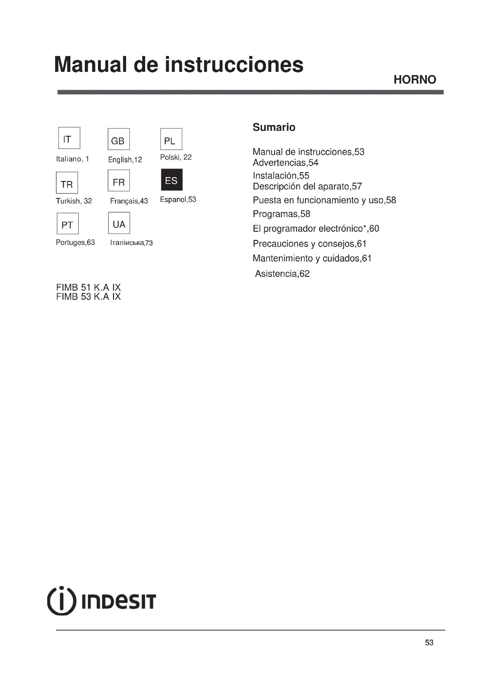 Manual de instrucciones HORNO Sumario Manual de instrucciones,53 Advertencias,54 Asistencia,62 Descripción del aparato,57 Instalación,55 Puesta en funcionamiento y uso,58 Programas,58 El programador electrónico*,60 Precauciones y consejos,61 Mantenimiento y cuidados,61