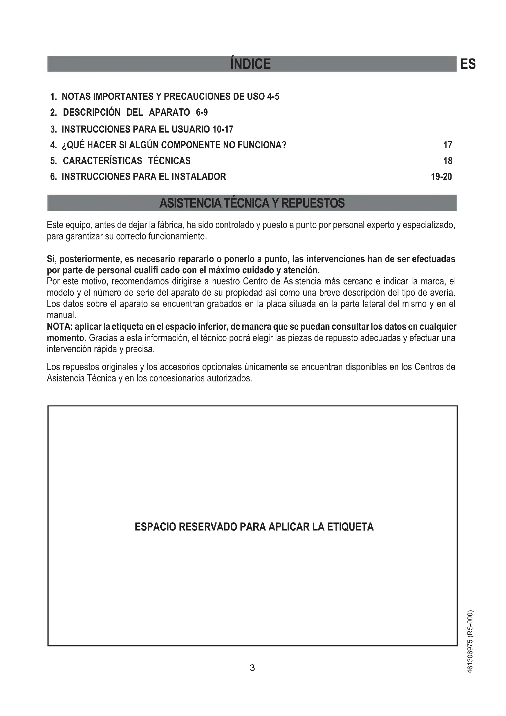 Este equipo, antes de dejar la fábrica, ha sido controlado y puesto a punto por personal experto y especializado, para garantizar su correcto funcionamiento. Si, posteriormente, es necesario repararlo o ponerlo a punto, las intervenciones han de ser efectuadas por parte de personal cualifi cado con el máximo cuidado y atención. Por este motivo, recomendamos dirigirse a nuestro Centro de Asistencia más cercano e indicar la marca, el modelo y el número de serie del aparato de su propiedad así como una breve descripción del tipo de avería. Los datos sobre el aparato se encuentran grabados en la placa situada en la parte lateral del mismo y en el manual. NOTA: aplicar la etiqueta en el espacio inferior, de manera que se puedan consultar los datos en cualquier momento. Gracias a esta información, el técnico podrá elegir las piezas de repuesto adecuadas y efectuar una intervención rápida y precisa. Los repuestos originales y los accesorios opcionales únicamente se encuentran disponibles en los Centros de Asistencia Técnica y en los concesionarios autorizados.