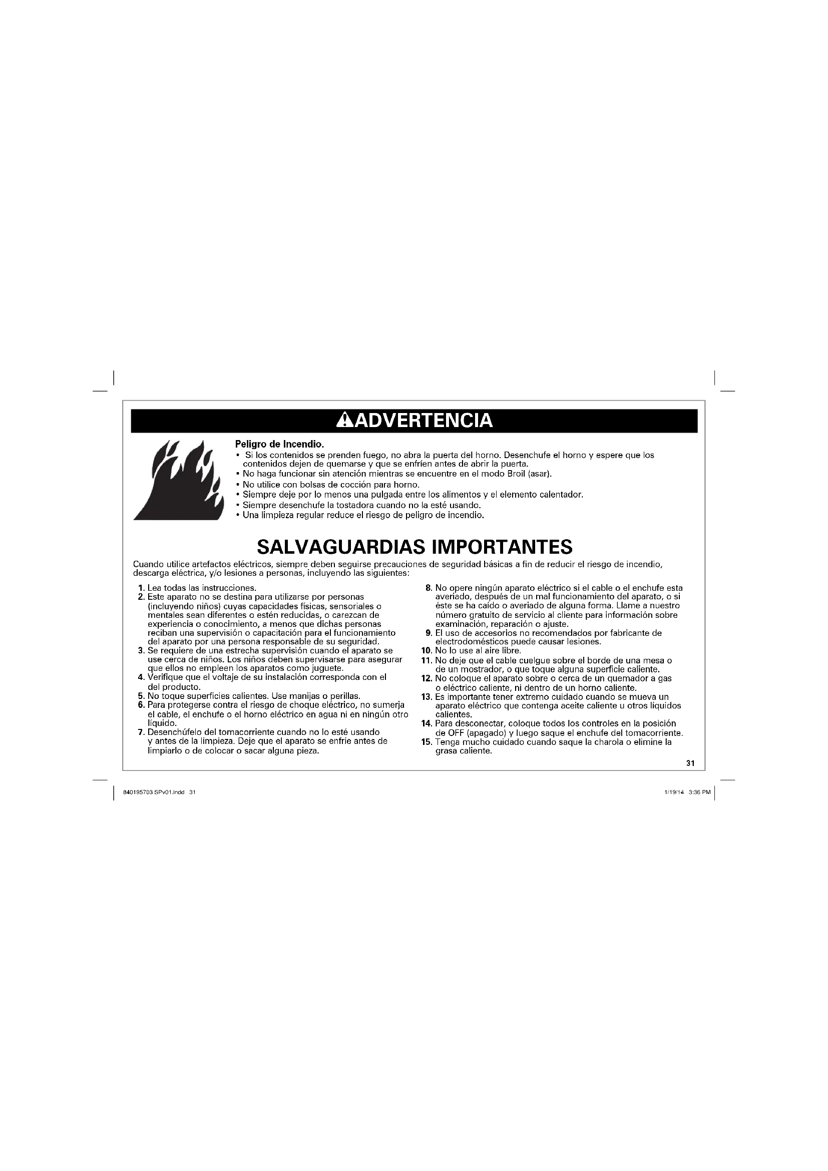 840195703 SPv01.indd 31840195703 SPv01.indd 31 1/19/14 3:36 PM1/19/14 3:36 PM¡GUARDE ESTAS INSTRUCCIONES! Información para la Seguridad del Consumidor Este aparato ha sido diseñado solamente para uso doméstico. ¡ADVERTENCIA! Peligro de Descarga Eléctrica: Este aparato cuenta con un enchufe polarizado (una pata más ancha) que reduce el riesgo de una descarga eléctrica. El enchufe embona únicamente en una dirección dentro de un tomacorriente polarizado. No trate de obviar el propósito de seguridad del enchufe modificándolo de alguna manera o utilizando un adaptador. Si el enchufe no entra completamente en la toma, invierta el enchufe. Si aún no entra, haga que un eléctricista reemplace la toma. El largo del cable que se usa en este aparato fue seleccionado para reducir el peligro de que alguien se enganche o tropiece con un cable más largo. Si es necesario usar un cable más largo, se podrá usar un cable de extensión aprobado. La clasificación eléctrica nominal del cable de extensión debe ser igual o mayor que la clasificación nominal del aparato. Es importante tener cuidado de colocar el cable de extensión para que no se pliegue sobre el mostrador o la mesera en donde niños puedan tirar del mismo o tropezarse accidentalmente. Este aparato viene equipado con una puerta de seguridad de vidrio totalmente templado. El vidrio templado es cuatro veces más fuerte que el vidrio común y más resistente a las roturas. El vidrio templado se puede romper, sin embargo se rompe en trozos sin bordes filosos. Es importante tener cuidado para evitar rayar la superficie de la puerta o hacer muescas en los bordes. Si la puerta está rayada o tiene muescas, llame a nuestro número gratuito de servicio al cliente. Siempre desenchufe el horno eléctrico del tomacorriente cuando no lo esté usando.