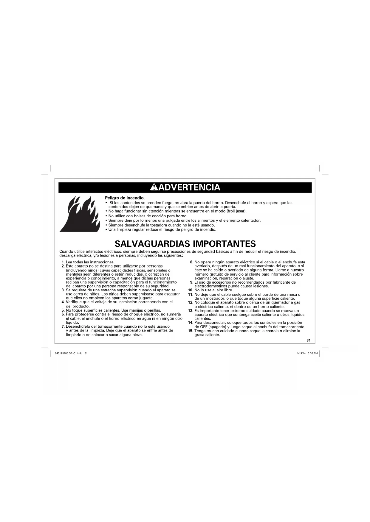 840195703 SPv01.indd 31840195703 SPv01.indd 31 1/19/14 3:36 PM1/19/14 3:36 PM¡GUARDE ESTAS INSTRUCCIONES! Información para la Seguridad del Consumidor Este aparato ha sido diseñado solamente para uso doméstico. ¡ADVERTENCIA! Peligro de Descarga Eléctrica: Este aparato cuenta con un enchufe polarizado (una pata más ancha) que reduce el riesgo de una descarga eléctrica. El enchufe embona únicamente en una dirección dentro de un tomacorriente polarizado. No trate de obviar el propósito de seguridad del enchufe modificándolo de alguna manera o utilizando un adaptador. Si el enchufe no entra completamente en la toma, invierta el enchufe. Si aún no entra, haga que un eléctricista reemplace la toma. El largo del cable que se usa en este aparato fue seleccionado para reducir el peligro de que alguien se enganche o tropiece con un cable más largo. Si es necesario usar un cable más largo, se podrá usar un cable de extensión aprobado. La clasificación eléctrica nominal del cable de extensión debe ser igual o mayor que la clasificación nominal del aparato. Es importante tener cuidado de colocar el cable de extensión para que no se pliegue sobre el mostrador o la mesera en donde niños puedan tirar del mismo o tropezarse accidentalmente. Este aparato viene equipado con una puerta de seguridad de vidrio totalmente templado. El vidrio templado es cuatro veces más fuerte que el vidrio común y más resistente a las roturas. El vidrio templado se puede romper, sin embargo se rompe en trozos sin bordes filosos. Es importante tener cuidado para evitar rayar la superficie de la puerta o hacer muescas en los bordes. Si la puerta está rayada o tiene muescas, llame a nuestro número gratuito de servicio al cliente. Siempre desenchufe el horno eléctrico del tomacorriente cuando no lo esté usando.