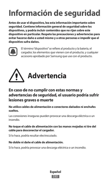 Información de seguridad Antes de usar el dispositivo, lea esta información importante sobre seguridad. Contiene información general de seguridad sobre los dispositivos, y podría incluir contenidos que no rijan sobre este dispositivo en particular. Respete las precauciones y advertencias para evitar hacerse daño a usted mismo y a otras personas e impedir que el dispositivo sufra daños. El término “dispositivo” se refiere al producto y la batería, el cargador, los elementos que vienen con el producto, y cualquier accesorio aprobado por Samsung que use con el producto. Advertencia En caso de no cumplir con estas normas y advertencias de seguridad, el usuario podría sufrir lesiones graves o muerte No utilice cables de alimentación o conectores dañados ni enchufes sueltos. Las conexiones inseguras pueden provocar una descarga eléctrica o un incendio. No toque el cable de alimentación con las manos mojadas ni tire del cable para desconectar el cargador. Si lo hace, podría resultar electrocutado. No doble ni dañe el cable de alimentación. Si lo hace, podría provocar una descarga eléctrica o un incendio. Español