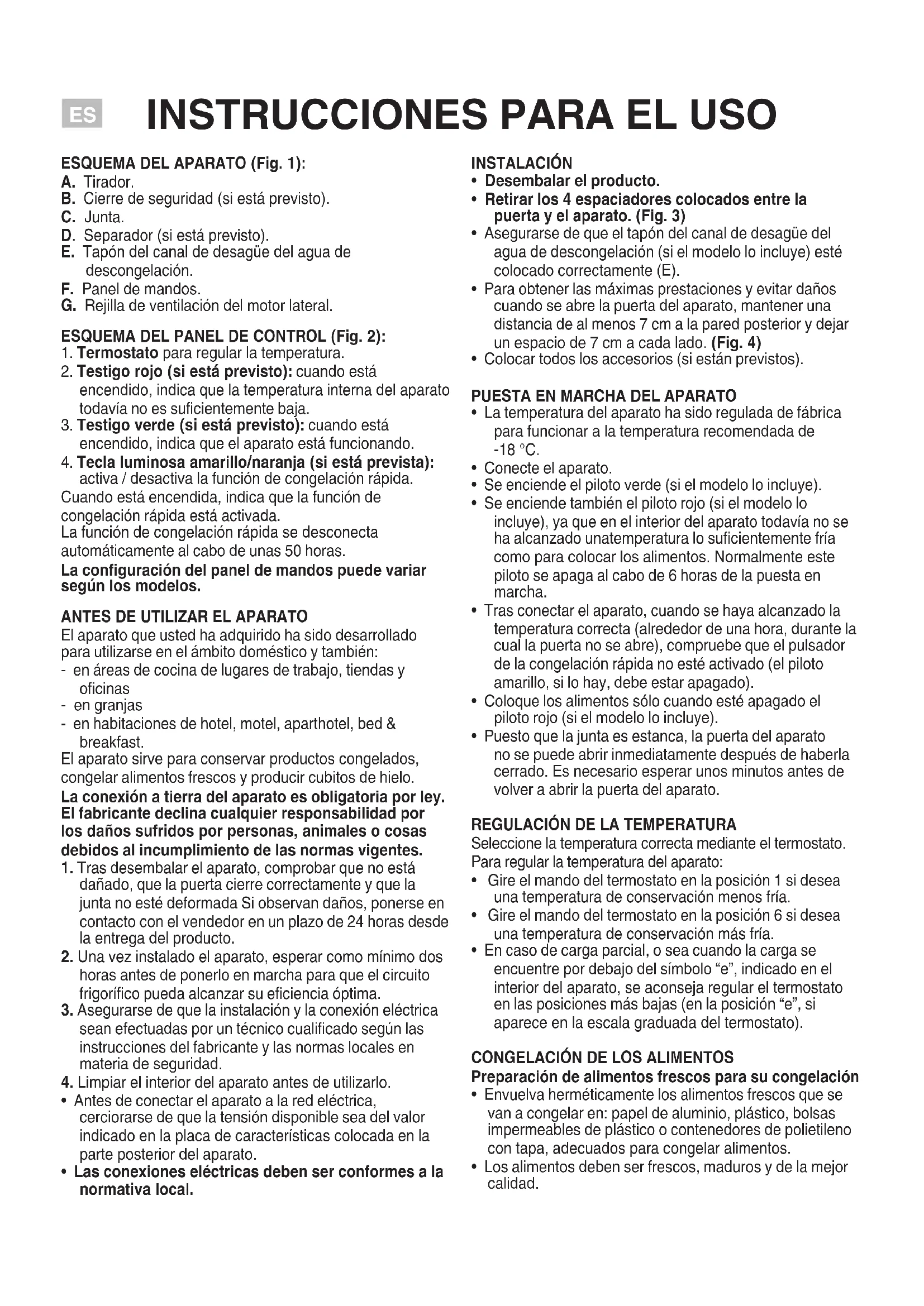 ESQUEMA DEL APARATO (Fig. 1): A. Tirador. B. Cierre de seguridad (si está previsto). C. Junta. D. Separador (si está previsto). E. Tapón del canal de desagüe del agua de descongelación. F. Panel de mandos. G. Rejilla de ventilación del motor lateral. ESQUEMA DEL PANEL DE CONTROL (Fig. 2):
