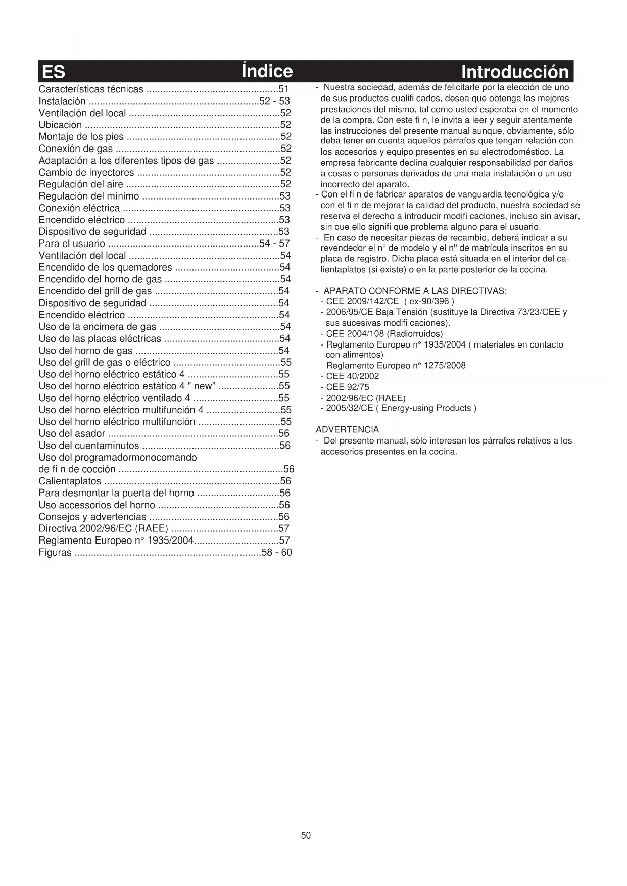 - Este aparato no es destinado al uso de parte de personas (inclu- idos los niños) con reducidas capacidades psíquicas o motoras, o con falta de experiencia y conocimiento, a menos que haya una supervisión o instrucción sobre el uso del aparato de parte de una persona responsable para sus seguridad. Los niños deben ser vigilados para asegurarse que no jueguen con el aparato. - Cualquier manipulación al interior del horno o donde se pueda acceder a partes sometidas a tensión debe ir precedida de la desconexión de la corriente eléctrica. - No utilizar el espacio calientaplatos para dejar líquidos infl ama- bles u objetos que se resientan del calor como la madera, el papel, los envases a presión, mecheros, etc. - Controlar frecuentemente el tubo de goma. Comprobar que esté lo sufi cientemente alejado de paredes calientes, que no haga curvas bruscas ni pliegues y que se encuentre en buenas condiciones. El tubo debe cambiarse como maximo dentro de la fecha indicada y debe fi jarse a ambos extremos con abrazaderas de manguera normalizadas. - En caso de que el giro de las espitas se difi culte con el tiempo, contactar con el Servicio de Asistencia Técnica. - Las partes esmaltadas o cromadas se lavan con agua tibia con jabón o con detergentes no abrasivos. Para los quemadores superiores y las coronas, se puede usar también un cepillo metálico. Secar cuidadosamente. - No usar abrasivos para limpiar las partes esmaltadas o cromadas. - Cuando lave la encimera, evite inundarla de agua. Tenga cuidado de que no entre agua en los agujeros de los quemadores ya que podría resultar peligroso. - Las bujías de encendido eléctrico deben mantenerse limpias y secas después de cada uso, sobre todo si se han manchado con el contenido de las ollas. - En caso de tapa de cristal: no cerrarla mientras los quema- dores y las placas eléctricas de la encimera estén calientes porque podría dañarse o romperse. - No golpear las partes esmaltadas ni las bujías de encendido (si hay). - Cuando la cocina no esté funcionando, aconsejamos cerrar la llave central (o mural) del gas. - No usar la manija para desplazar la cocina. - No usar para la limpieza materiales ásperos abrasivos ni rasque- tas metálicas afi ladas para limpiar las puertas de vidrio del horno, dado que podrían rayar la superfi cie e incluso romper el vidrio. - No utilizar limpiadores a vapor para la limpieza del aparato. - No está previsto un pedestal para efectuar la instalación de la cocina. Para el usuario ES57 ATENÇÃO: o uso de um aparelho a gás para cozinhar produz calor, umidade e produtos de combustão no local onde está instalado. Assegurar-se que a cozinha esteja bem ventilada especialmente quando o aparelho esta em função: manter os furos de ventilação natural abertos ou instalar um dispositivo de ventilação mecanica (capa de aspiração/ cabeça de sucção). ATENÇÃO: este aparelho deve ser usado somente para cozinhar. Não deve ser utilizado para outros fi ns, por exemplo para aque- cimento de ambientes. Se declina cualquier responsabilidad por daños a cosas o perso- nas derivados de una mala instalación o de un uso incorrecto de la cocina. En caso de anomalías y, sobre todo, si se advirtieran fugas de gas o de aire, llame al técnico inmediatamente. DIRECTIVA 2002/96/CE (RAEE): INFORMACIÓN PARA LOS USUARIOS Fig. A Esta información le será útil al usuario sólo en caso de que el símbolo ilustrado en la (Fig. A) fi gure en la etiqueta adhesiva apli- cada al producto (etiqueta de matrícula) en la que rezan los datos específi cos del propio producto: Este símbolo indica que el artículo está catalogado, según las normas vigentes, como aparato eléctrico o electrónico y resulta conforme con la Directiva EU 2002/96/CE (RAEE), por lo que, al término de su vida útil, obligatoriamente, deberá ser tratado por separado de los residuos domésticos y ser depositado gratuita- mente en un centro de recogida selectiva para aparatos eléctricos y electrónicos o bien devuelto al revendedor al comprar un nuevo aparato de tipo equivalente. El usuario será responsable de la entrega del aparato al fi nal de su vida útil a los centros de recogida correspondientes, so pena de las sanciones previstas por la legislación vigente en materia de eliminación de residuos. La adecuada recogida selectiva para la posterior destinación del aparato en desuso al reciclado, tratamiento y eliminación compat- ible con el respeto al medio ambiente contribuye a evitar posibles efectos negativos sobre el medio ambiente y la salud y favorece el reciclado de los materiales que componen el producto. Para más información acerca de los sistemas de recogida disponi- bles, dirigirse al servicio local de eliminación de residuos o a la tienda en la que se haya efectuado la adquisición. Los productores y los importadores cumplen con sus responsabi- lidades en relación con el reciclado, el tratamiento y la eliminación compatibles con el medio ambiente tanto directamente como participando en un sistema colectivo. REGLAMENTO EUROPEO n° 1935/2004 - materiales en con- tacto con alimentos. Información para los usuarios. El símbolo reproducido en la fi gura, presente en el envase, indica que los materiales que pueden entrar en contacto con los alimen- tos, en este producto, resultan conformes con lo dispuesto en el reglamento europeo n° 1935/2004. En el interior del horno los alimentos podrían entrar en contacto con: las rejillas del horno, bandejas graseras, planchas de pastelería, el cristal de la puerta del horno, las juntas de goma, asadores y las paredes del horno. En la cocina con: rejillas, quemadores y la propia encimera. En el compartimiento calientaplatos, con las propias paredes. Para el usuario ES58 Figure/Figures/Figures/ Risunki /Figuras/∂ÈÎfiÓ˜/Figuras A = AUSILIARIO = AUXILIAIRE = AUXILIARY = MALAQ = AUXILIAR = ‚ÔËıËÙÈÎfi˜ = AUXILIARSR = SEMIRAPIDO = SEMI-RAPIDE = SEMI-RAPID = SREDNQQ = SEMI-RÁPIDO