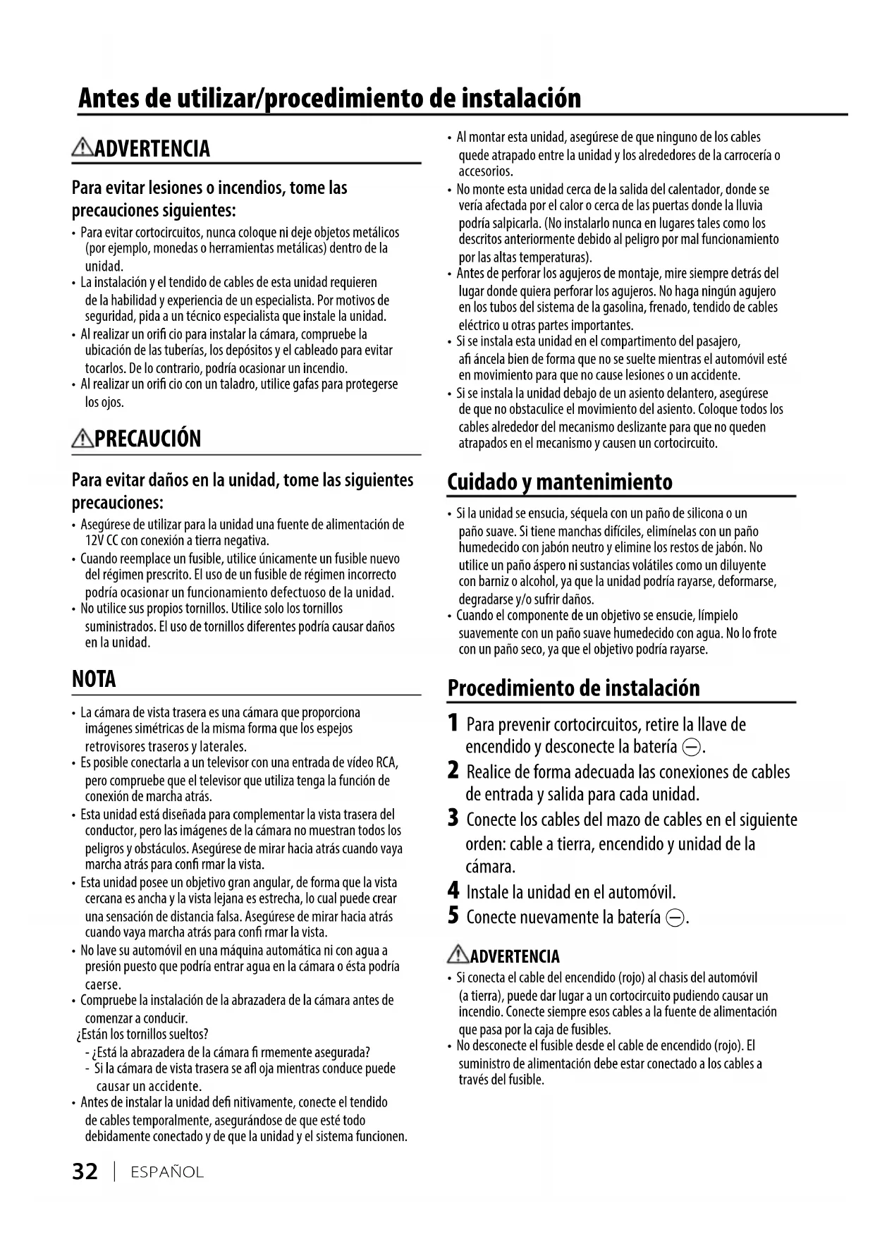- Si la unidad se ensucia, séquela con un paño de silicona o un paño suave. Si tiene manchas difíciles, elimínelas con un paño humedecido con jabón neutro y elimine los restos de jabón. No utilice un paño áspero ni sustancias volátiles como un diluyente con barniz o alcohol, ya que la unidad podría rayarse, deformarse, degradarse y/o sufrir daños.• Cuando el componente de un objetivo se ensucie, límpielo suavemente con un paño suave humedecido con agua. No lo frote con un paño seco, ya que el objetivo podría rayarse. Procedimiento de instalación 1 Para prevenir cortocircuitos, retire la llave de encendido y desconecte la batería -. 2 Realice de forma adecuada las conexiones de cables de entrada y salida para cada unidad. 3 Conecte los cables del mazo de cables en el siguiente orden: cable a tierra, encendido y unidad de la cámara. 4 Instale la unidad en el automóvil. 5 Conecte nuevamente la batería -. ADVERTENCIA• Si conecta el cable del encendido (rojo) al chasis del automóvil (a tierra), puede dar lugar a un cortocircuito pudiendo causar un incendio. Conecte siempre esos cables a la fuente de alimentación que pasa por la caja de fusibles.• No desconecte el fusible desde el cable de encendido (rojo). El suministro de alimentación debe estar conectado a los cables a través del fusible. ADVERTENCIA Para evitar lesiones o incendios, tome las precauciones siguientes: