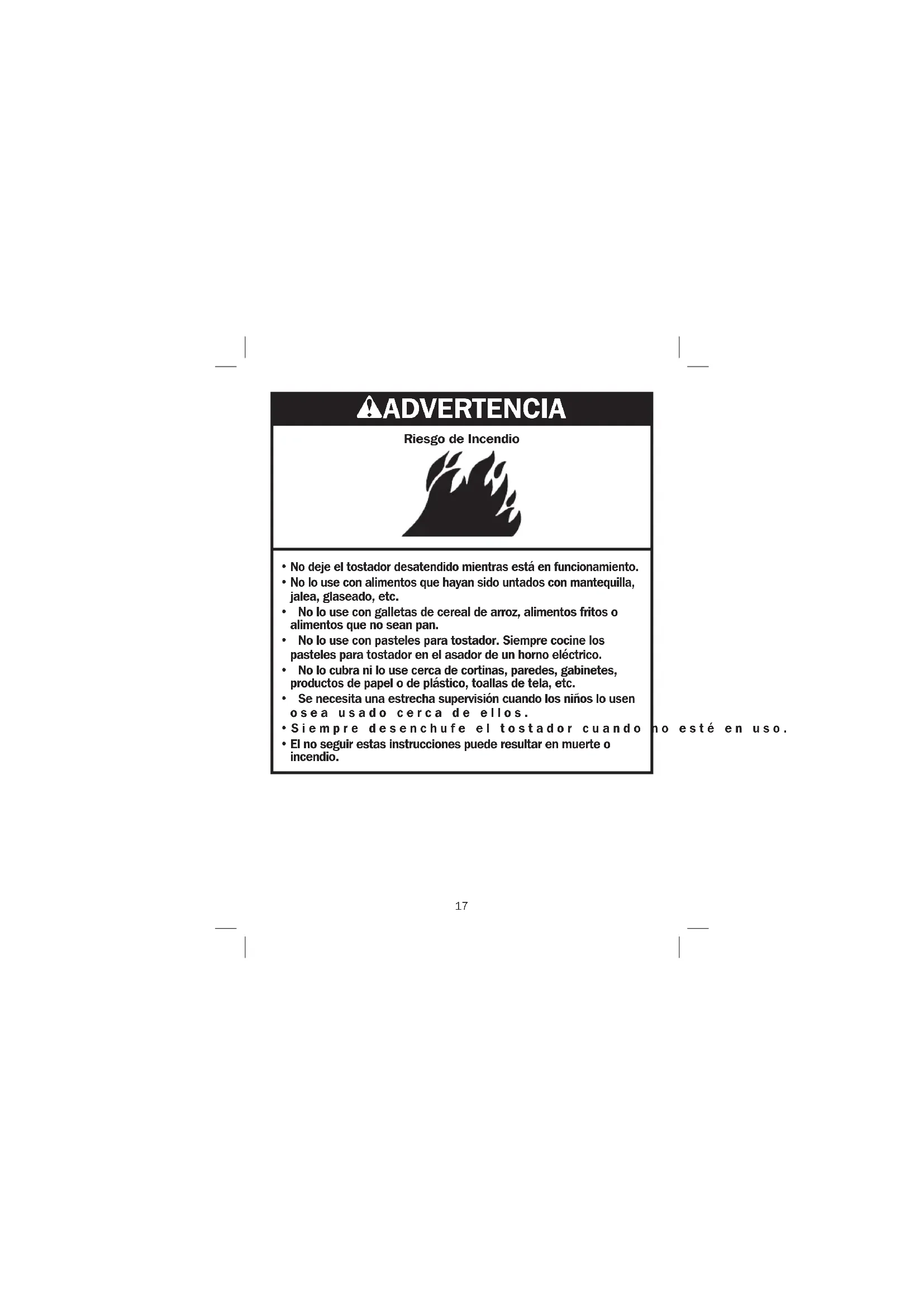 Puede ocurrir un incendio si la tostadora se usa para calentar galletas de arroz, alimentos fritos, elementos no panificados o pastelitos para tostadoras. Los pasteles para tostador deben calentarse en el asador de un horno eléctrico. No caliente ningún producto alimenticio que haya sido untado o bañado con margarina, mantequilla, jalea, glaseado, almíbar u otro producto para untar. Siga la Guía de Tostado.