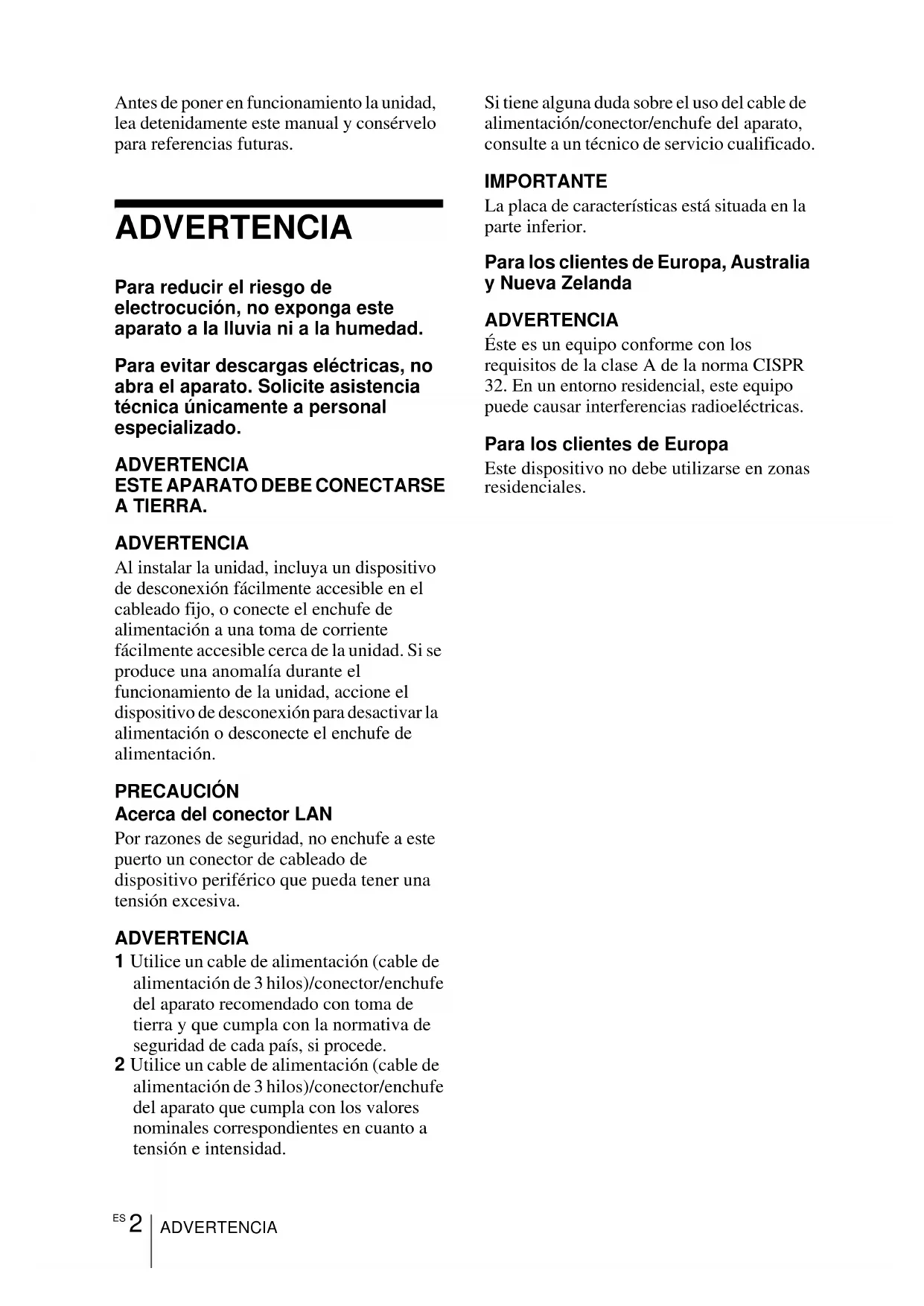 A TIERRA. ADVERTENCIA Al instalar la unidad, incluya un dispositivo de desconexión fácilmente accesible en el cableado fijo, o conecte el enchufe de alimentación a una toma de corriente fácilmente accesible cerca de la unidad. Si se produce una anomalía durante el funcionamiento de la unidad, accione el dispositivo de desconexión para desactivar la alimentación o desconecte el enchufe de alimentación. PRECAUCIÓN Acerca del conector LAN Por razones de seguridad, no enchufe a este puerto un conector de cableado de dispositivo periférico que pueda tener una tensión excesiva. ADVERTENCIA 1 Utilice un cable de alimentación (cable de alimentación de 3 hilos)/conector/enchufe del aparato recomendado con toma de tierra y que cumpla con la normativa de seguridad de cada país, si procede. 2 Utilice un cable de alimentación (cable de alimentación de 3 hilos)/conector/enchufe del aparato que cumpla con los valores nominales correspondientes en cuanto a tensión e intensidad. Si tiene alguna duda sobre el uso del cable de alimentación/conector/enchufe del aparato, consulte a un técnico de servicio cualificado. IMPORTANTE La placa de características está situada en la parte inferior. Para los clientes de Europa, Australia y Nueva Zelanda ADVERTENCIA Éste es un equipo conforme con los requisitos de la clase A de la norma CISPR