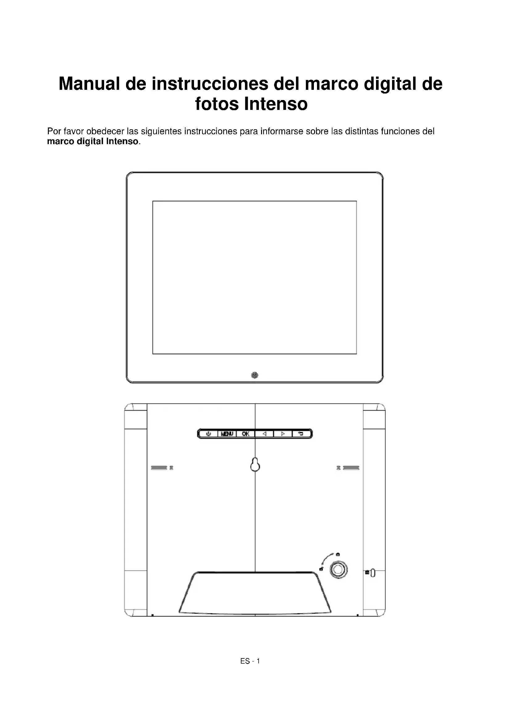 ¡Le deseamos que disfrute de su marco digital Intenso!ES - 8 Cuidado y Mantenimiento Cuidado Para evitar el riesgo de descarga eléctrica no retire ni los tornillos ni la carcasa. No utilice este aparato cerca del agua. No ponga en contacto al aparato ni con lluvia ni con humedad. No coloque cerca del aparato ningún objeto que almacene agua o cualquier otro t ipo de líquido. No instale este marco de fotos cerca de calefacciones, hornos o cualquier otro aparato que desprenda calor. No abra la carcasa. No intente reparar el aparato usted mismo. Déjelo en manos de personal cualificado. Evite su uso en lugares arenosos. Introduzca completamente el enchufe de conexión de la fuente de alimentación en la abertura del MD prevista. Solo de esta forma se puede evitar la carga electroestática. Conecte de manera correcta y segura todas las conexiones. No presione el display. Proteja al display de la radiación solar directa. El marco de fotos reproduce solo formatos de archivo compatibles. Las imágenes pueden estar protegidas por derecho a terceros. La reproducción sin licencia puede violar los derechos de copyright. No ponga en contacto el MD con objetos metálicos mientras se encuentra operativo. Evite su uso sobre cojines, sofás u otros objetos de salón que favorezcan el desarrollo de calor, puesto que existe riesgo de sobrecalentamiento. No retire la tarjeta de memoria mientras se está produciendo su lectura. De otro modo podría producirse la caída del sistema o la pérdida de datos. No apague el aparato mientras se está llevando a cabo la presentación. No empaquete el aparato justo después de un uso prolongado. Asegúrese de que se enfríe lo suficiente. En caso contrario existe el riesgo de sobrecalentamiento. Para garantizar un mejor servicio pueden producirse cambios en el manual de instrucciones.