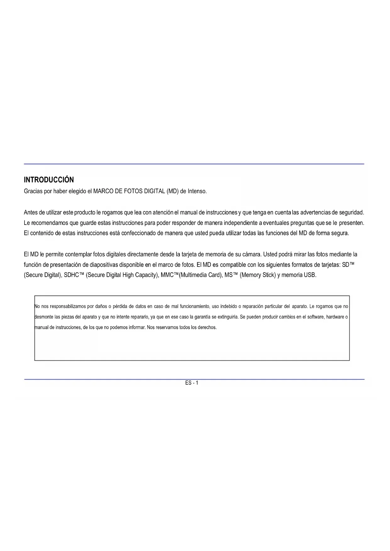 ¿Por qué es inferior la capacidad real de una tarjeta de memoria que la que aparece en su embalaje? La información de la capacidad de memoria de un soporte de memoria flash se ofrece de la misma manera que la información de la capacidad de un disco duro y ello está sujeto a la directiva del SI (International System of Units). Este sistema no utiliza el sistema binario de medida, según el cual 1024 MB se calculan como 1 GB. El estándar SI mide en potencias de 1000, según lo cual, por ejemplo 1000 Megabyte equivalen a 1 Gigabyte. Debido a estas diferencias de cálculo se producen tales diferencias en cuanto a la información dada sobre la capacidad. ¿Por qué el MD no muestra algunas imágenes de mi tarjeta de memoria? Algunos soportes de memoria no muy generalizados no son compatibles con el MD. Le rogamos que utilice una tarjeta compatible. No olvide que este marco de fotos solo puede reproducir imágenes en formato de archivo “JPEG”. He introducido una tarjeta de memoria. No obstante, el MD no puede leerla. ¿Qué puedo hacer? En primer lugar, compruebe que esa tarjeta es compatible con el MARCO DE FOTOS DIGITAL de Intenso. A continuación, asegúrese de que la tarjeta haya sido introducida en la ranura para tarjetas del modo correcto. Tenga también en cuenta que solo se pueden reproducir imágenes en formato de archivo “JPEG”. Tenga en consideración: algunas cámaras digitales no graban las imágenes en el formato estándar JPEG. En este caso consulte las instrucciones de uso de su cámara. ¿Por qué algunas imágenes se cargan antes que otras? imágenes con una alta resolución necesitan más tiempo para ser visualizadas. Para acelerar la velocidad de visualización utilice fotos con una resolución más baja. Advertencia: El marco de fotos soporta una resolución de hasta 8000*8000 píxel.ES - 33 ¿Por qué no se inicia el software a pesar de que existe suministro de corriente y la potencia está “on”? Probablemente se haya producido un error en el sistema. Reinicie el software cortando durante un par de segundos el suministro de energía. ¿Por qué no se muestra el menú principal en el display? Compruebe si el MD está correctamente conectado a un enchufe y si el interruptor de potencia se encuentra en “on”. ¿Puedo hacer rotar imágenes en el display? Sí, utilice el Menú OSD. Pulse la tecla [OSD] en el mando a distancia o la tecla [M] en el MD mientras mira imágenes o una presentación de diapositivas. El menú OSD aparece en la pantalla. Tenga en consideración: La imagen rotada se mostrará otra vez en su aspecto original en una posterior visualización. ¿Puedo ajustar los colores de la imagen? No. Las configuraciones de color se efectúan durante la grabación de la foto. Es posible, no obstante, ajustar el brillo y el contraste del display. ¿Qué resolución deben de tener las imágenes para que se representen de forma óptima? La mejor resolución para este DN es 800 * 600 Píxel. ¿Por qué no funcionan las funciones conexión y desconexión automáticas a pesar de haberlas activado? Asegúrese de que ha configurado correctamente la hora. Si la hora programada está en el pasado la función se activará por primera vez al día siguiente. No deslice el interruptor que se encuentra en la parte posterior del MD a la posición de POWER OFF. Simplemente traslade el MD al modo standby.ES - 34