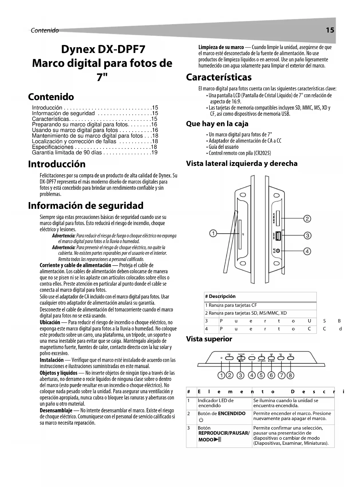 Felicitaciones por su compra de un producto de alta calidad de Dynex. Su DX-DPF7 representa el más moderno Diseño de Marcos digitales paraotos y está conocido para brindar un rendimiento confiable y sin problemas.