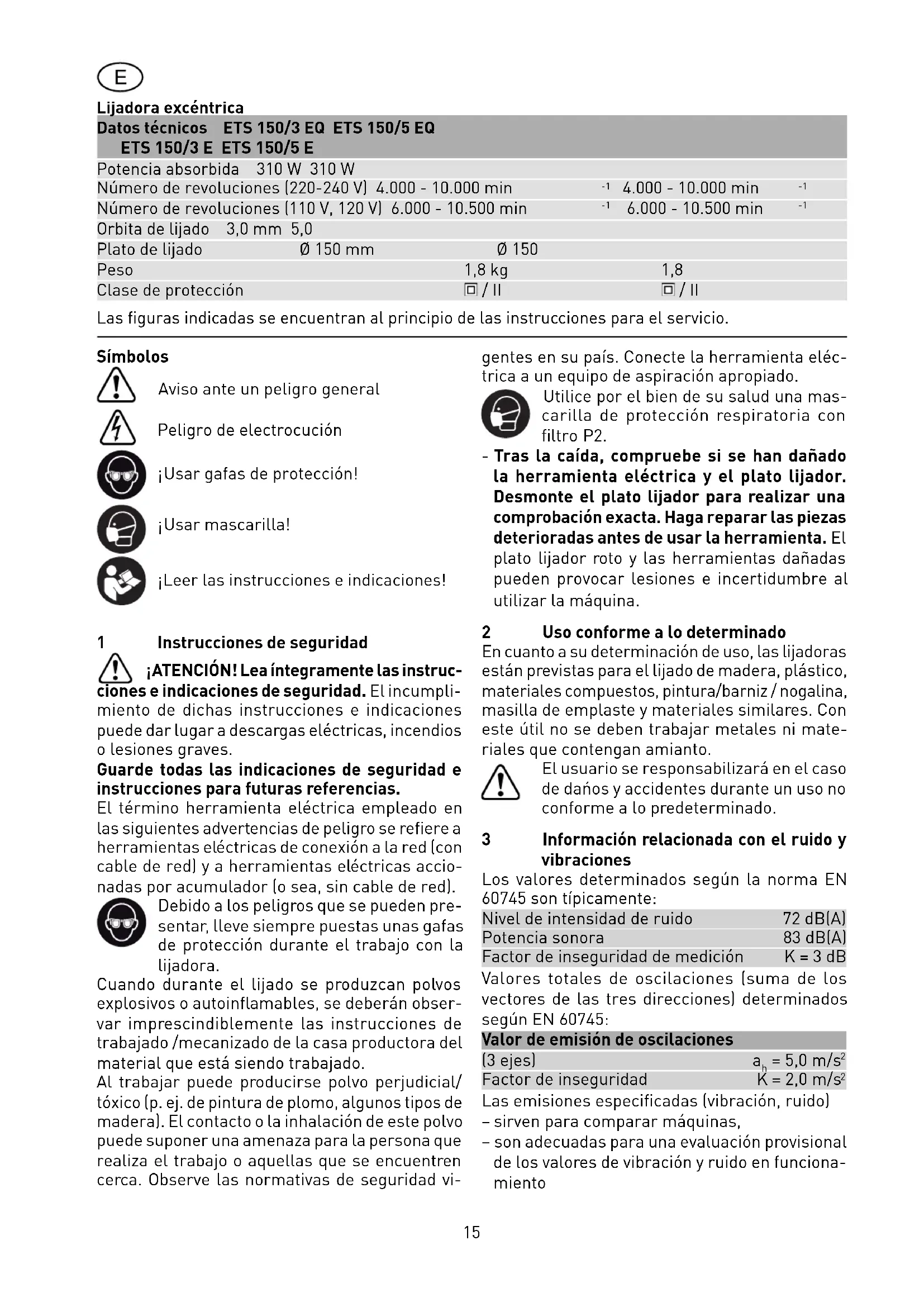 Usar mascarilla! ¡Leer las instrucciones e indicaciones! 1 Instrucciones de seguridad ¡ATENCIÓN! Lea íntegramente las instruc- ciones e indicaciones de seguridad. El incumpli- miento de dichas instrucciones e indicaciones puede dar lugar a descargas eléctricas, incendios o lesiones graves. Guarde todas las indicaciones de seguridad e instrucciones para futuras referencias. El término herramienta eléctrica empleado en las siguientes advertencias de peligro se refi ere a herramientas eléctricas de conexión a la red (con cable de red) y a herramientas eléctricas accio- nadas por acumulador (o sea, sin cable de red). Debido a los peligros que se pueden pre- sentar, lleve siempre puestas unas gafas de protección durante el trabajo con la lijadora. Cuando durante el lijado se produzcan polvos explosivos o autoinfl amables, se deberán obser- var imprescindiblemente las instrucciones de trabajado /mecanizado de la casa productora del material que está siendo trabajado. Al trabajar puede producirse polvo perjudicial/ tóxico (p. ej. de pintura de plomo, algunos tipos de madera). El contacto o la inhalación de este polvo puede suponer una amenaza para la persona que realiza el trabajo o aquellas que se encuentren cerca. Observe las normativas de seguridad vi- gentes en su país. Conecte la herramienta eléc- trica a un equipo de aspiración apropiado. Utilice por el bien de su salud una mas- carilla de protección respiratoria con fi ltro P2. - Tras la caída, compruebe si se han dañado la herramienta eléctrica y el plato lijador. Desmonte el plato lijador para realizar una comprobación exacta. Haga reparar las piezas deterioradas antes de usar la herramienta. El plato lijador roto y las herramientas dañadas pueden provocar lesiones e incertidumbre al utilizar la máquina. 2 Uso conforme a lo determinado En cuanto a su determinación de uso, las lijadoras están previstas para el lijado de madera, plástico, materiales compuestos, pintura/barniz / nogalina, masilla de emplaste y materiales similares. Con este útil no se deben trabajar metales ni mate- riales que contengan amianto. El usuario se responsabilizará en el caso de dańos y accidentes durante un uso no conforme a lo predeterminado. 3 Información relacionada con el ruido y vibraciones Los valores determinados según la norma EN 60745 son típicamente: Nivel de intensidad de ruido 72 dB(A) Potencia sonora 83 dB(A) Factor de inseguridad de medición K = 3 dB Valores totales de oscilaciones (suma de los vectores de las tres direcciones) determinados según EN 60745: Valor de emisión de oscilaciones (3 ejes) a