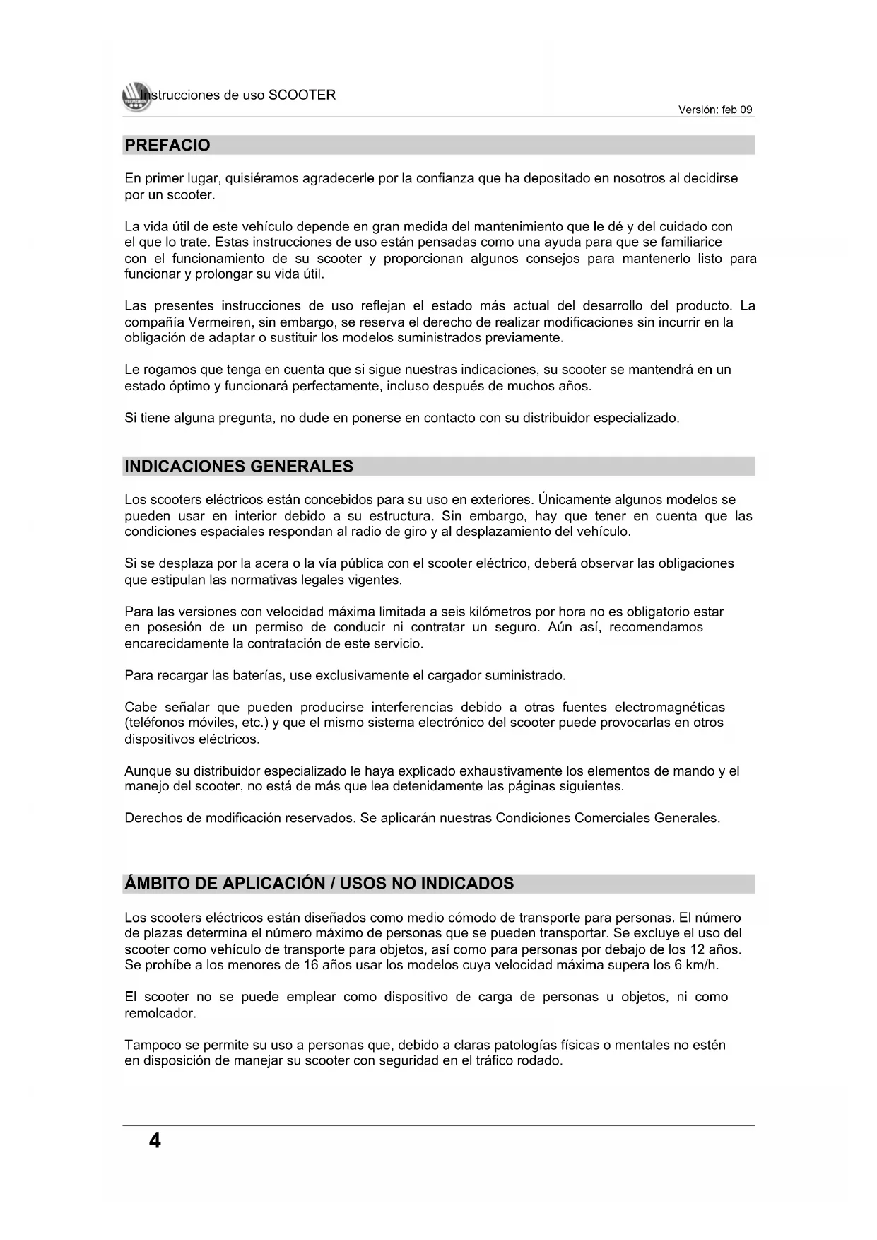 ÁMBITO DE APLICACIÓN / USOS NO INDICADOS Los scooters eléctricos están diseñados como medio cómodo de transporte para personas. El número de plazas determina el número máximo de personas que se pueden transportar. Se excluye el uso del scooter como vehículo de transporte para objetos, así como para personas por debajo de los 12 años. Se prohíbe a los menores de 16 años usar los modelos cuya velocidad máxima supera los 6 km/h. El scooter no se puede emplear como dispositivo de carga de personas u objetos, ni como remolcador. Tampoco se permite su uso a personas que, debido a claras patologías físicas o mentales no estén en disposición de manejar su scooter con seguridad en el tráfico rodado.Instrucciones de uso SCOOTER Versión: feb 09