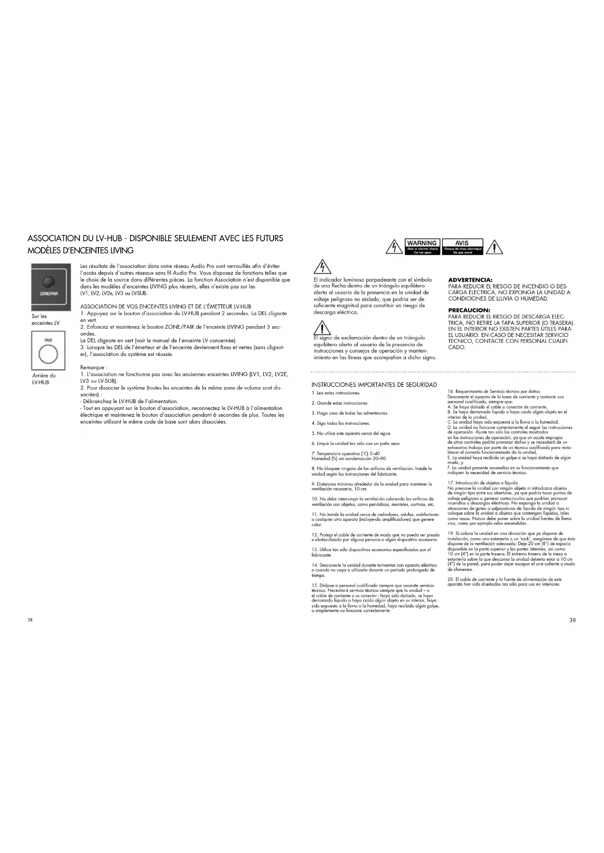 - Sonido totalmente inalámbrico de calidad de CD- Alcance inalámbrico de habitación a habitación: hasta 20 metros- Alcance inalámbrico en la misma habitación: hasta 50 metros- Alcance inalámbrico en campo abierto: hasta 100 metros- Compatible con Mac y PC- Banda de RF: 2,4 GHz- Frecuencia de muestreo: 48 KHz- Protocolo propietario dedicado 1 x LV-HUB 1 x mando a distancia 1 x fuente de alimentación 1 x USB a USB “B”, 1,5 m 1 x USB a mini USB, 2 m (Para la fuente de alimentación.) 1 x estéreo de 3,5 mm, 0,8 m 1 x 3,5 mm a RCA, 0,8 m Receptor de infrarrojos para el mando a distanciaLED, en color azul fijo (sin parpadear) significa que la conexión inalámbrica se ha establecido. En color azul parpadeante significa que se ha perdido la conexión inalámbrica.En color rojo significa que no hay conexión inalámbrica o no hay transmisión.Indicador de fuenteEntrada de línea estéreo de 3,5 mmEntrada óptica 1Entrada óptica 2Selector de canalesBotón de empare-jamiento. Solo para su uso con modelos futuros de los altavoces LIVINGUSB: para conectar directamente a un ordenadorInterruptor de corriente: para conectar a la fuente de alimentación incluida PARTE FRONTAL PARTE TRASERA Cambiar la fuente Pulsa para alternar entre las fuentes del LV-HUB. CÓMO USAR EL MANDO A DISTANCIA DEL LV-HUB Todos los ajustes se realizan orientando el mando a distan- cia hacia el altavoz que deseas ajustar. La única función que se puede ajustar con el mando a distancia del LV-HUB es el cambio de fuente.42