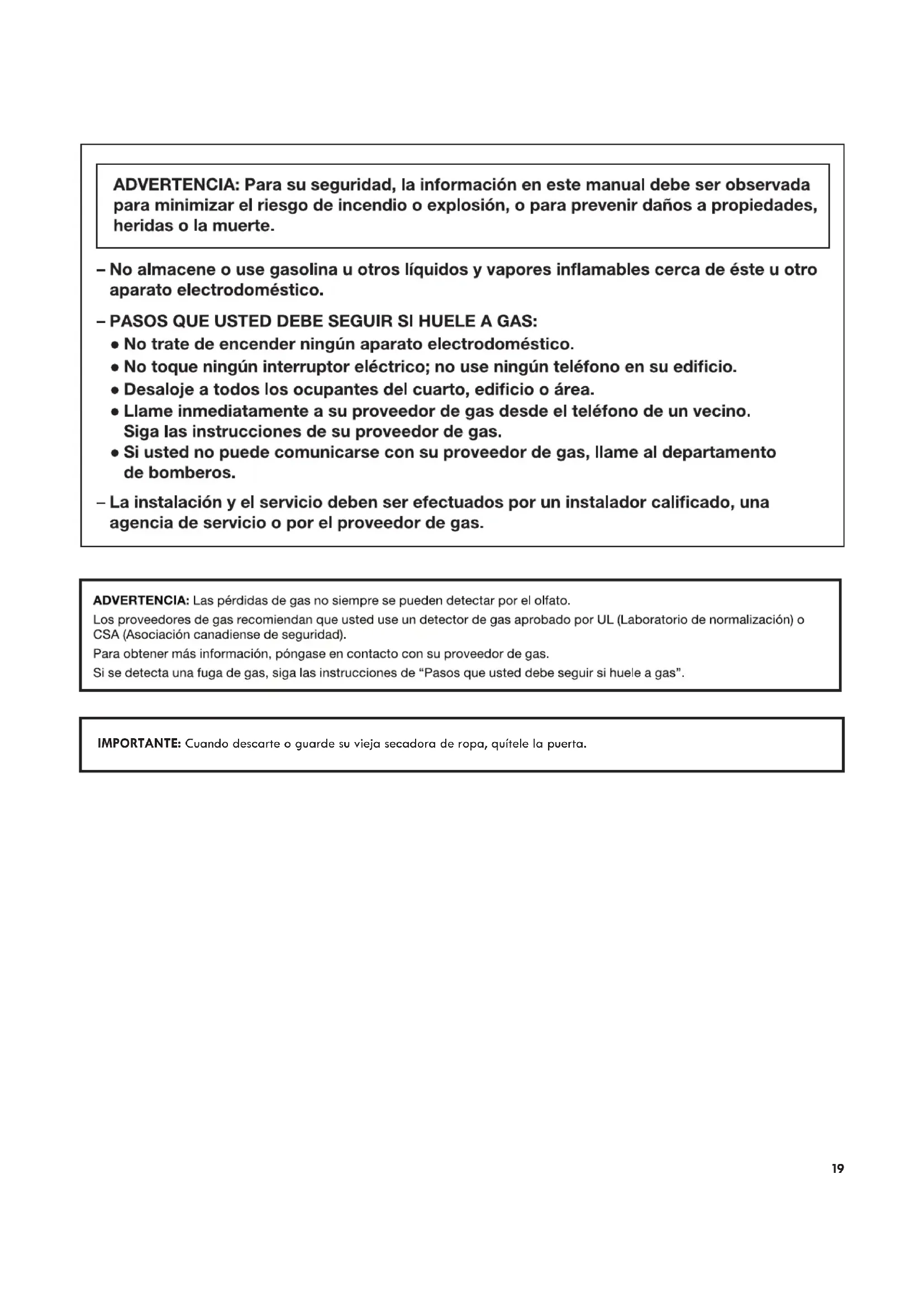 ADVERTENCIA Peligro de Choque Eléctrico Desconecte el suministro de energía antes de darle mantenimiento. Vuelva a colocar todos los componentes y paneles antes de hacerlo funcionar. No seguir estas instrucciones puede ocasionar la muerte o choque eléctrico. Cuidado para las vacaciones, el almacenaje o en caso de mudanza Modelos con vapor únicamente: Instale y guarde su secadora en un lugar donde no se congele. Debido a que queda un poco de agua en las mangueras, el congelamiento de la misma podría dañar su secadora. Si va a guardar o trasladar su secadora durante una temporada de invierno riguroso, acondiciónela para el invierno. Cuidado durante la falta de uso o el almacenamiento Ponga la secadora a funcionar sólo cuando esté en casa. Si va a salir de vacaciones o no va a usar su secadora por un tiempo prolongado, usted deberá: