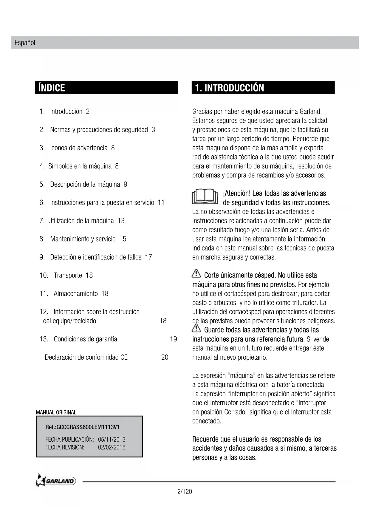 Gracias por haber elegido estaquina Garland. Estamos seguros de queusted appreciará la calidad y prestaciones de estaquina,que le fácilar su tarea por un长大o periodo de tiempo.Recuerde que estaquina dispone de la mas amplia y experta red de asistencia技术水平a la queusted peutecaudir para elmantimiento de suquina, resolución de problemas y comprade recambios y/o accesorios.