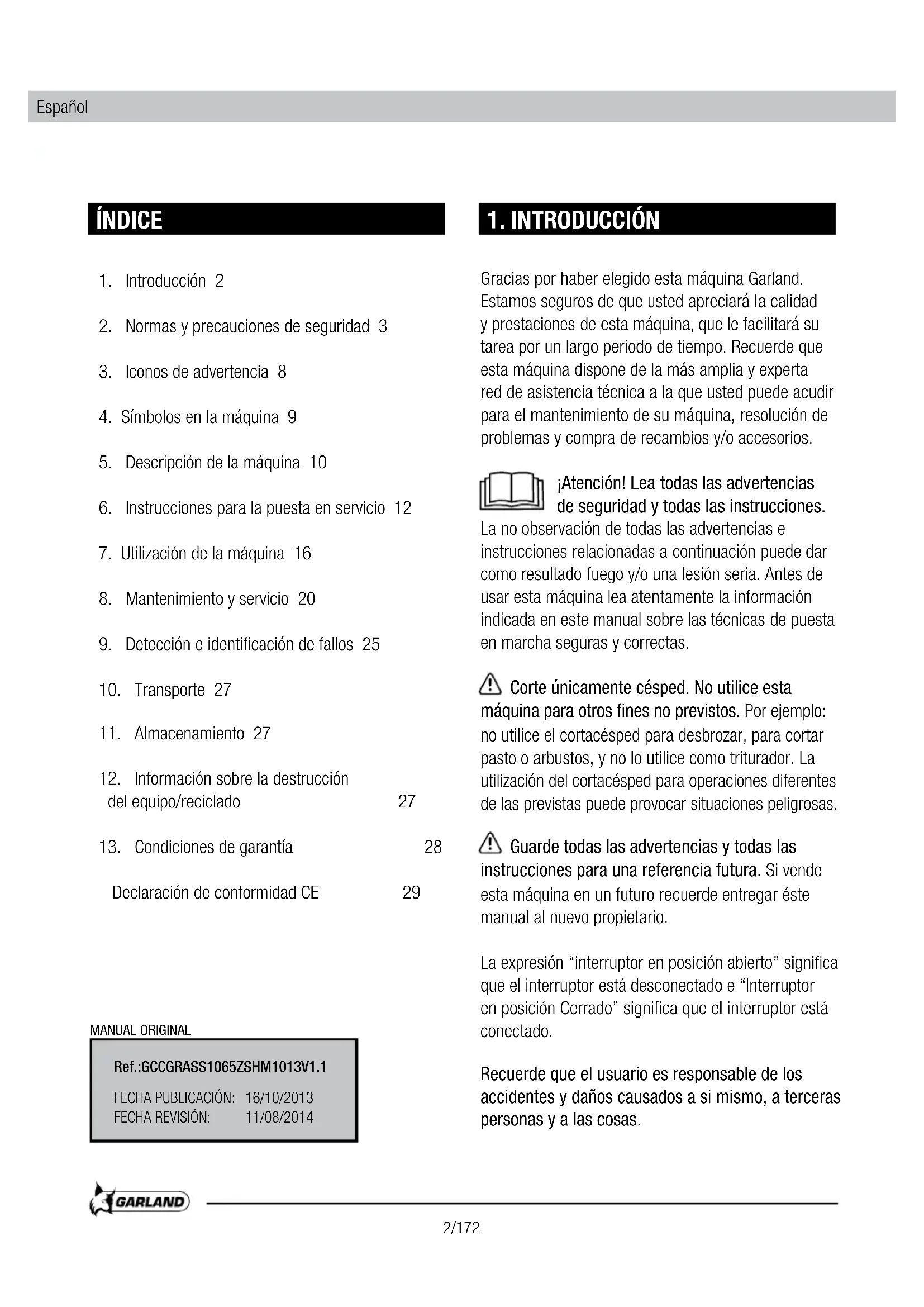 Gracias por haber elegido estaquina Garland. Estamos seguros de queusted appreciará la calidad y prestaciones de estaquina,que le fácilar su tarea por un长大o periodo de tiempo.Recuerde que estaquina dispone de la mas amplia y experta red de asistencia技术水平a la queusted peutecaudir para elmantimiento de suquina, resolución de problemas y comprade recambios y/o accesorios.